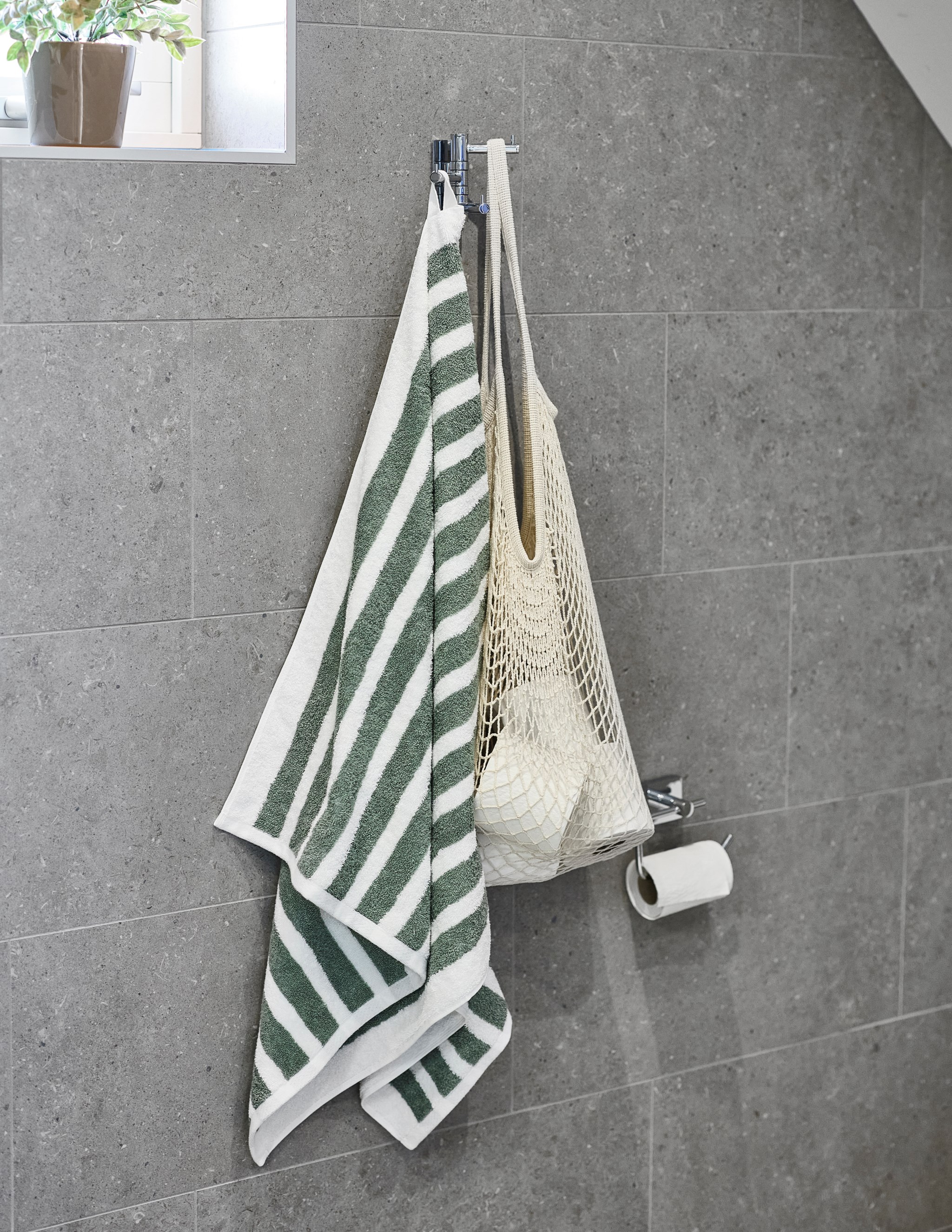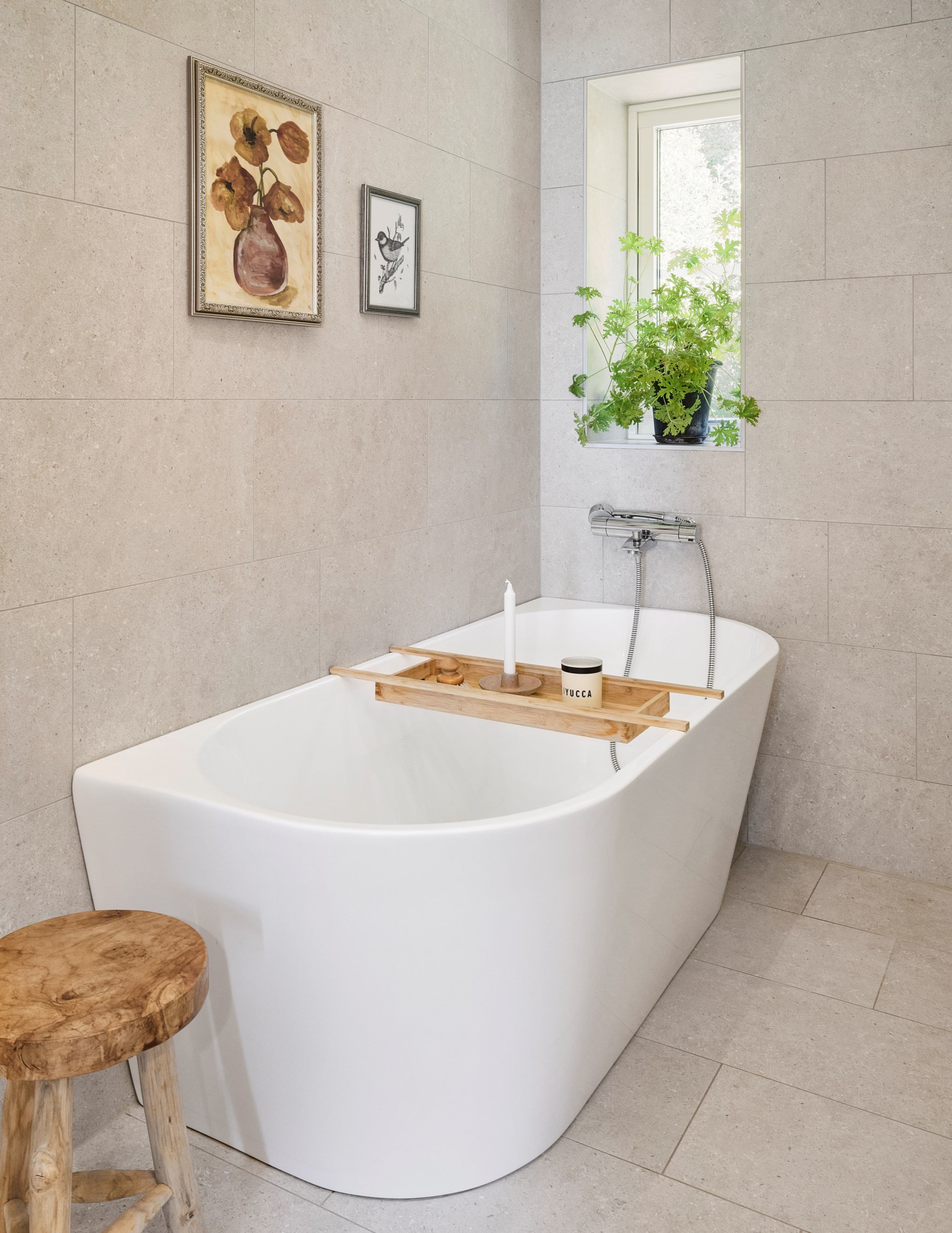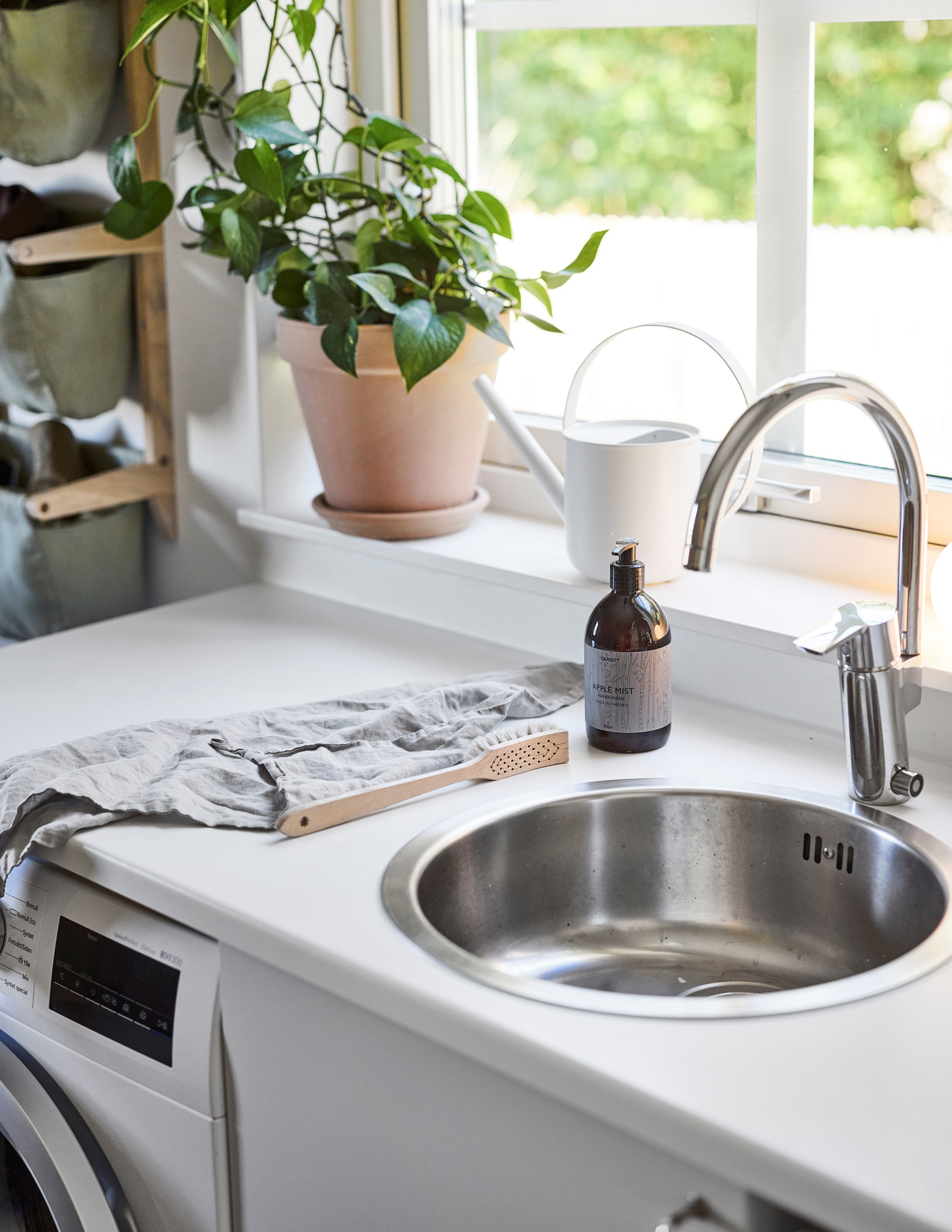 Nuvarande ägare gjorde en del bra ändringar i Myresjöhus tänkta planlösning. Den stora groventrén med tvättstugan och massor bra förvaring är en sån. Bor man på landet kommer det bli lite blötare, lite snöigare och lite gräsigare. Det här blir din ingång till vardags, med hundar och barn, matkassar och träningsväskor. Såklart samma klinker här som i finhallen och i badrummet nere – enhetligt är alltid bäst och snyggast.