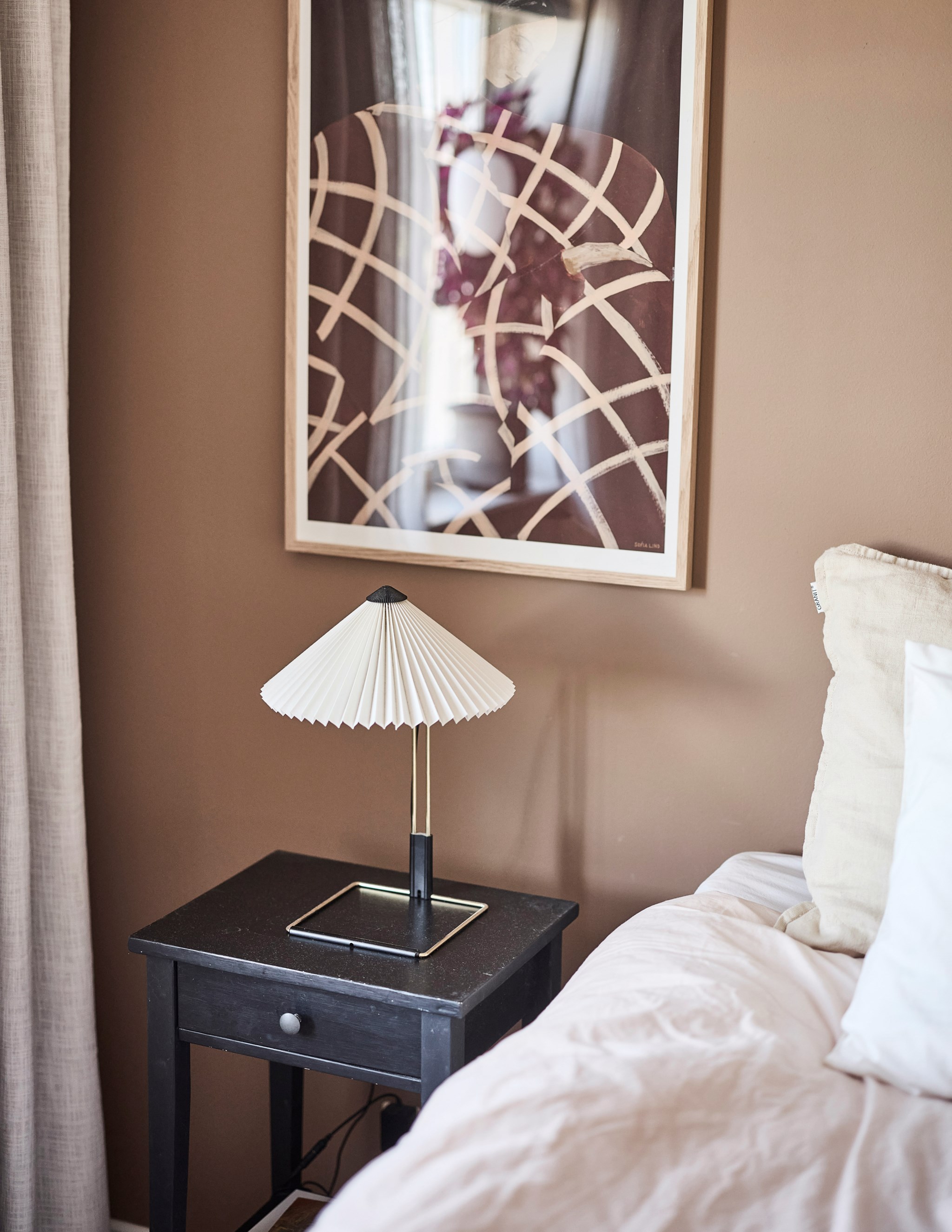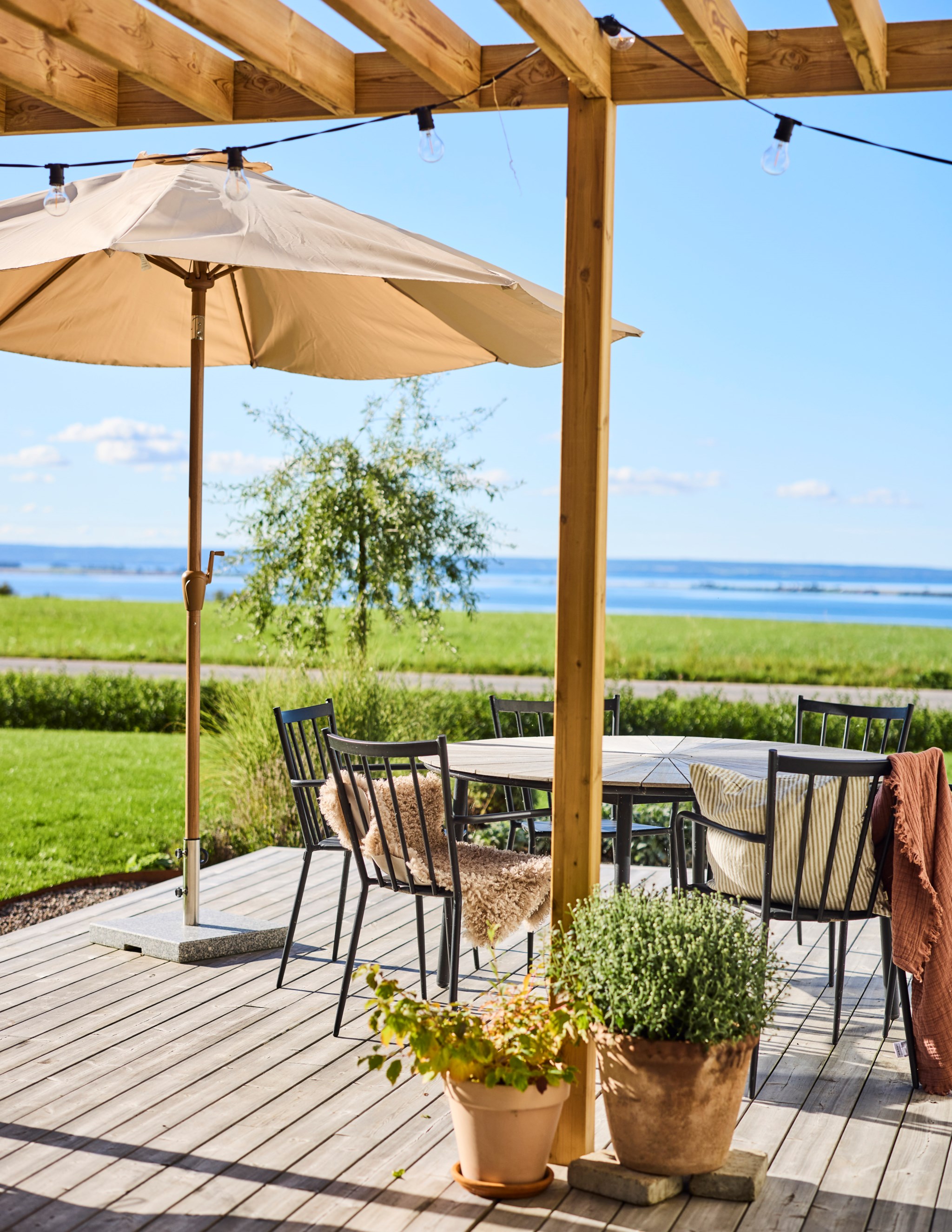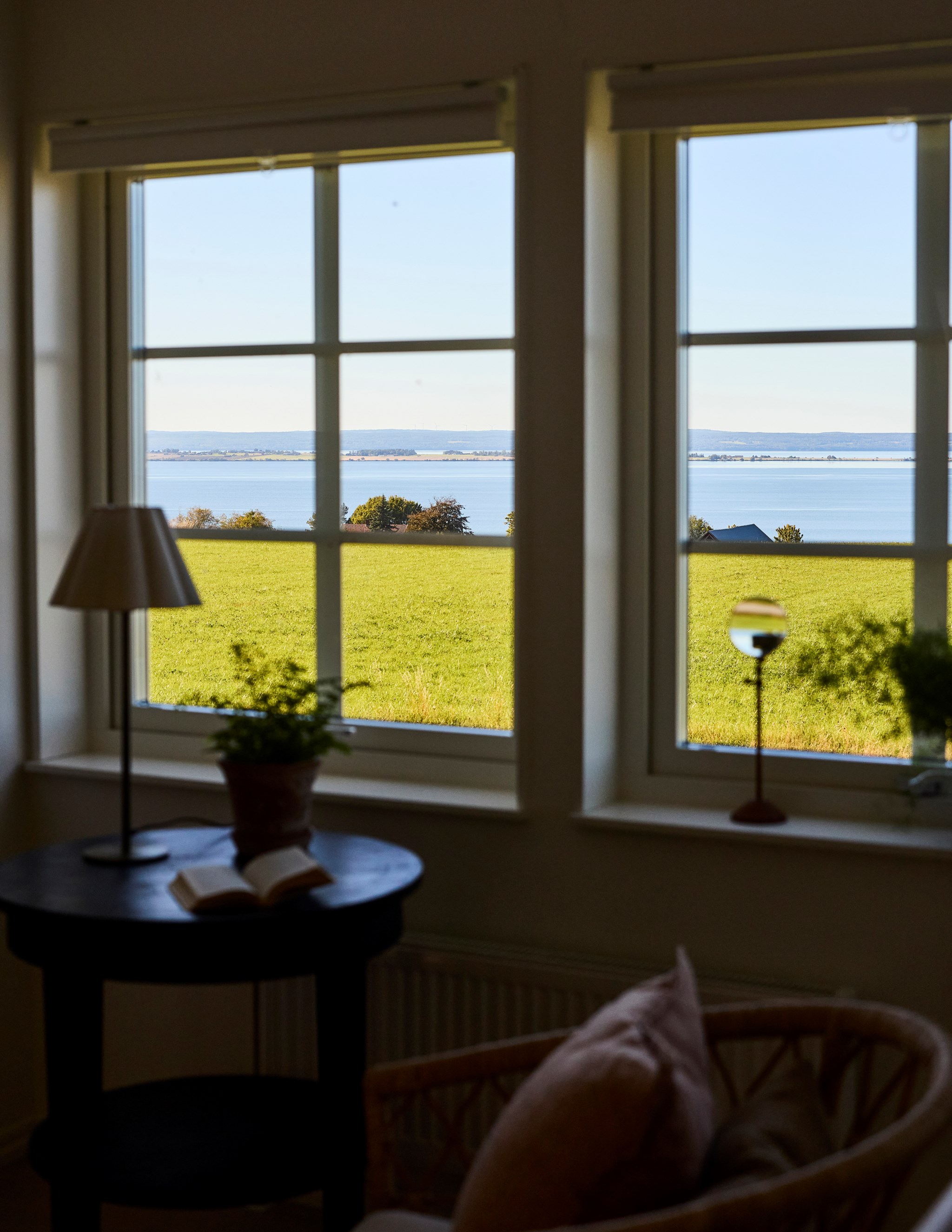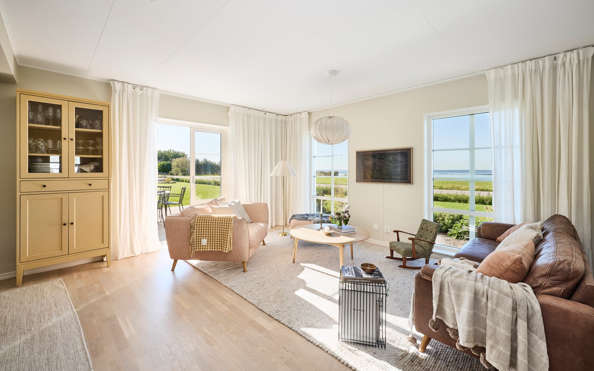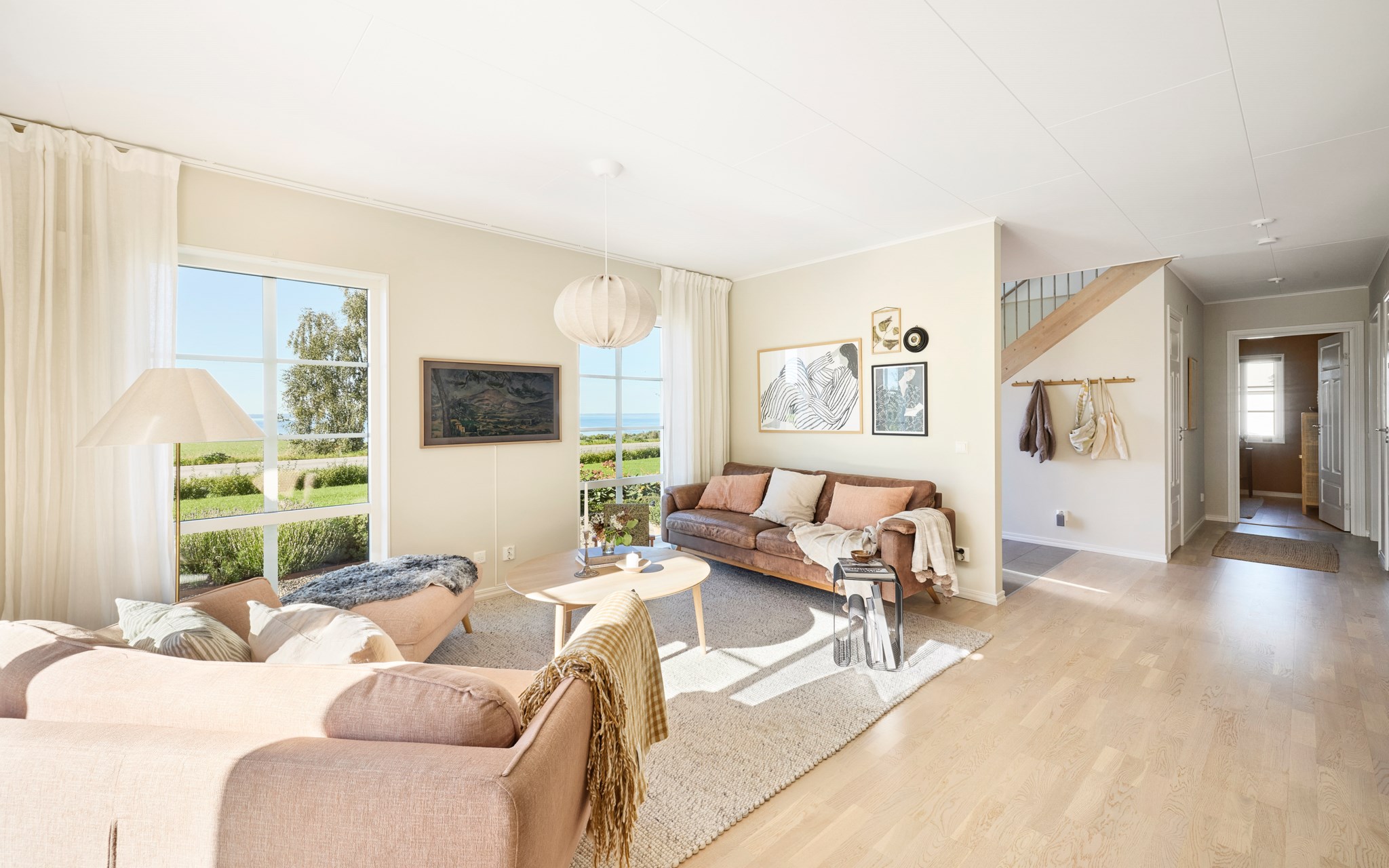 Vardagsrummet är samma ljusa upplevelse som kök och matplats, här hänger alltihop på ett fint sätt. Utsikten massiv även om du lägger dig ner i soffan; höga vackra fönster med spröjs rätt ut över himmel, fält och Vättern. Mot trädgården på södra gaveln samma ljusinsläpp men som du ser på bilderna så är det två öppningsbara dörrar här. Uteplats och pergola precis utanför. Nuvarande ägare påstår att solnedgångarna just på hösten är de mest dramatiska, du får komma ut och kolla om det stämmer.