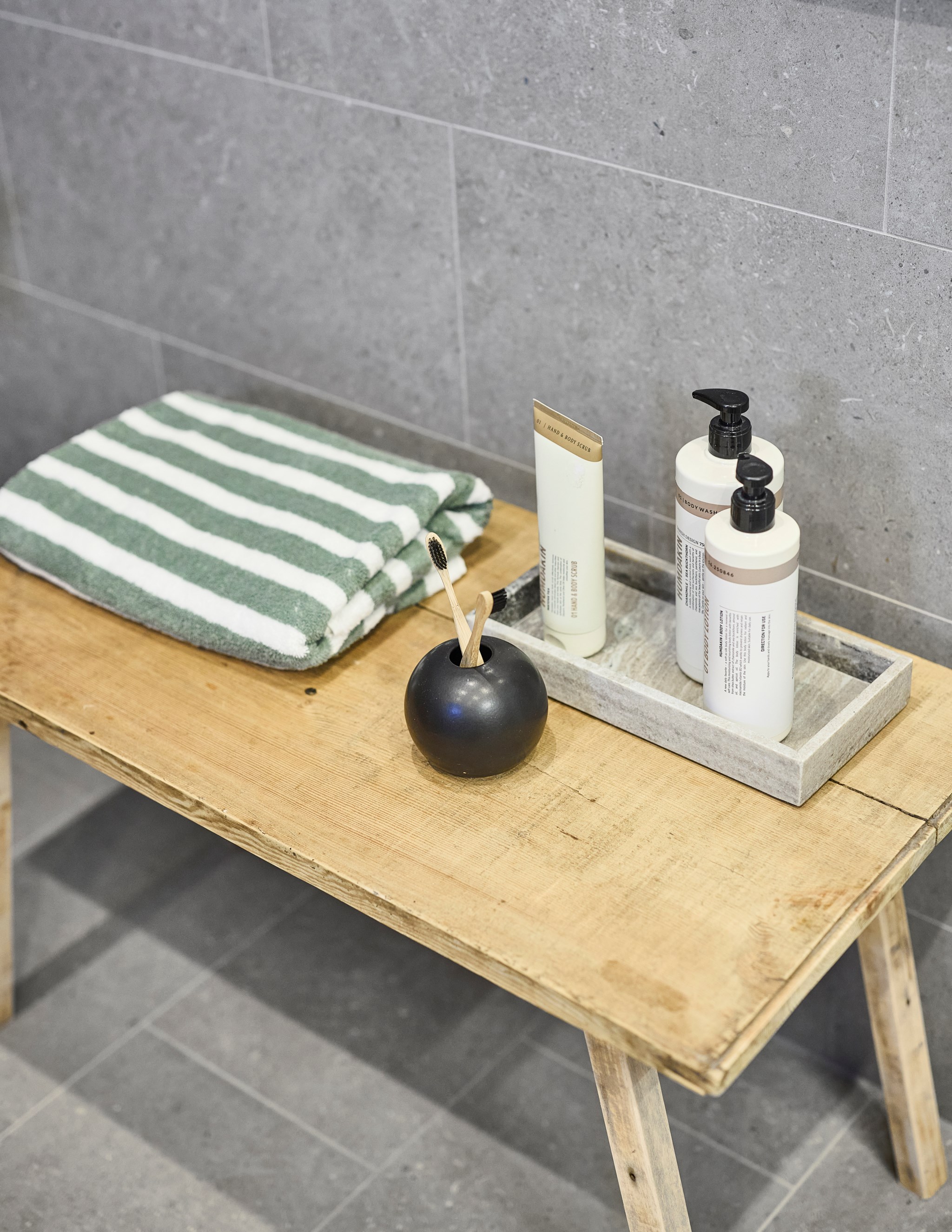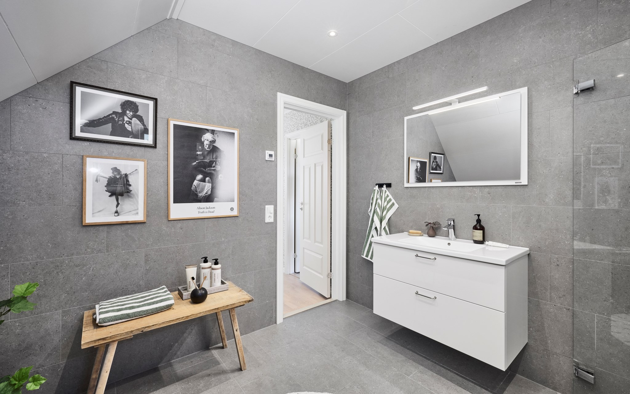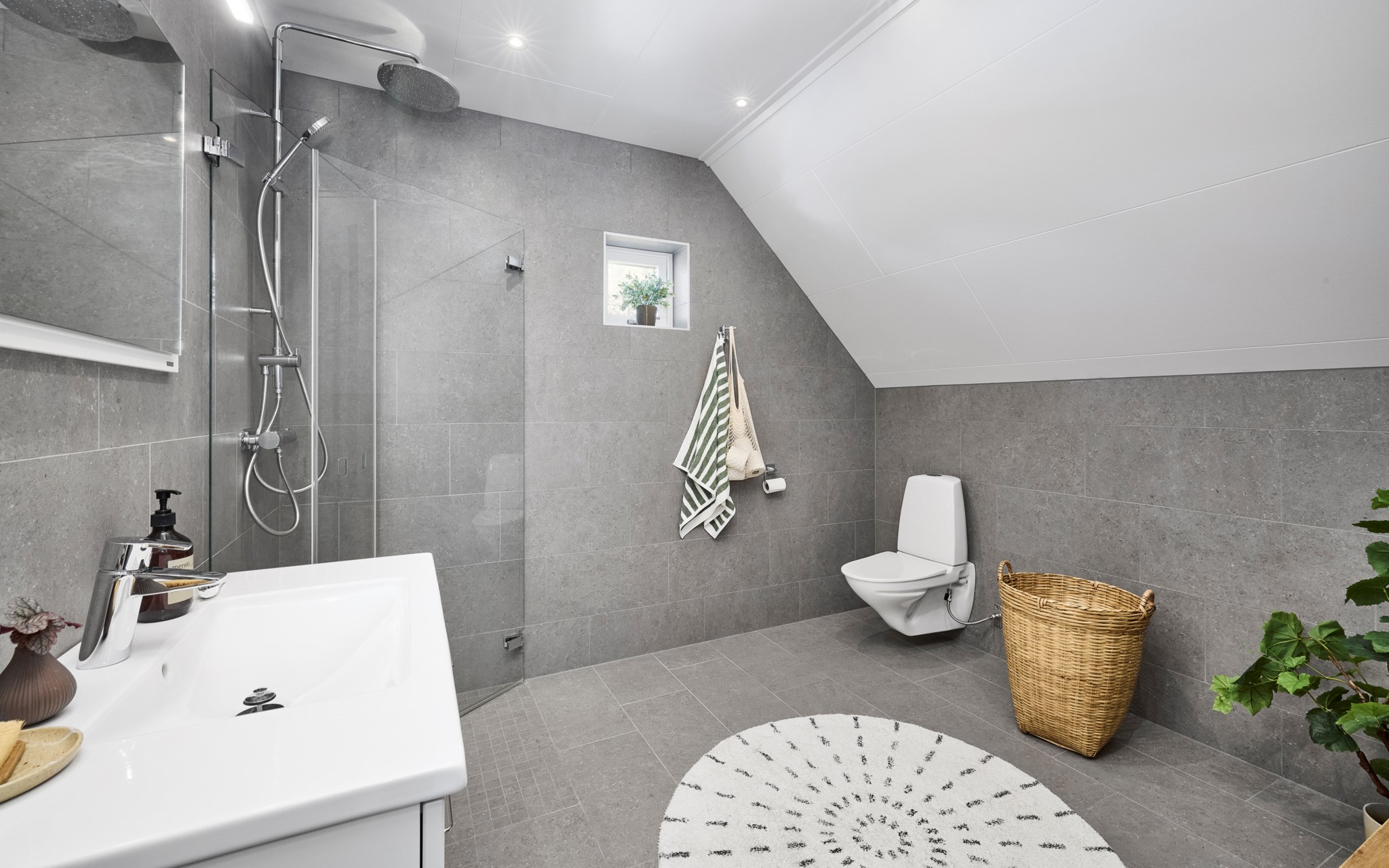 Klinkern du satte fötterna på i hallen, återkommer både i tvättstugan och badrummet nere. Den inte bara ser varm ut, den är varm också, tack vare golvvärmen. Här nere kan du både bada och duscha om du vill, fönstret mot berget på baksidan. Badrummet uppe får del av ovanvåningens snedtak på ett fint sätt, utan att inskränka på din rörelsefrihet nämnvärt. Samma typ av klinker som nere, men i en lite mörkare nyans. Ytan väl tilltagen, kanske är arkitektens tanke att man ska kunna ha ett badkar här uppe också, men än så länge bara dusch. Fönster mot norr, men fin utsikt även däråt.