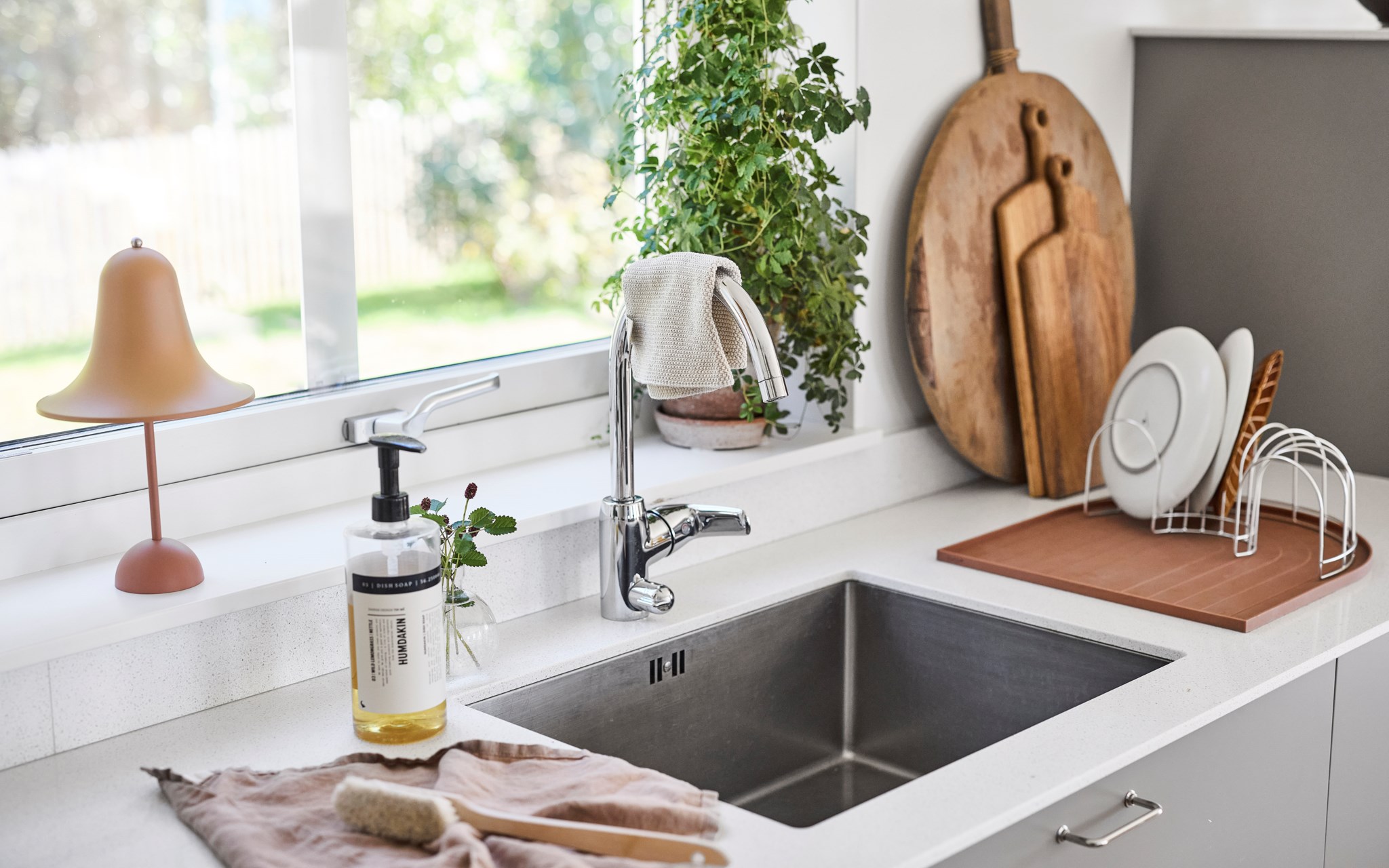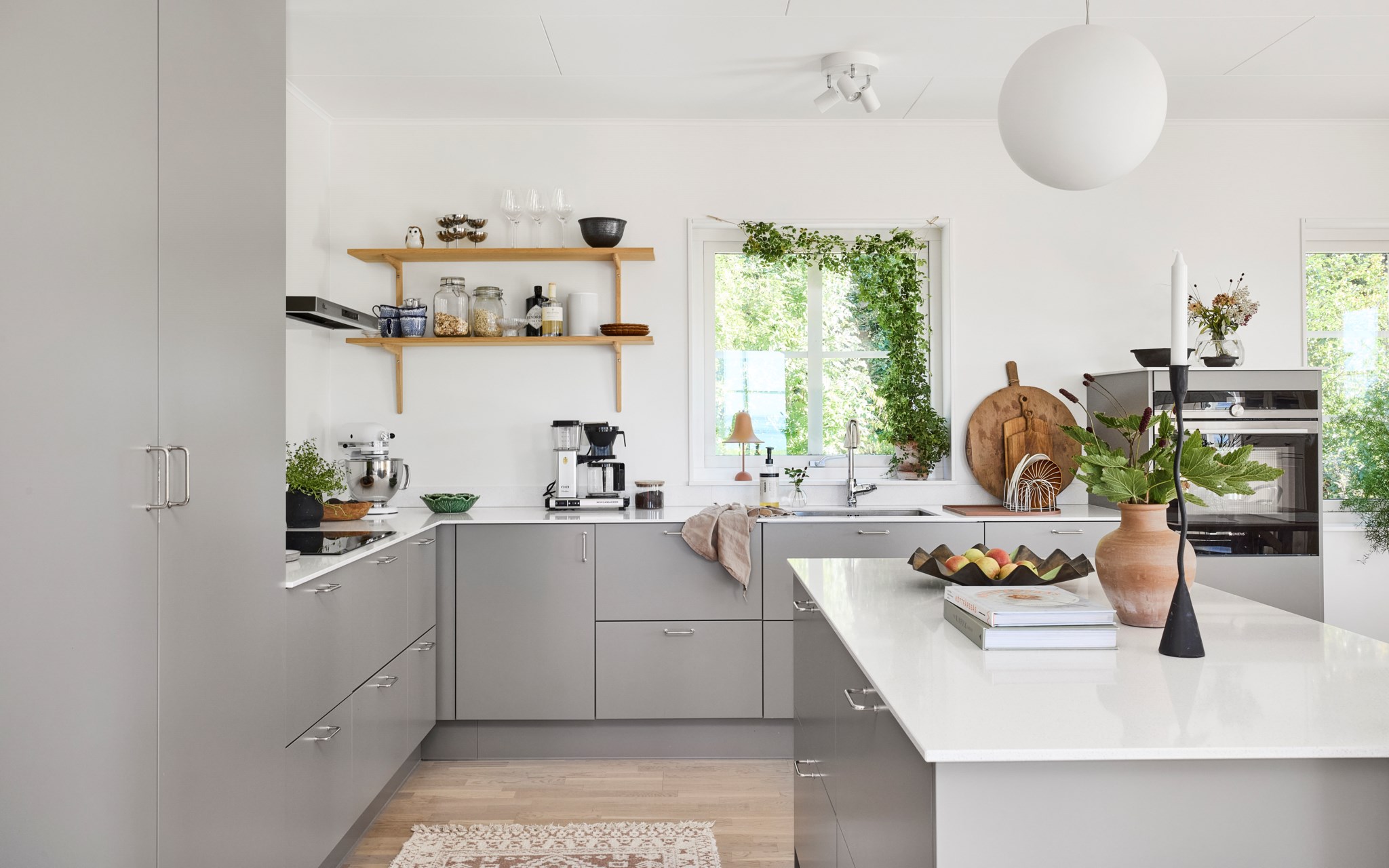 Det smakfulla och välplanerade köket kommer från HTH. Det är utrustat med kyl och frys i fullhöjd, induktionshäll, spisfläkt, ugn i arbetshöjd samt integrerad diskmaskin. Samtliga vitvaror från det välkända varumärket Siemens, med undantag för spisfläkten som är av märket Thermex.