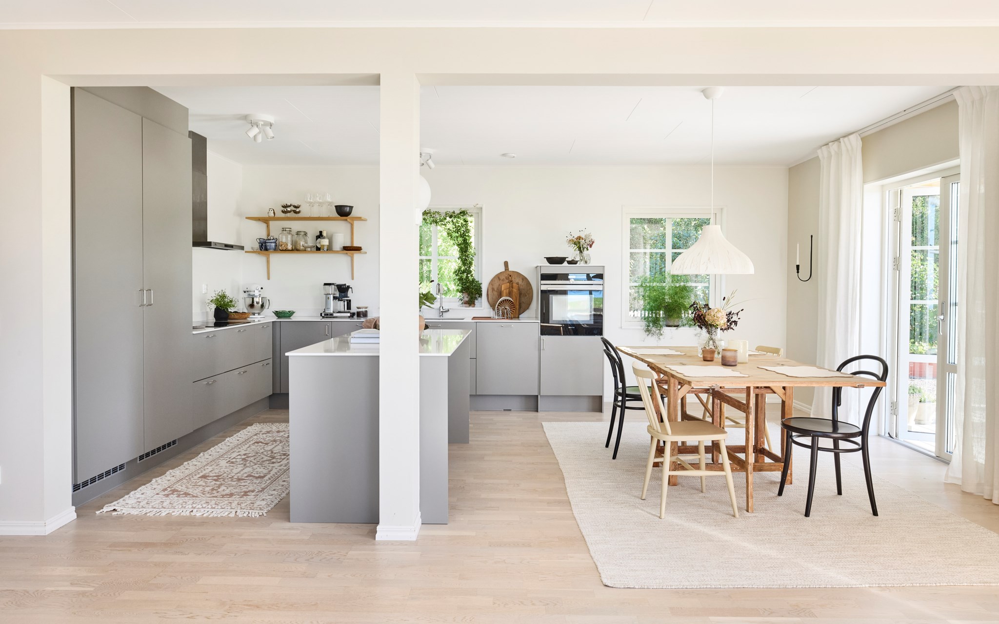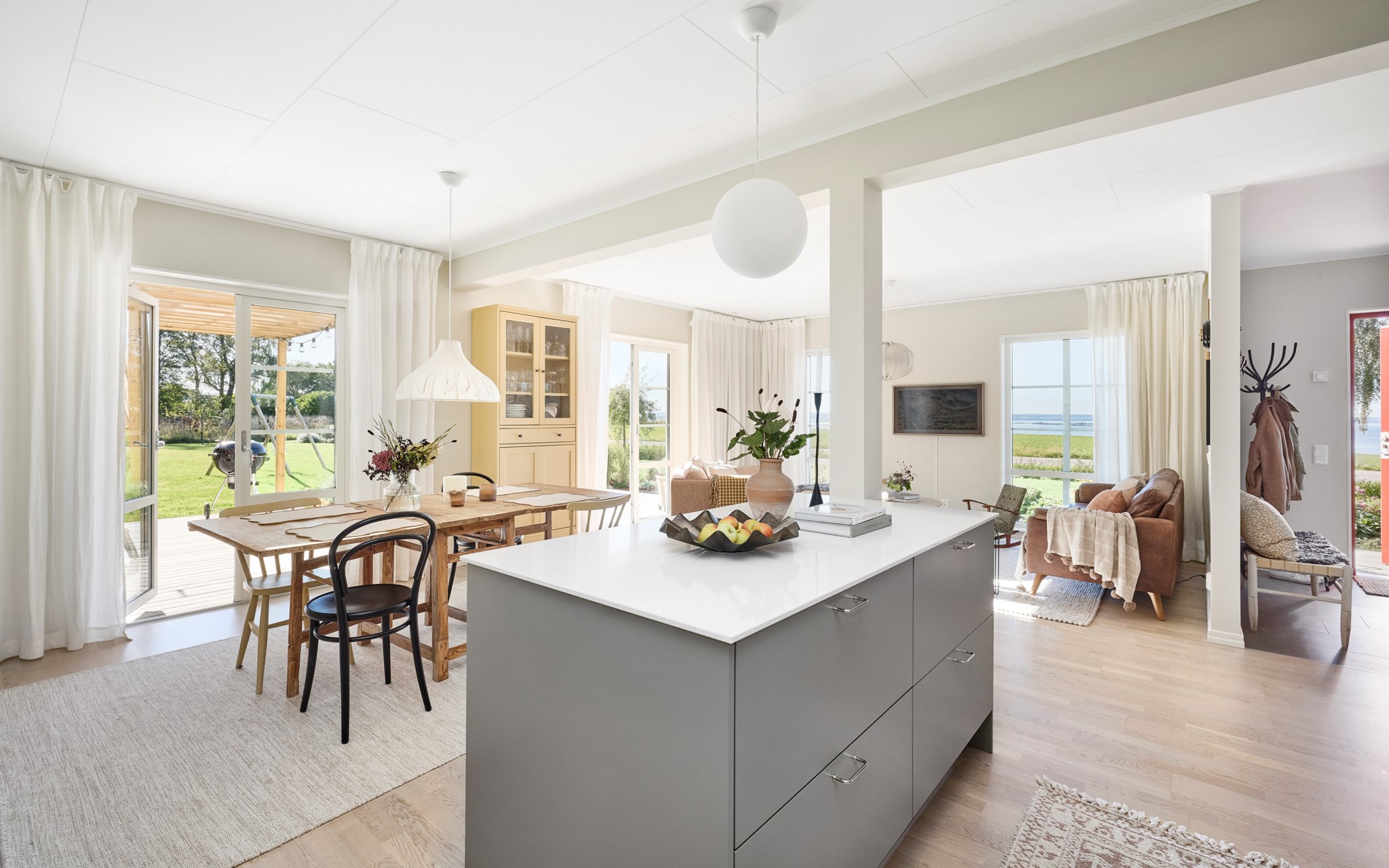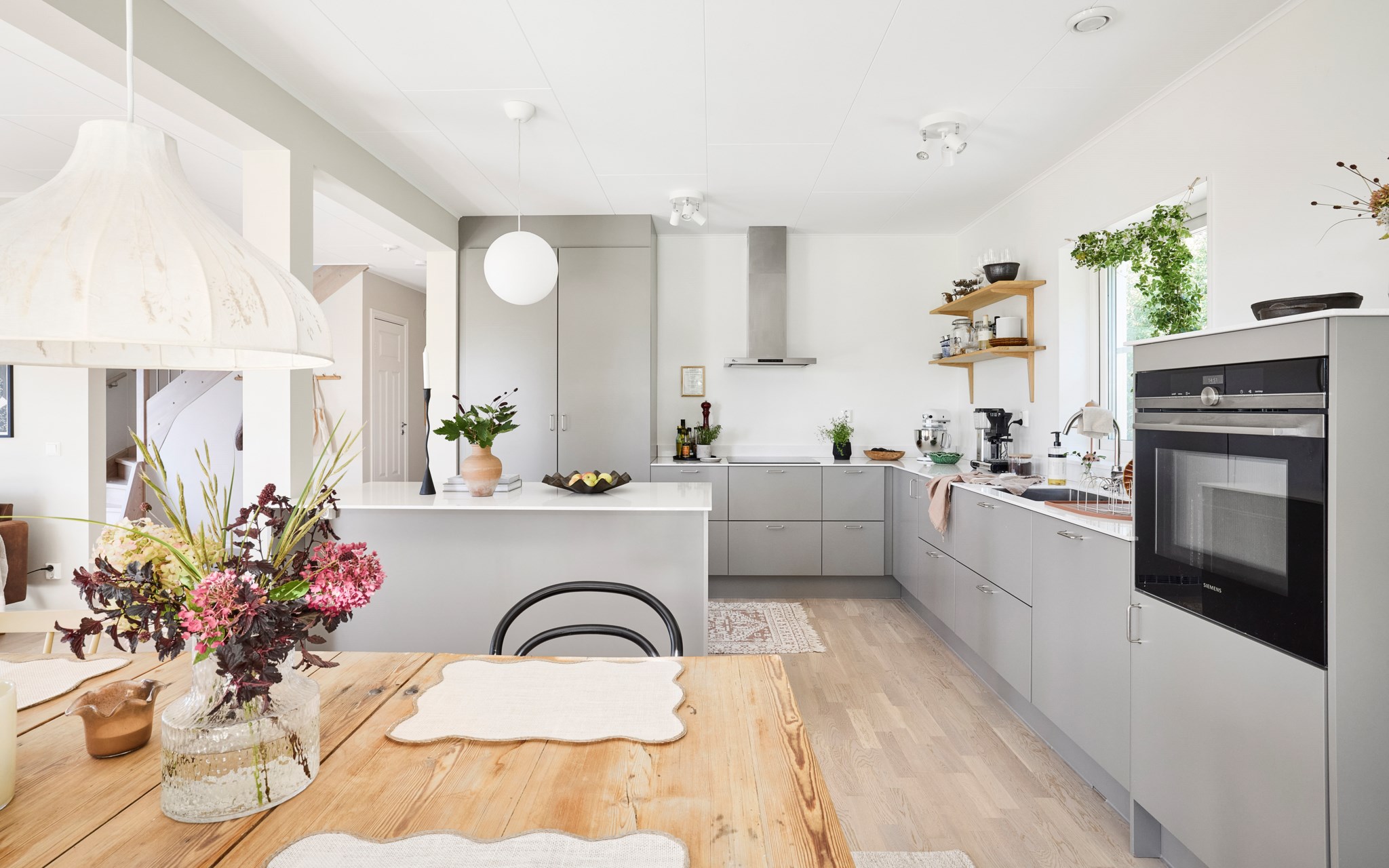 Hela den sociala ytan nere är en enda solig och ljus upplevelse, spröjsade fönster och dörrar i tre väderstreck. Och detta gäller såklart köket också med både ö och bänkskivor i vinkel. Luftigt och diskret planerat med luckor och lådor, mest lådor dock. Bänkskiva i stenkomposit. Köket kommer annars från HTH med diskreta funkis-byglar som gör att du inte klabbar för mycket när du öppnar, förhoppningsvis inte barnen heller. Samma ljusa och kvistfria ekgolv över hela ytan här nere. Matbordet kan vara både stort och långt om du vill. Fönstret mot baksidan är som en tavla, lite annorlunda varje dag.