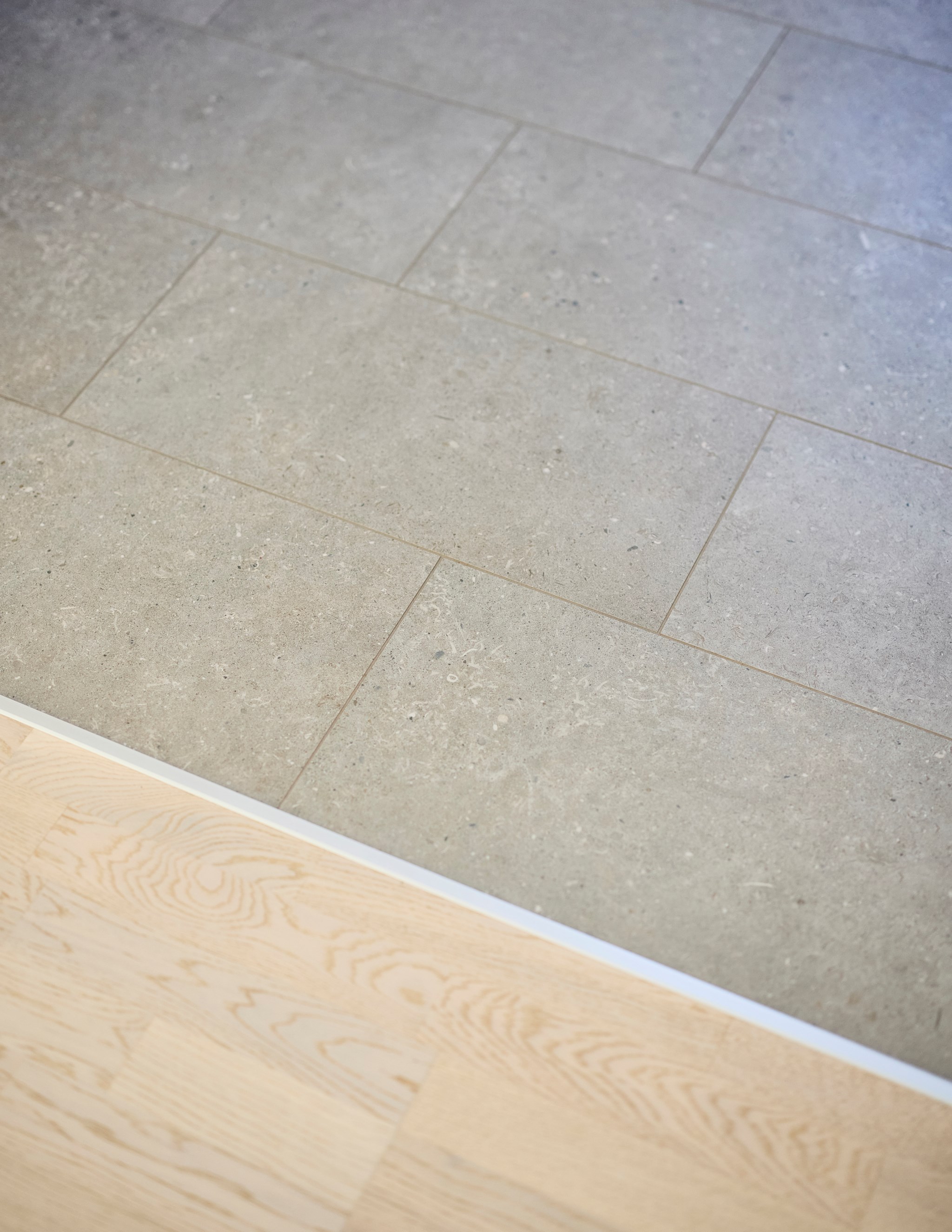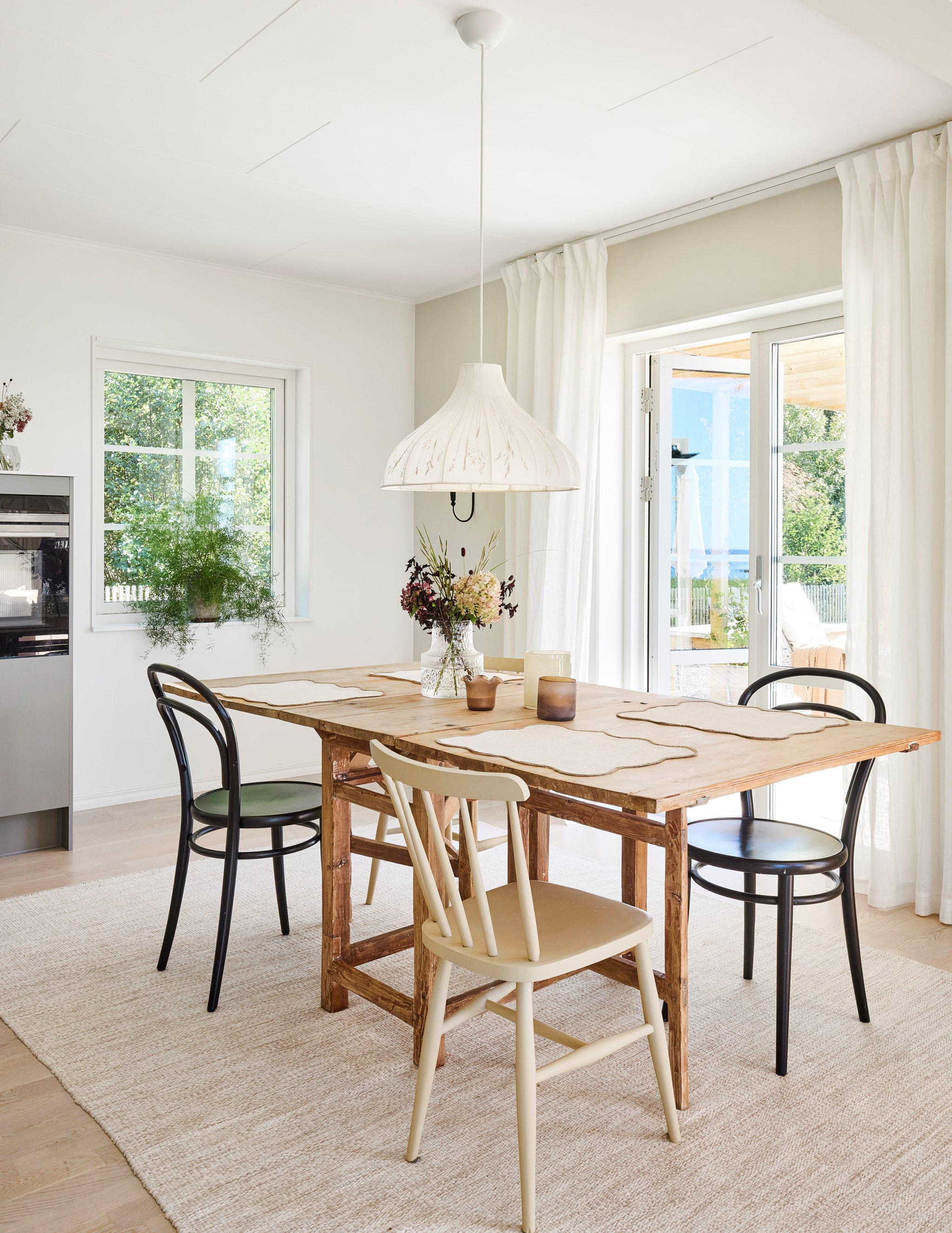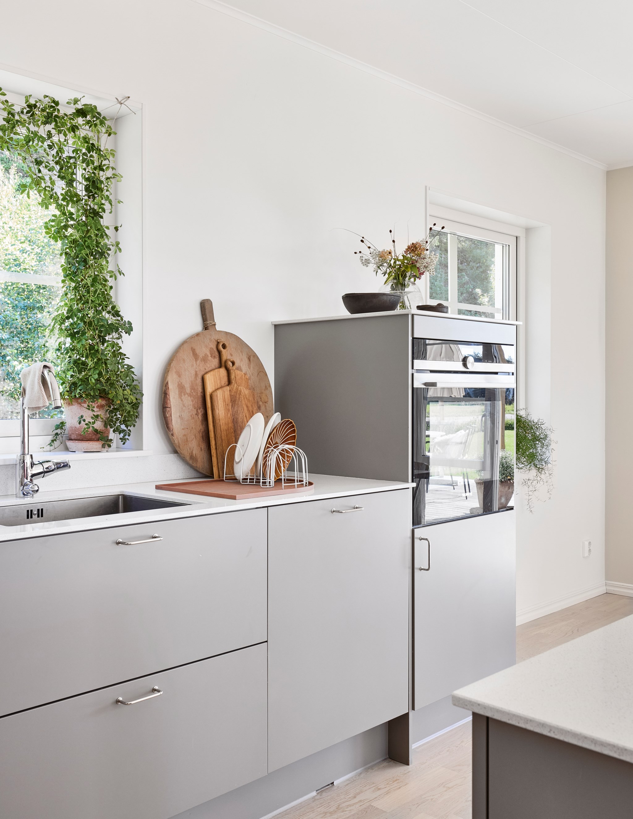 Hela den sociala ytan nere är en enda solig och ljus upplevelse, spröjsade fönster och dörrar i tre väderstreck. Och detta gäller såklart köket också med både ö och bänkskivor i vinkel. Luftigt och diskret planerat med luckor och lådor, mest lådor dock. Bänkskiva i stenkomposit. Köket kommer annars från HTH med diskreta funkis-byglar som gör att du inte klabbar för mycket när du öppnar, förhoppningsvis inte barnen heller. Samma ljusa och kvistfria ekgolv över hela ytan här nere. Matbordet kan vara både stort och långt om du vill. Fönstret mot baksidan är som en tavla, lite annorlunda varje dag.