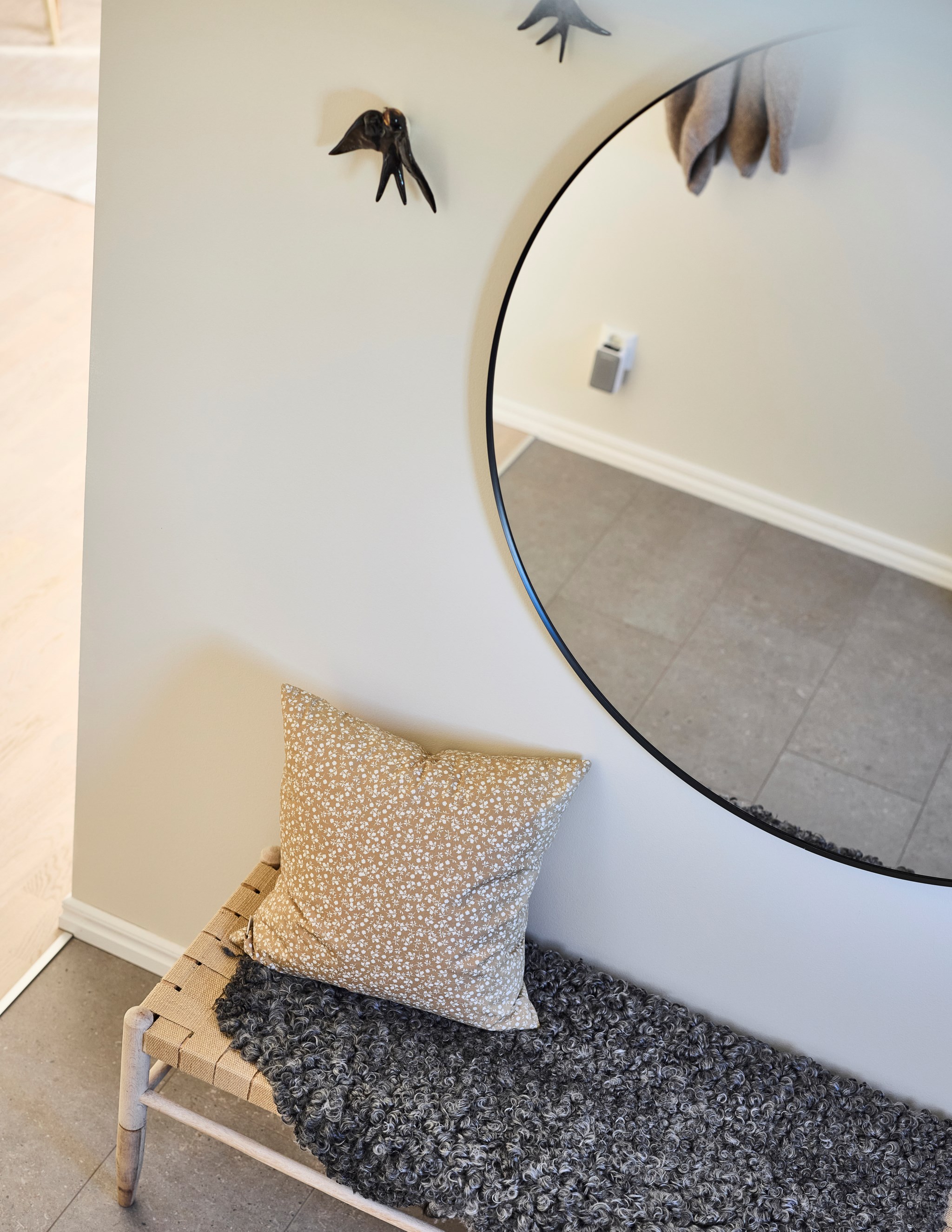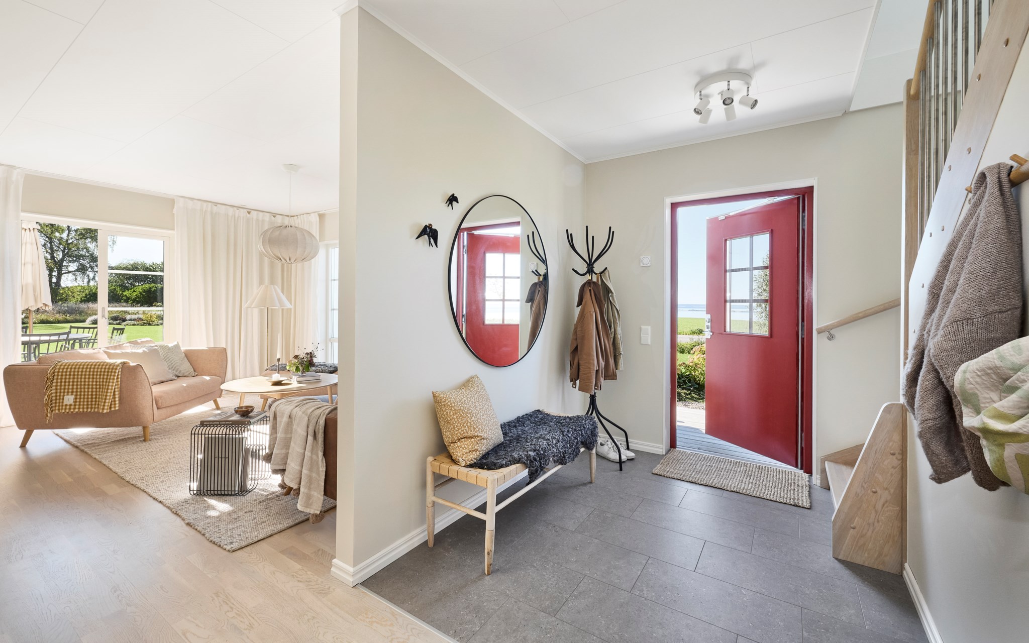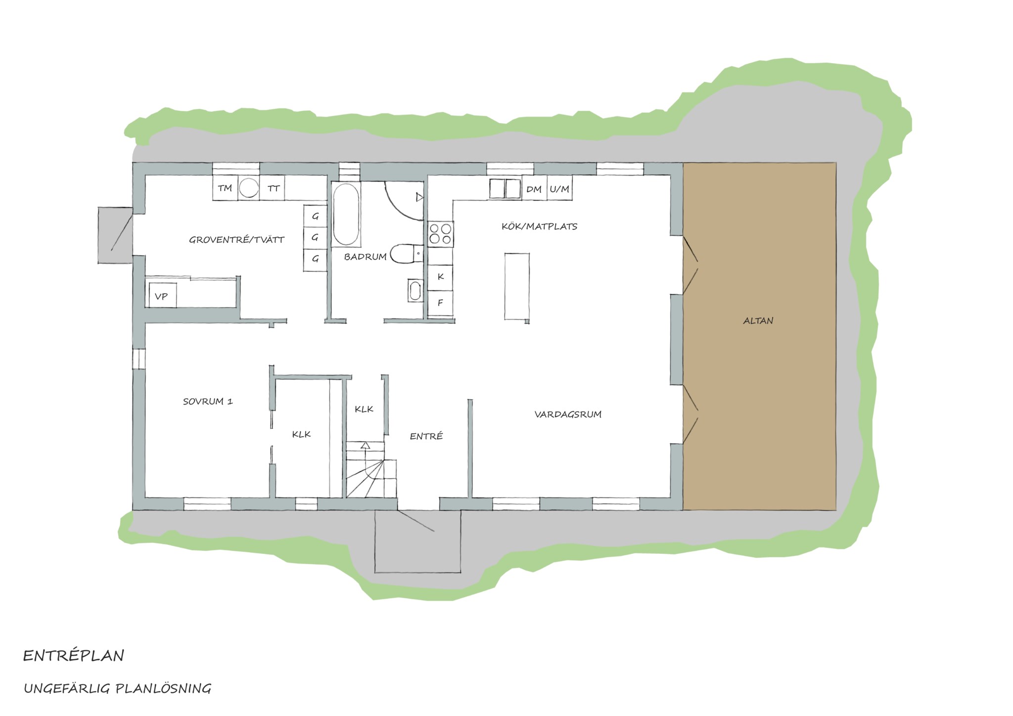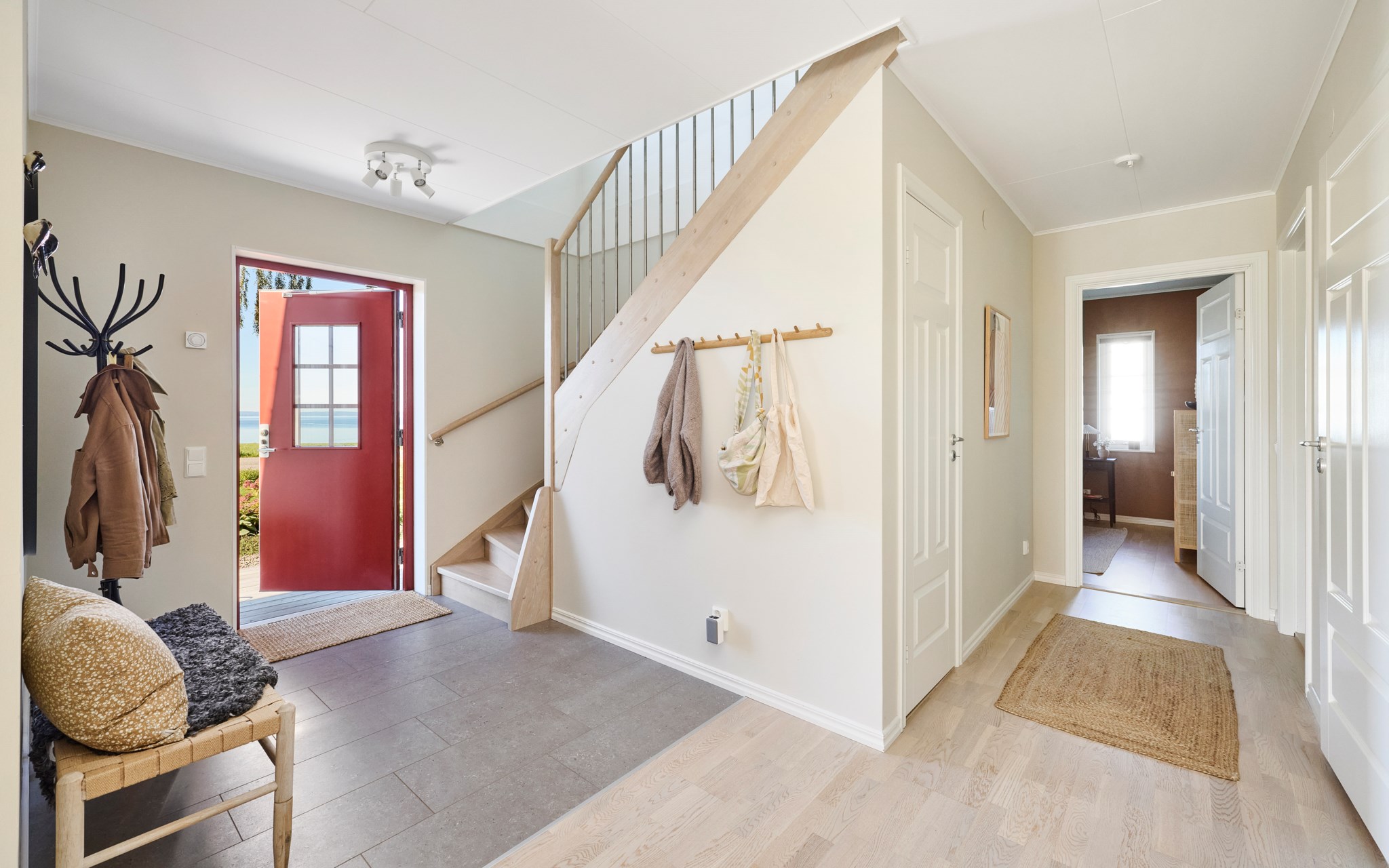 Entré mitt på huset med frasande grus under fötterna utanför. Stor yta golvvärmd klinker innanför dörren. Du kommer in mitt i huset, och du behöver bara ta två steg in för att bada i ljus från kök och vardagsrum. Trappan upp snygg dessutom och du har ett högst märkbart ljusflöde därifrån också, särskilt morgon och kväll. Förråd under trappan och tvättstuga smidigt inom räckhåll. Har du varit på expedition utmed Girabäcken så kommer du nog in via groventrén på norrgaveln.
