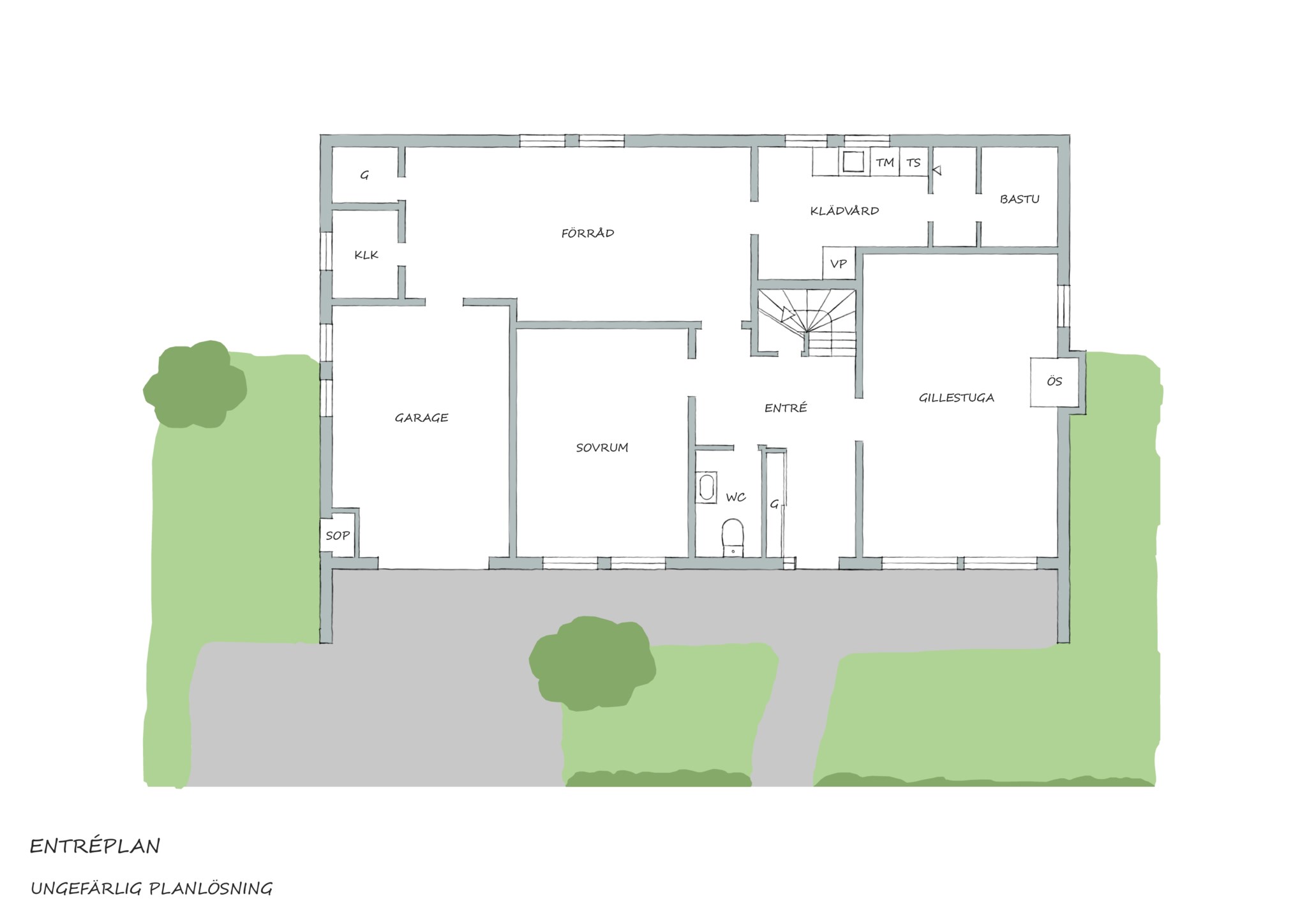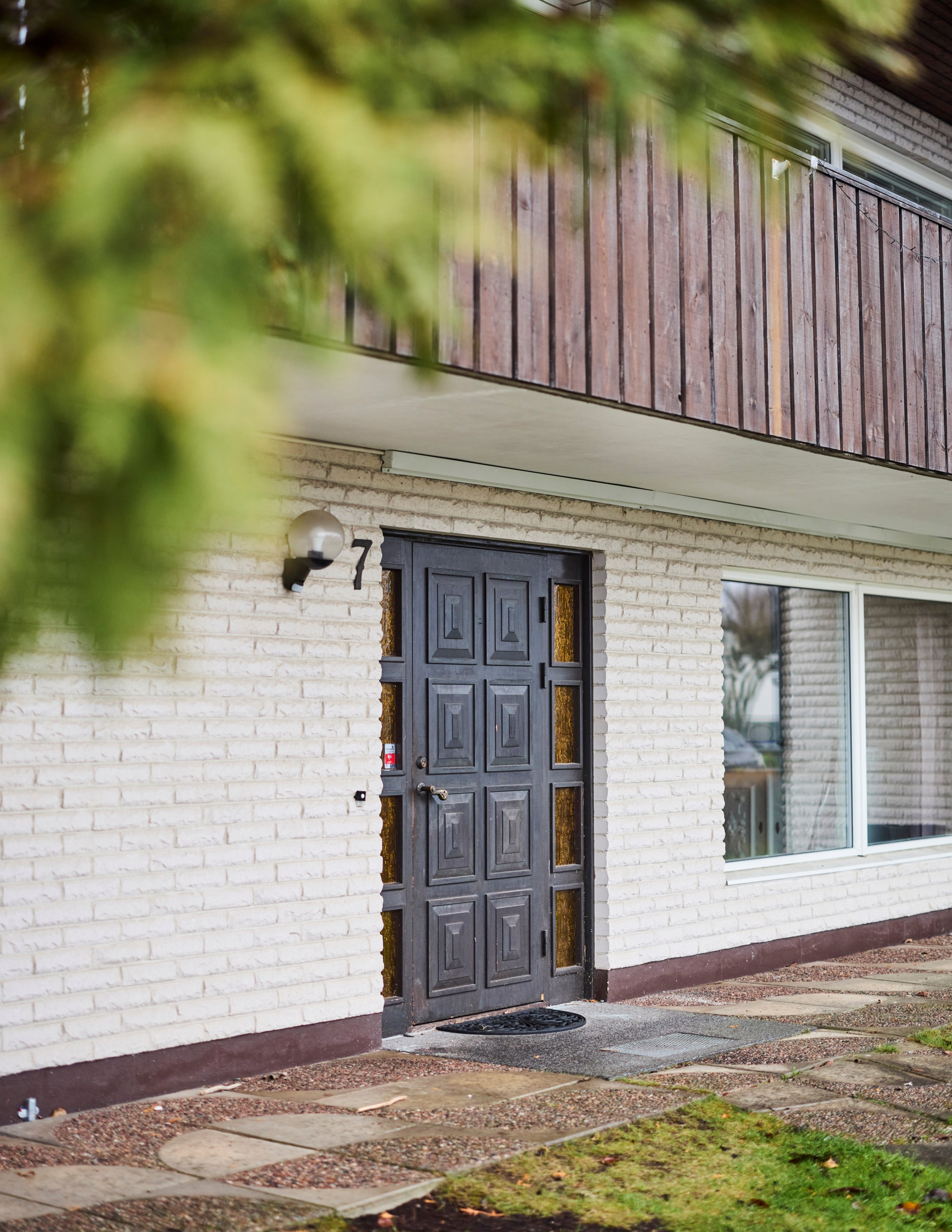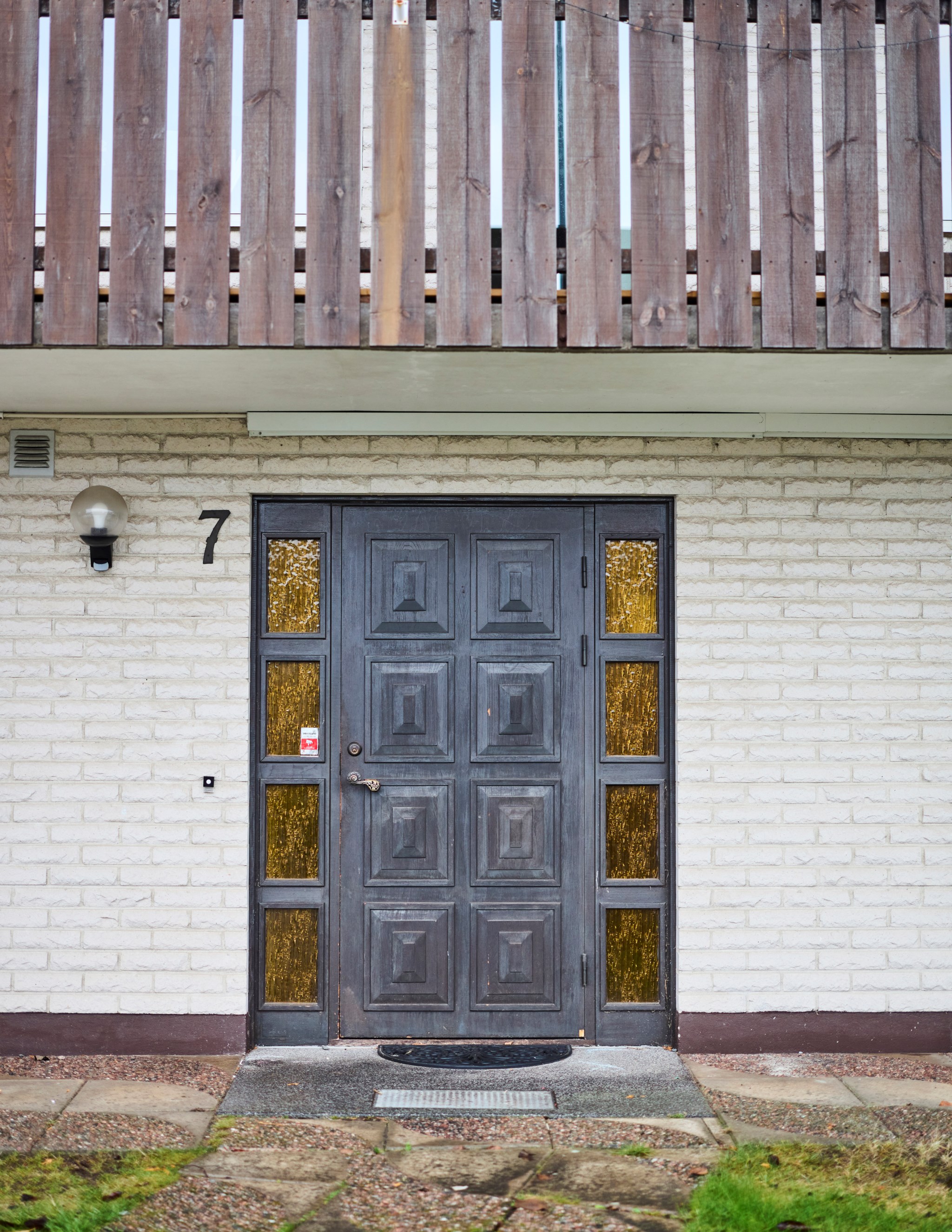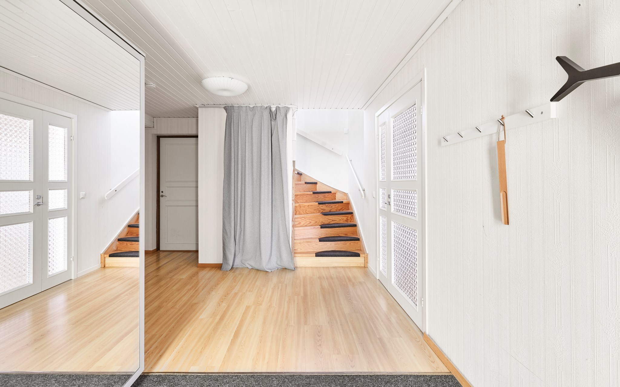 Entré i suterräng med den svarta originaldörren på plats. Eller ska vi kalla det ”port” för även den är härligt dimensionerad med stabila karmar och sidostycken i klarglas på ömse sidor. På golvet ligger det en oöm grå matta som tål alla årstider oavsett vad som följer med in under fötterna på stora och små, två- och fyrbenta. Oavsett storlek kan alla dessutom spegla sig i garderobens helglasade dörrar. Med trappan mitt i huset blir inte bara hallen, utan hela huset väldigt socialt och kommunikativt. Lätt att säga hej och börja prata rätt upp i köket och vardagsrummet.