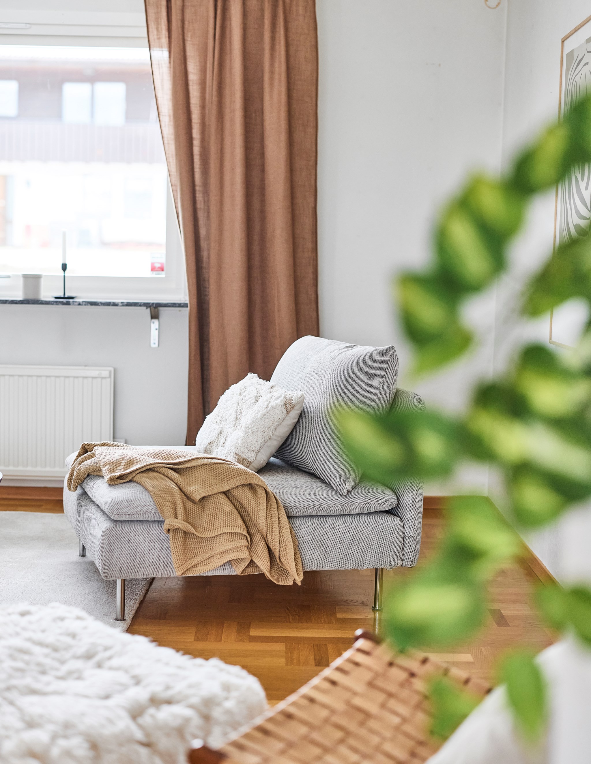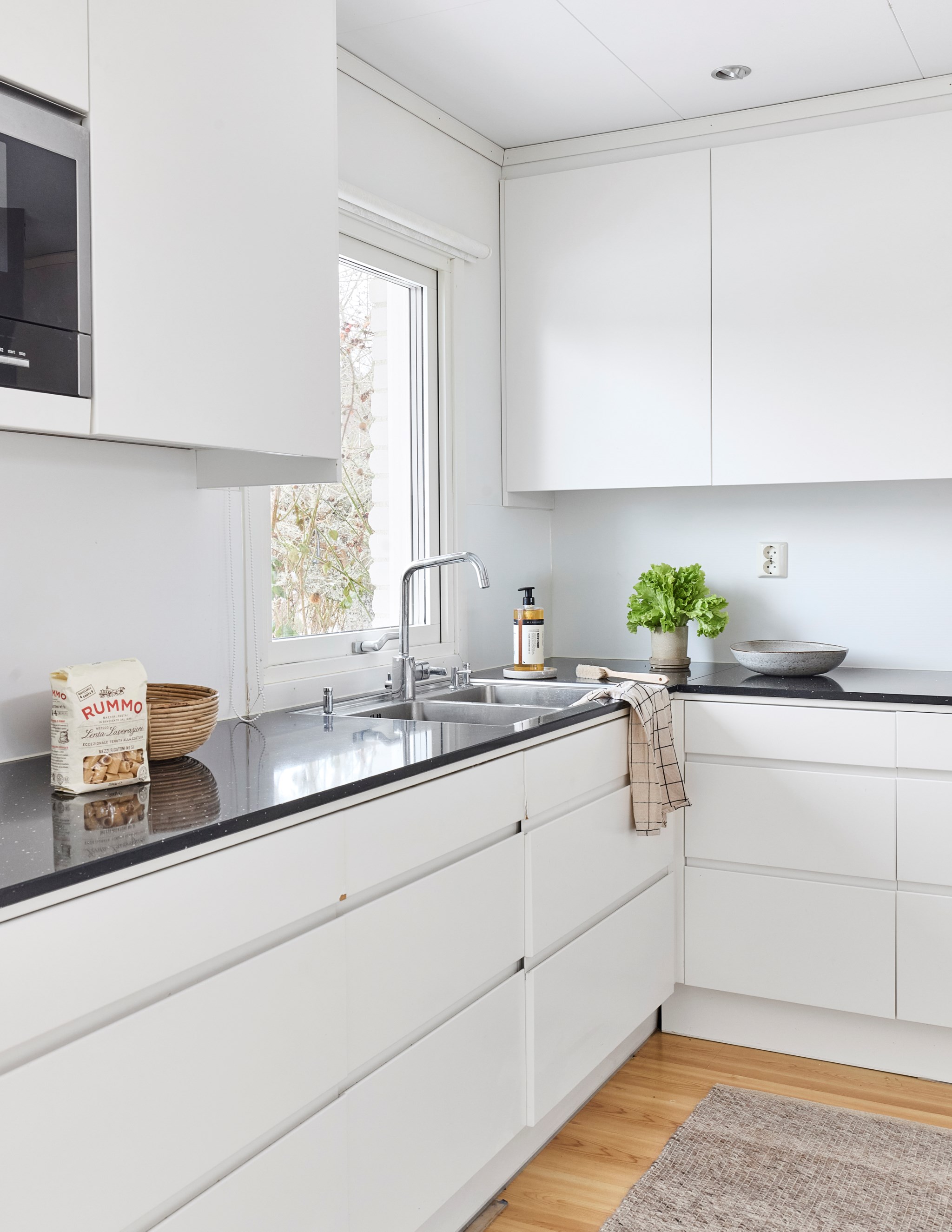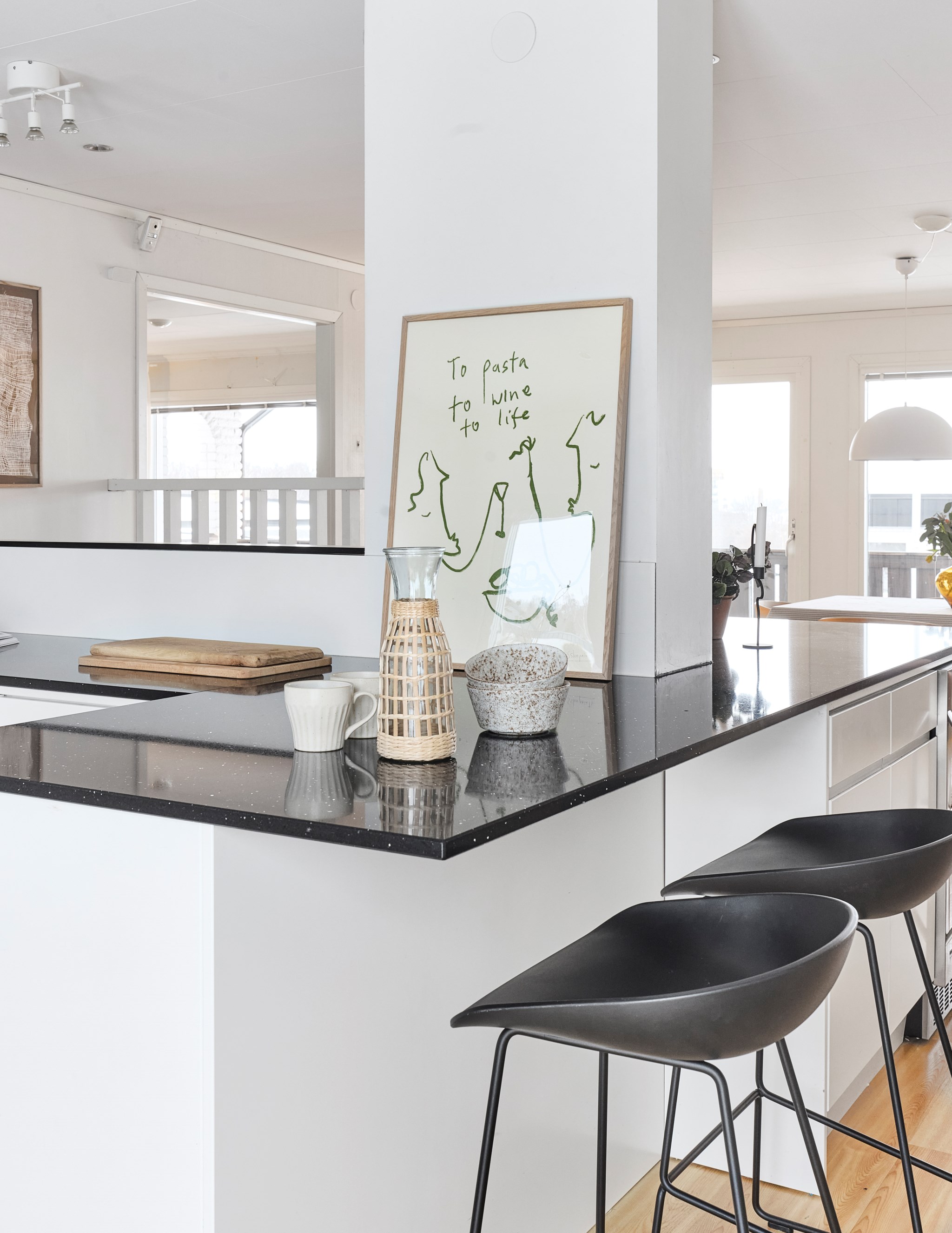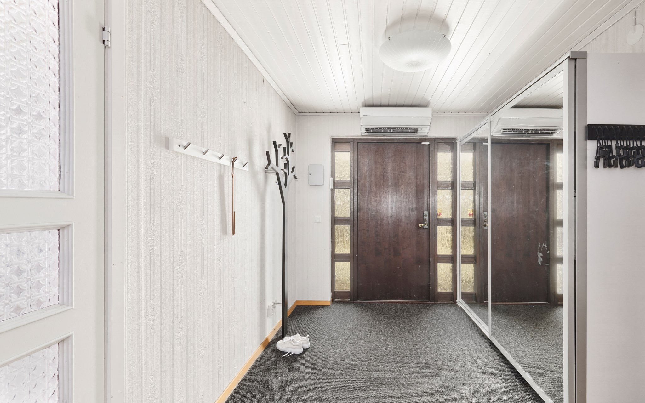 Entré i suterräng med den svarta originaldörren på plats. Eller ska vi kalla det ”port” för även den är härligt dimensionerad med stabila karmar och sidostycken i klarglas på ömse sidor. På golvet ligger det en oöm grå matta som tål alla årstider oavsett vad som följer med in under fötterna på stora och små, två- och fyrbenta. Oavsett storlek kan alla dessutom spegla sig i garderobens helglasade dörrar. Med trappan mitt i huset blir inte bara hallen, utan hela huset väldigt socialt och kommunikativt. Lätt att säga hej och börja prata rätt upp i köket och vardagsrummet.