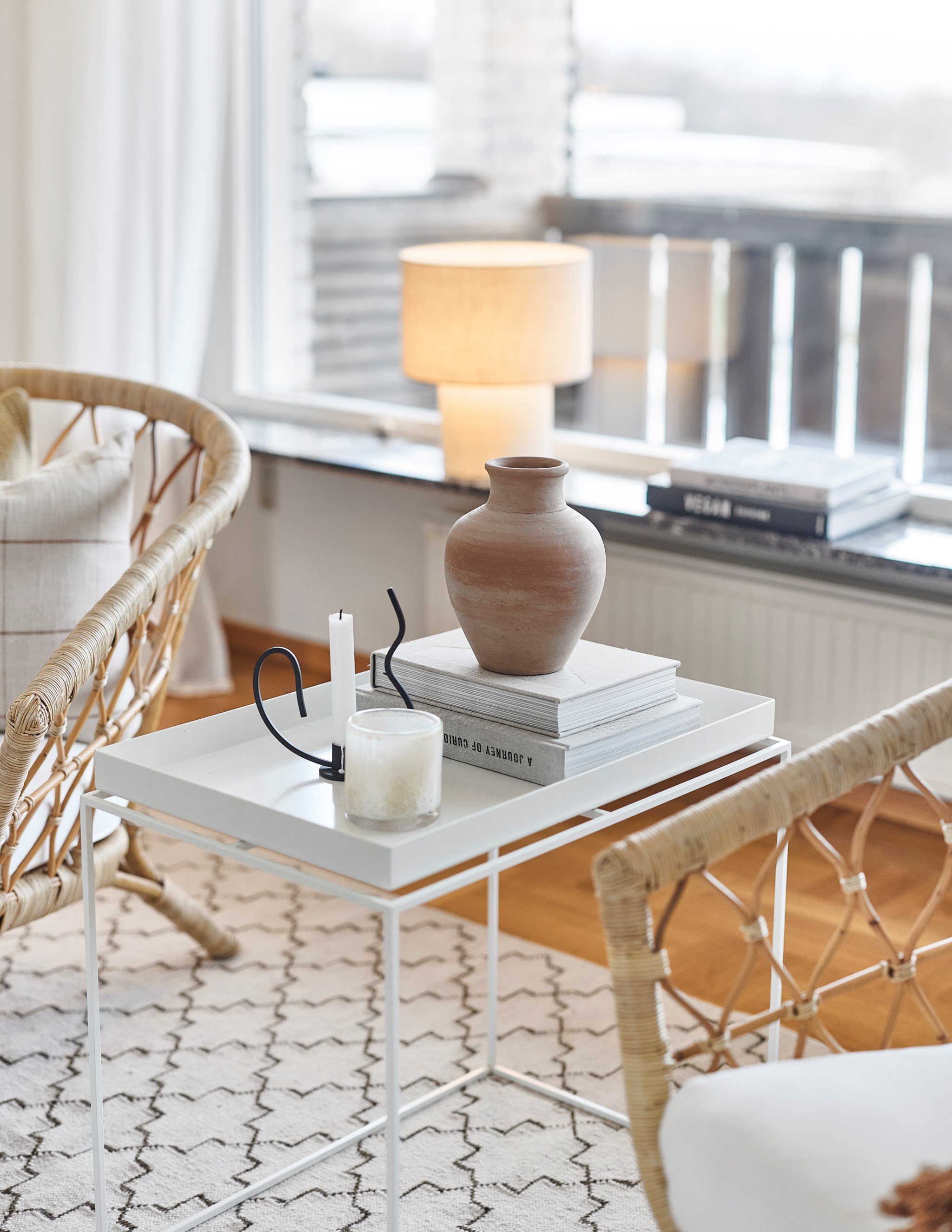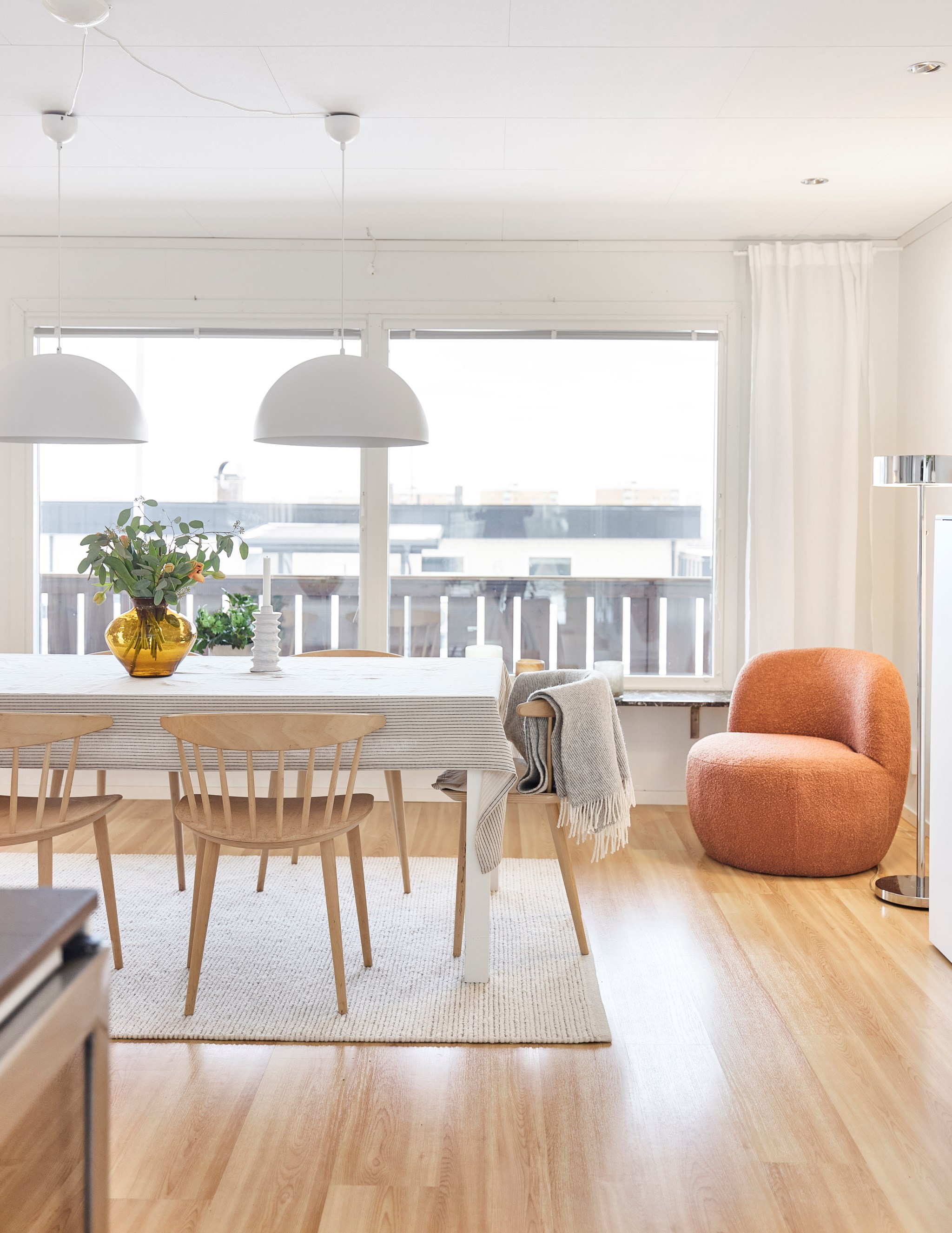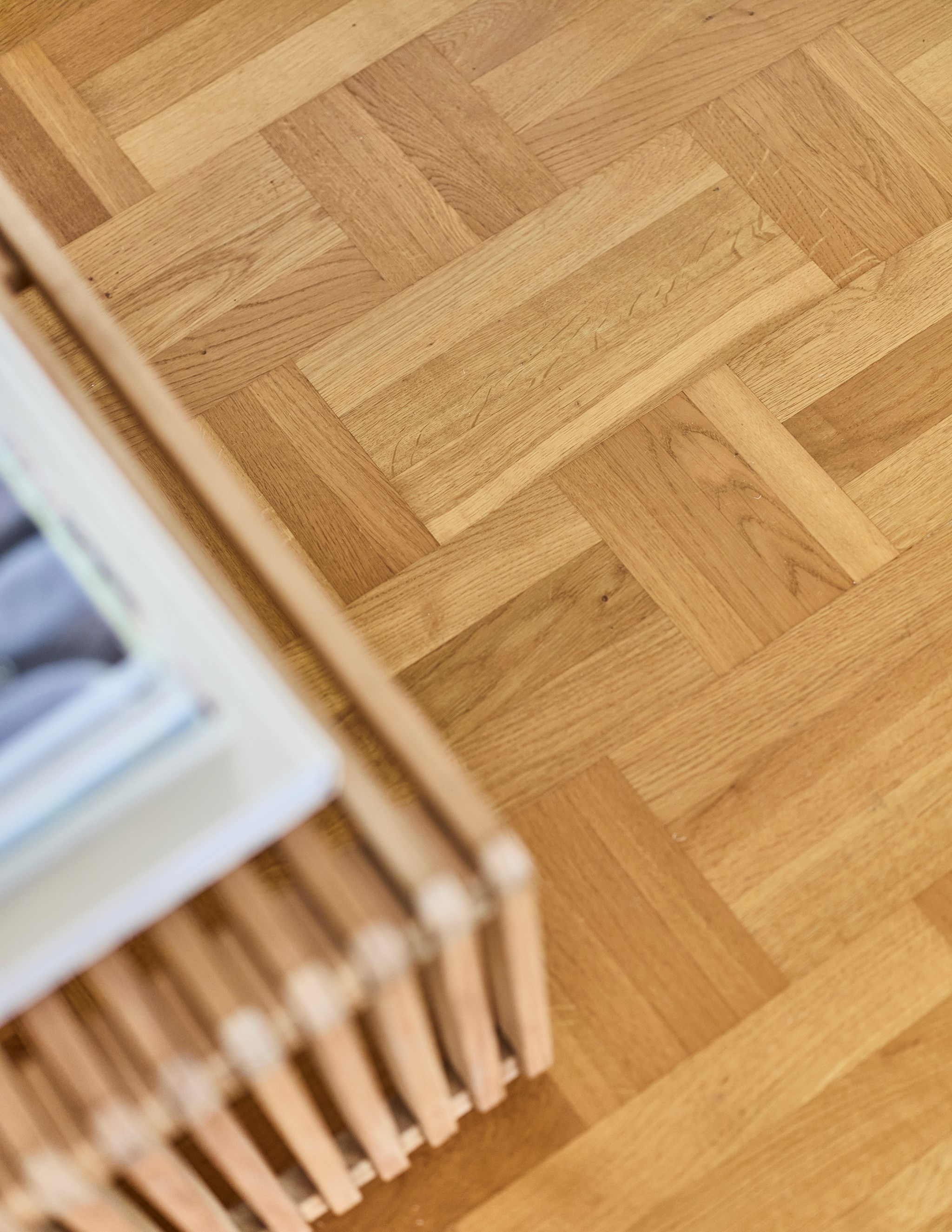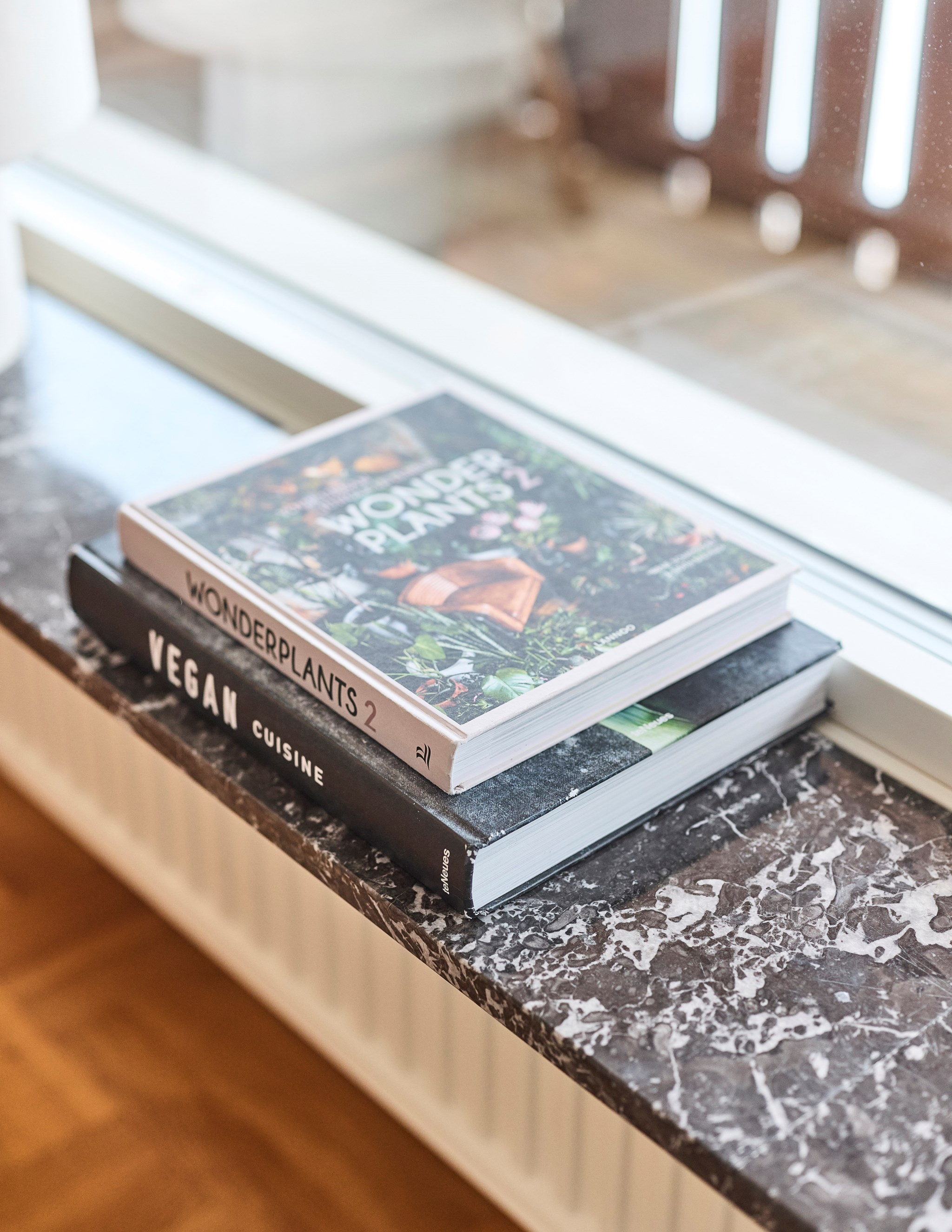 Entré i suterräng med den svarta originaldörren på plats. Eller ska vi kalla det ”port” för även den är härligt dimensionerad med stabila karmar och sidostycken i klarglas på ömse sidor. På golvet ligger det en oöm grå matta som tål alla årstider oavsett vad som följer med in under fötterna på stora och små, två- och fyrbenta. Oavsett storlek kan alla dessutom spegla sig i garderobens helglasade dörrar. Med trappan mitt i huset blir inte bara hallen, utan hela huset väldigt socialt och kommunikativt. Lätt att säga hej och börja prata rätt upp i köket och vardagsrummet.