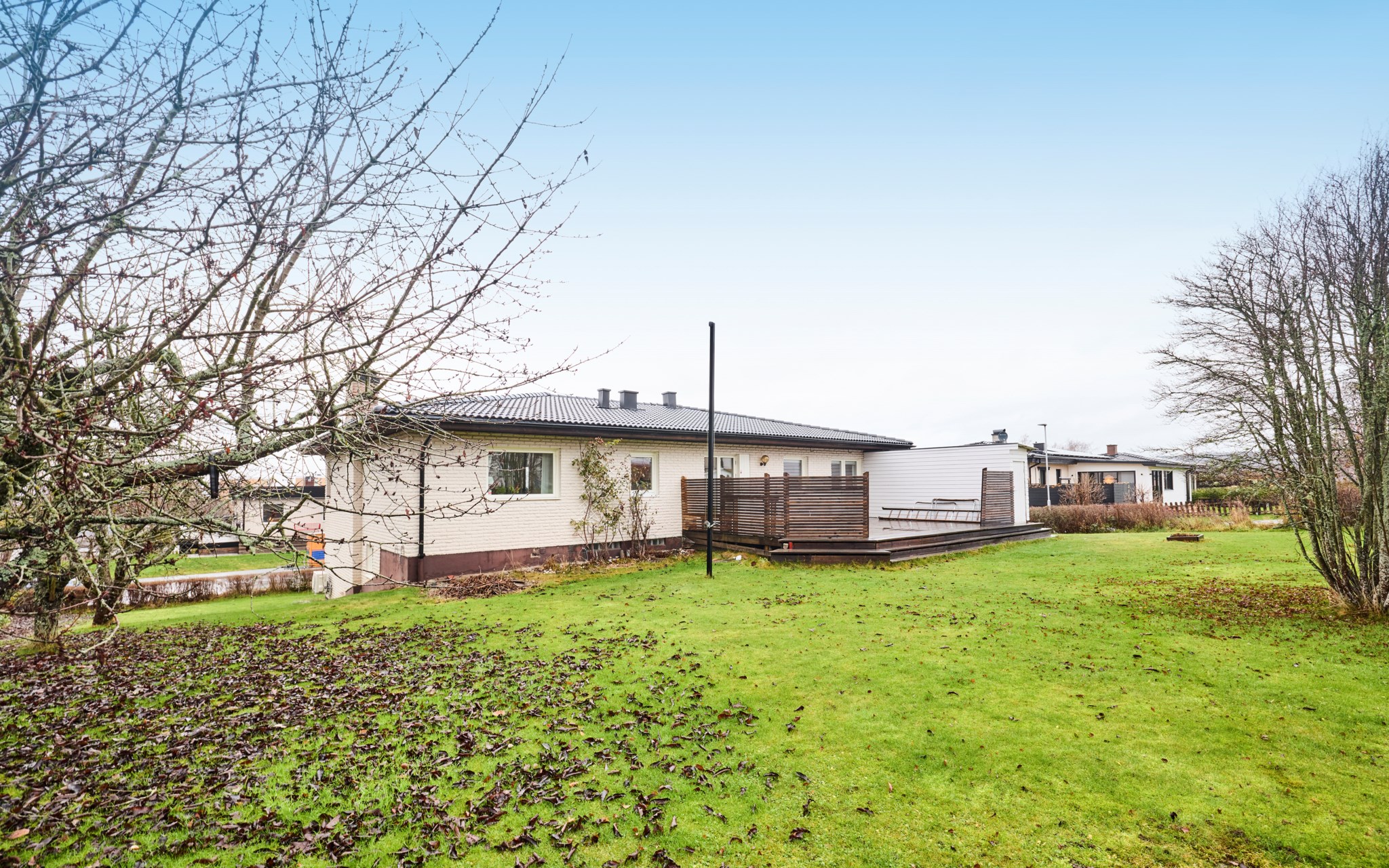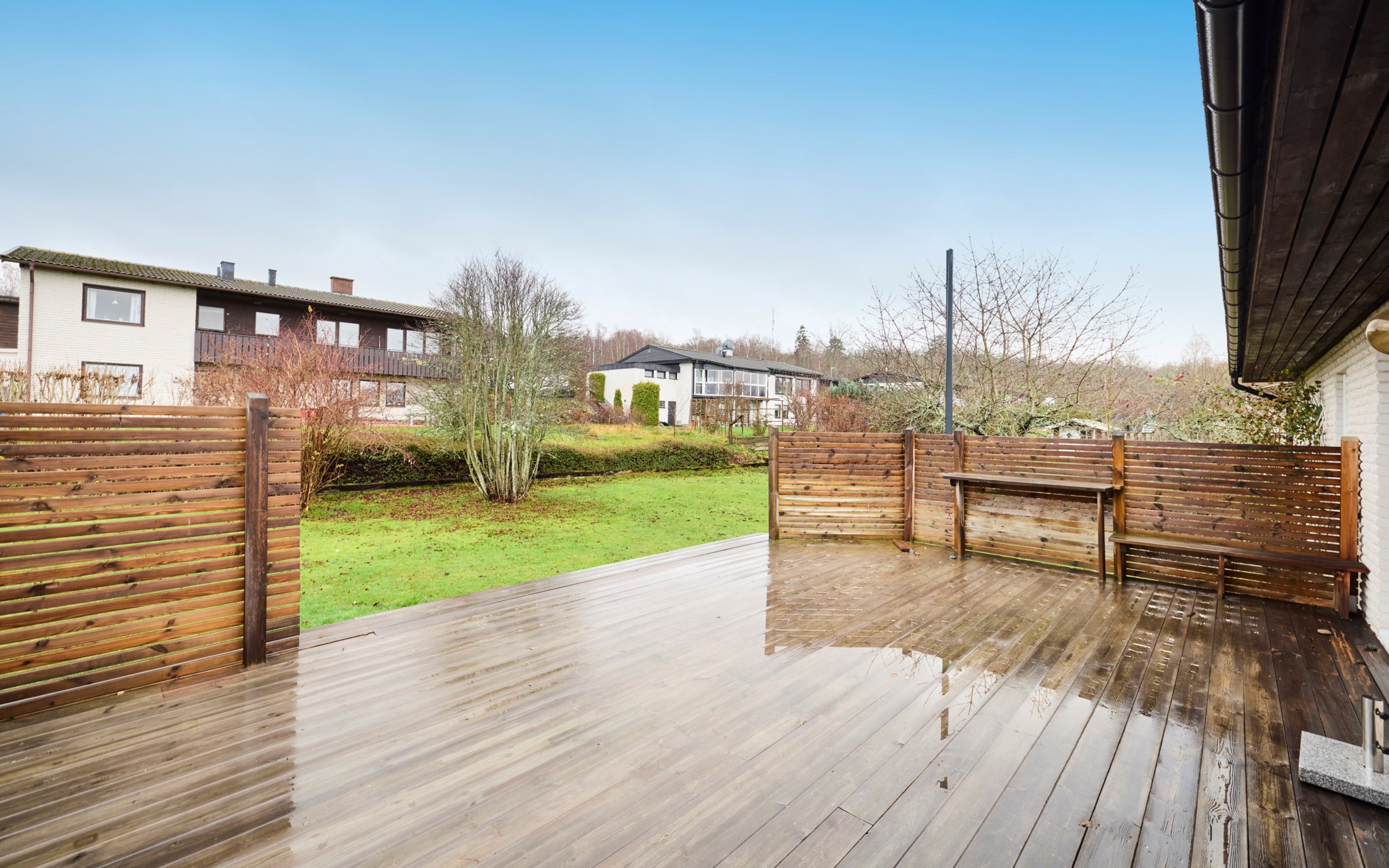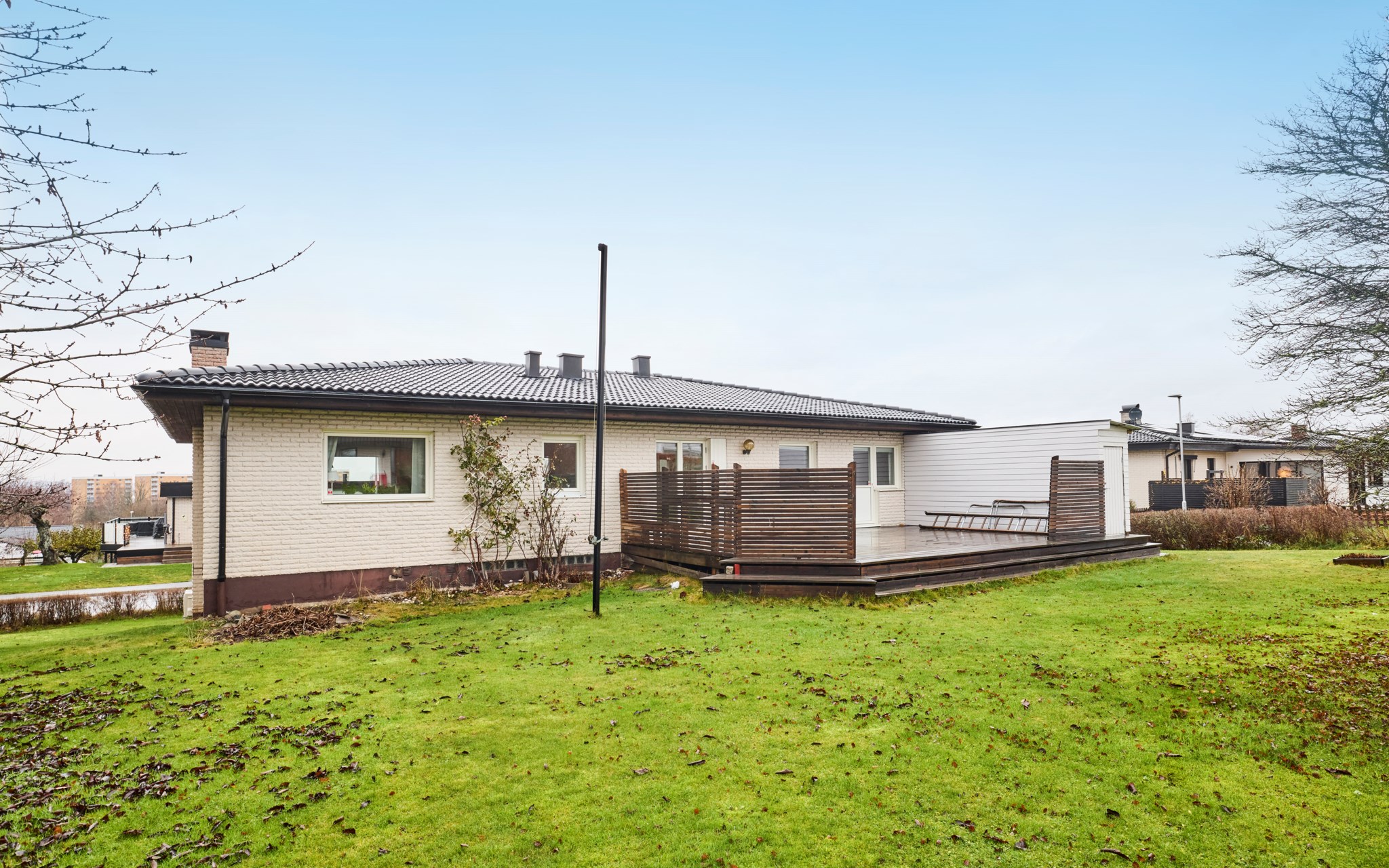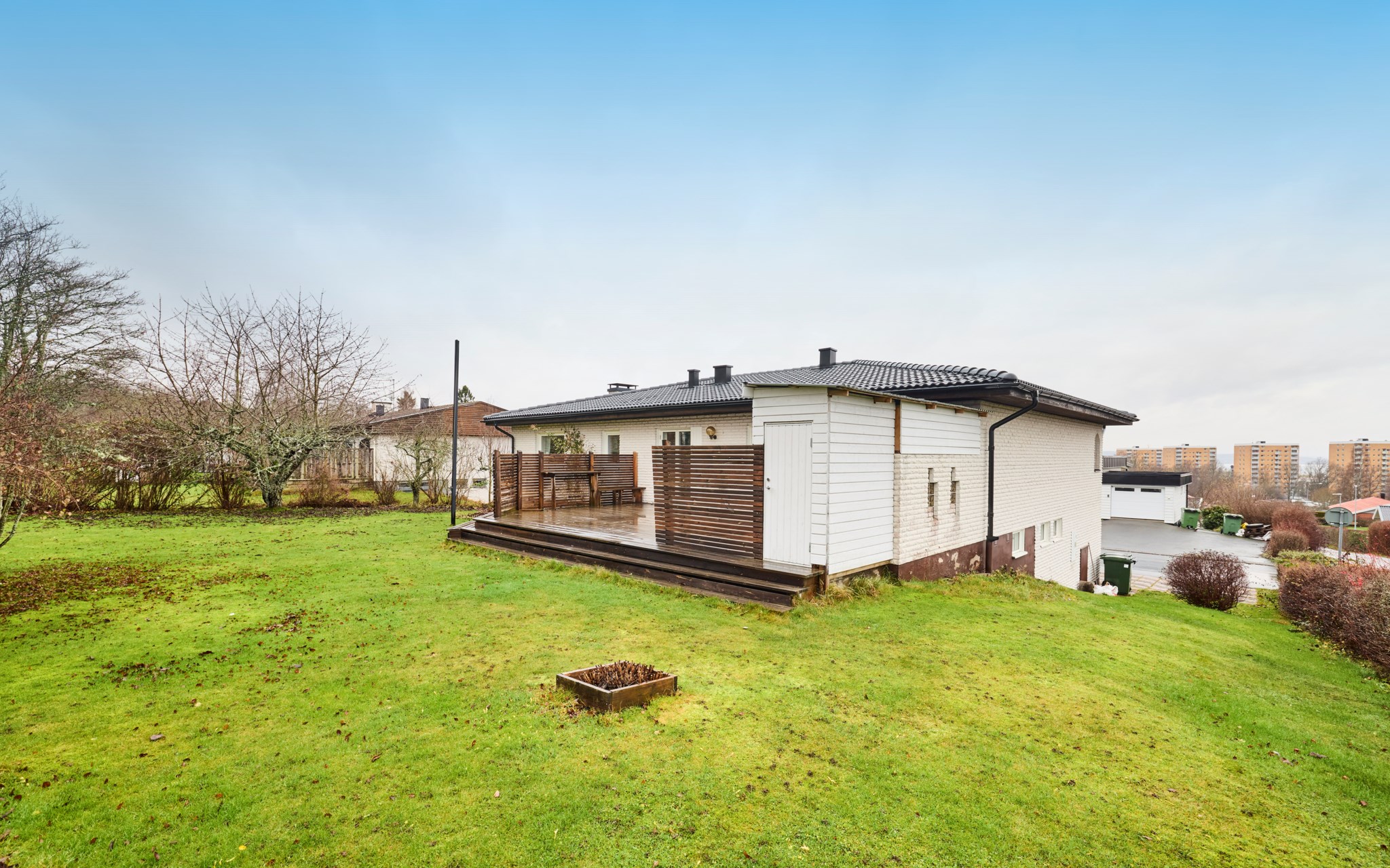 Inget krångel, inget betungande. Det är en lättskött trädgård som nuvarande ägare lämnar efter sig. Några fruktträd på baksidan som blommar vackert på våren och ger frukt längre fram på säsongen. Träden mot grannarna får väl hållas i schack i lagom höjd så att insynen dämpas, men utsikten är fri. Just din egen utsikt är det väl inte så mycket som hotar, förutom klot-tujan på framsidan som du får tukta då och då. Mest sol har du på baksidan, och därför är trädäcket så stort just där. Ett vardagsrum under bar himmel, med utgång både från köket och ett av sovrummen. Gräsmattan i princip helt platt här om du vill bryta lättjan med ett parti krocket.