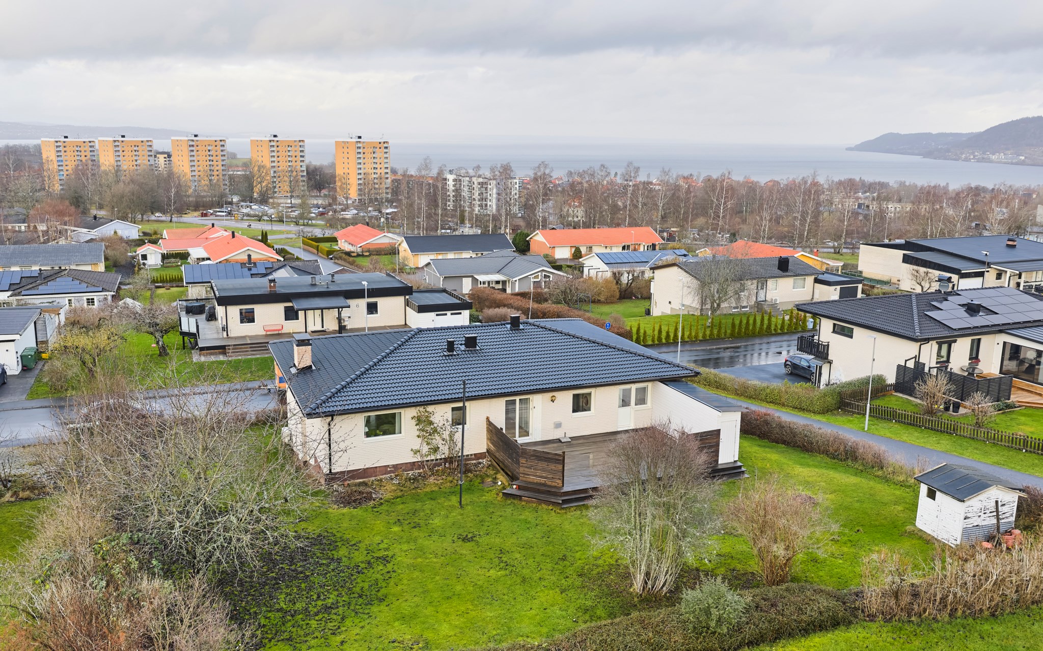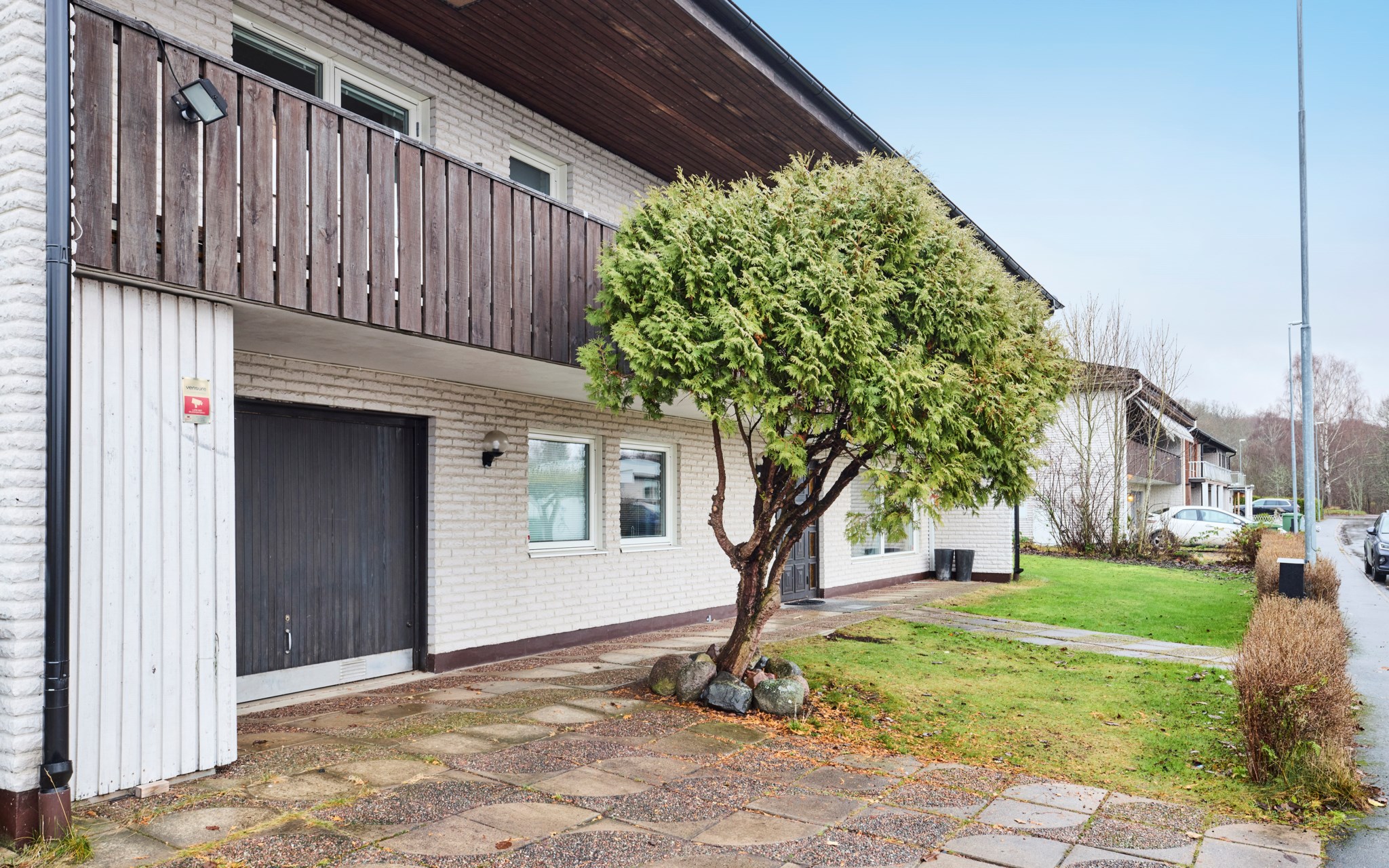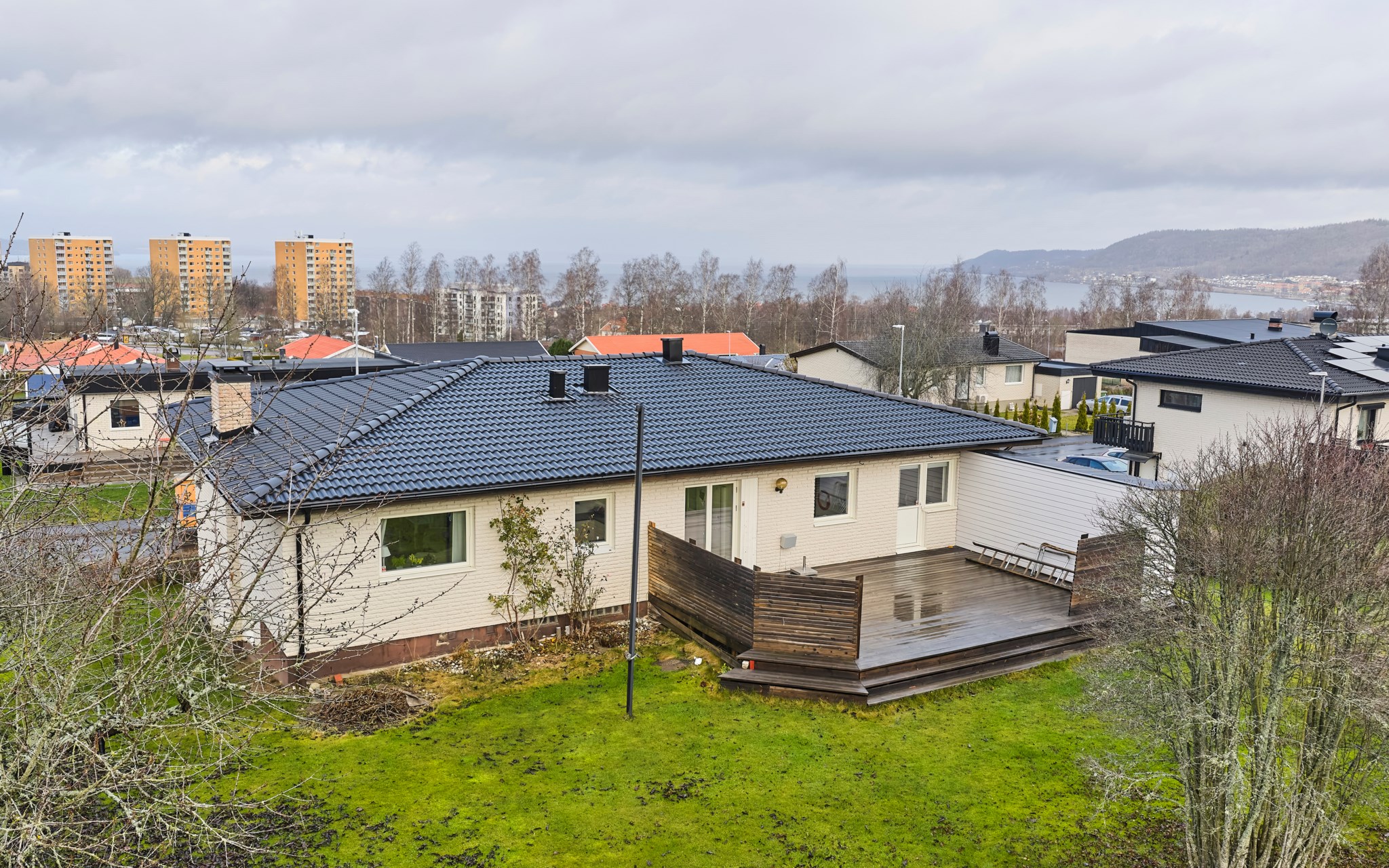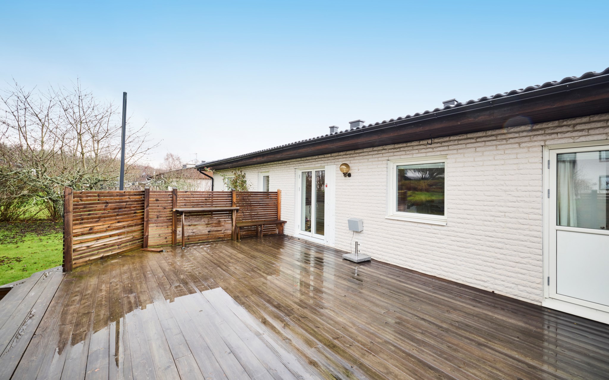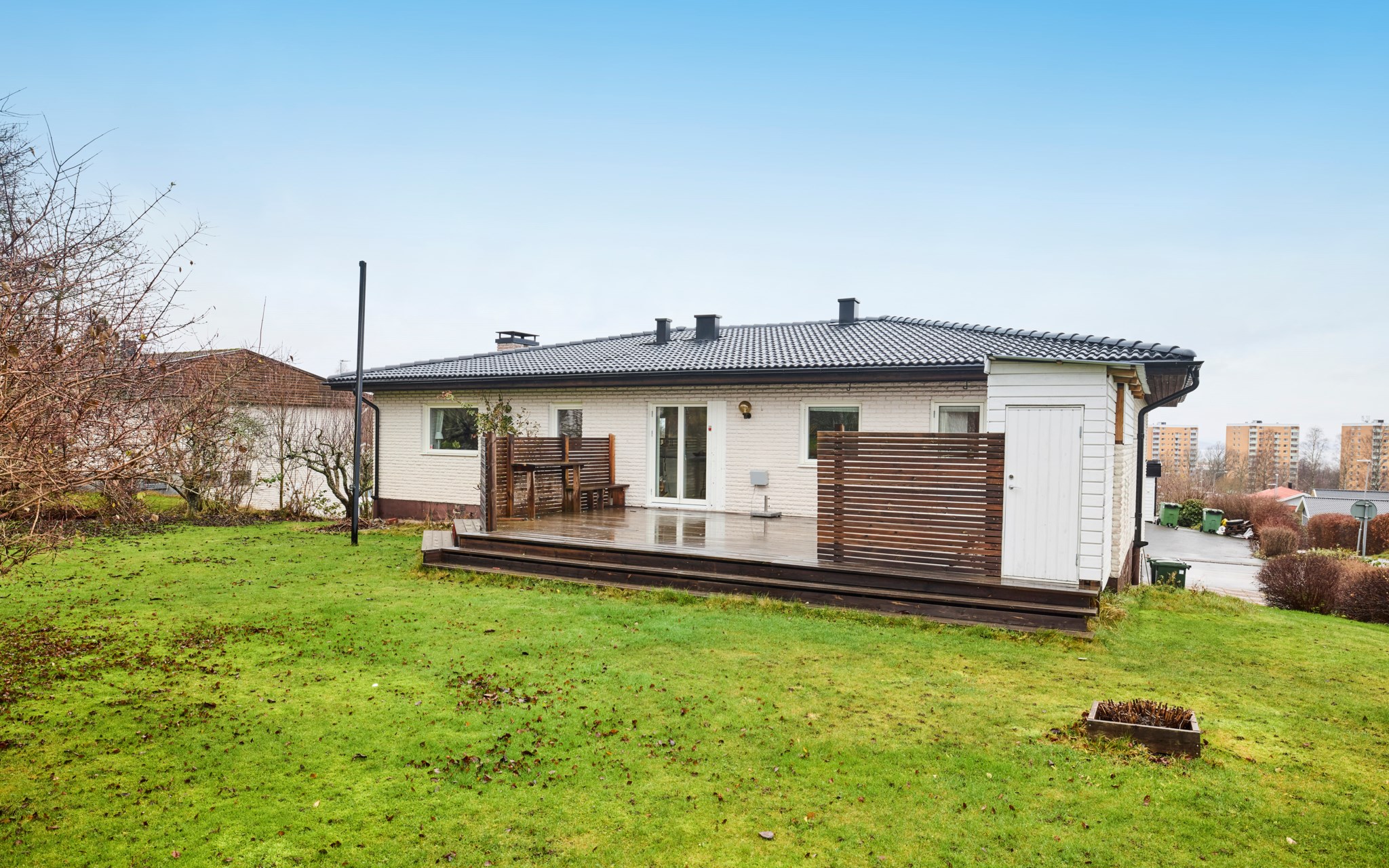 Inget krångel, inget betungande. Det är en lättskött trädgård som nuvarande ägare lämnar efter sig. Några fruktträd på baksidan som blommar vackert på våren och ger frukt längre fram på säsongen. Träden mot grannarna får väl hållas i schack i lagom höjd så att insynen dämpas, men utsikten är fri. Just din egen utsikt är det väl inte så mycket som hotar, förutom klot-tujan på framsidan som du får tukta då och då. Mest sol har du på baksidan, och därför är trädäcket så stort just där. Ett vardagsrum under bar himmel, med utgång både från köket och ett av sovrummen. Gräsmattan i princip helt platt här om du vill bryta lättjan med ett parti krocket.