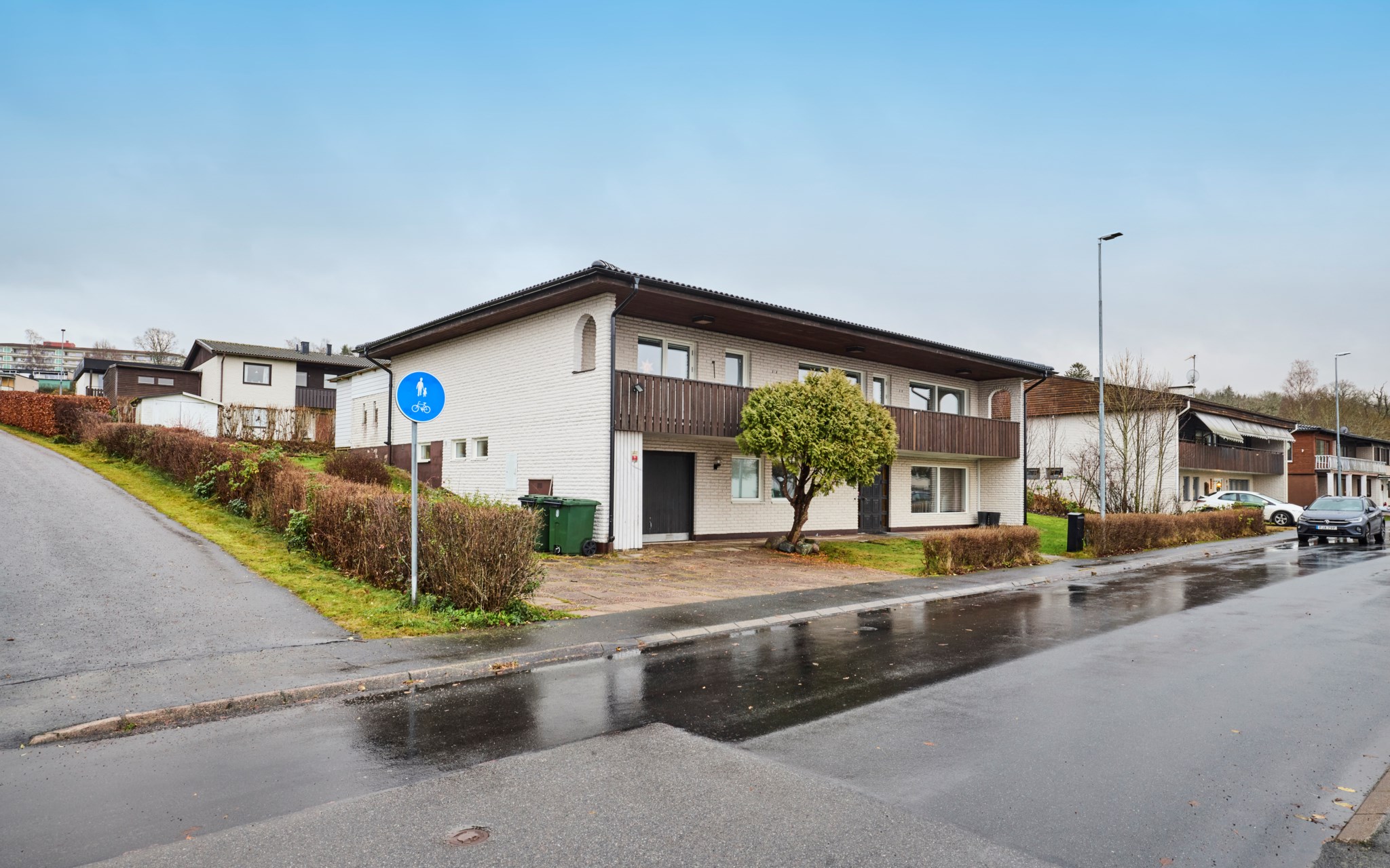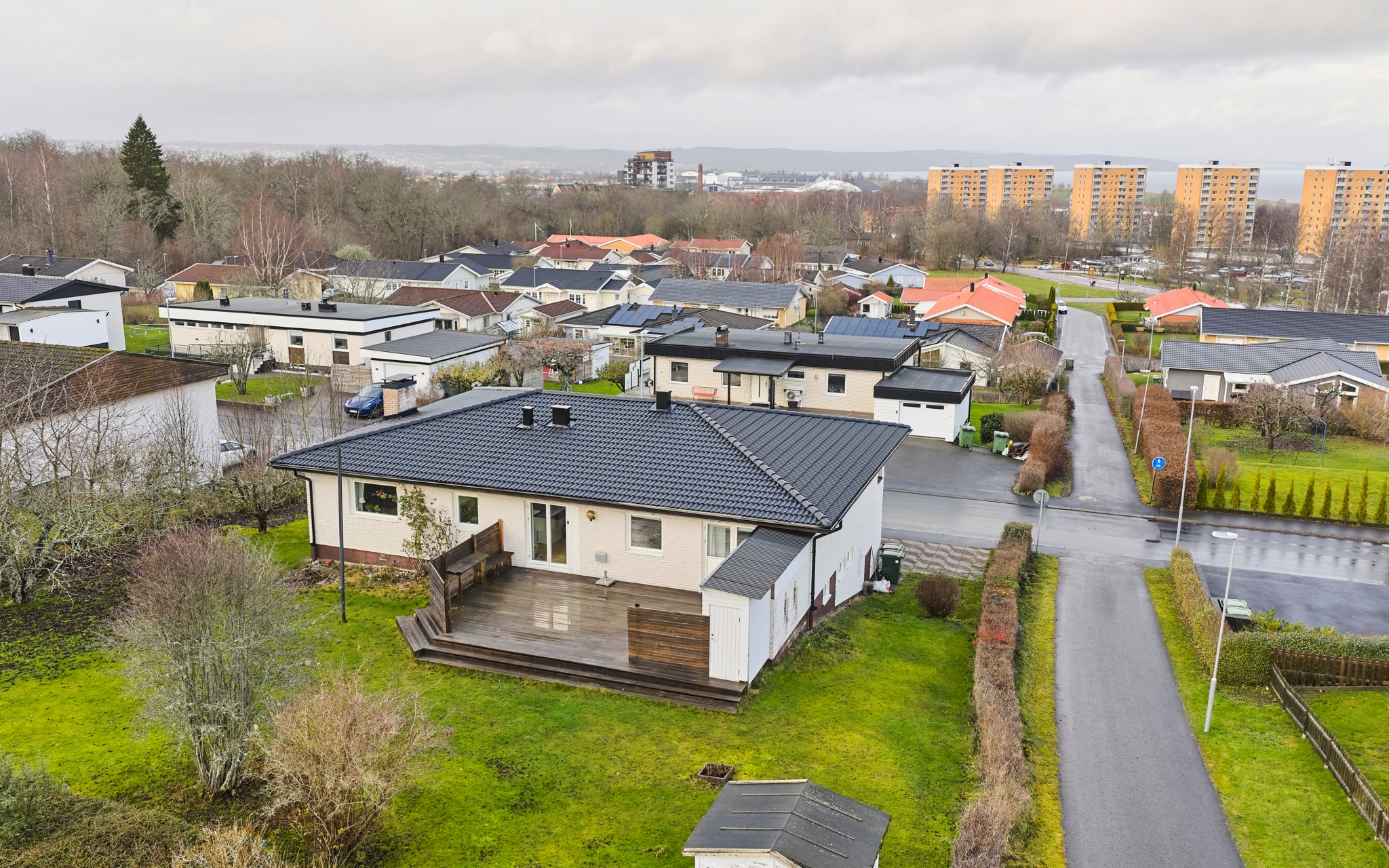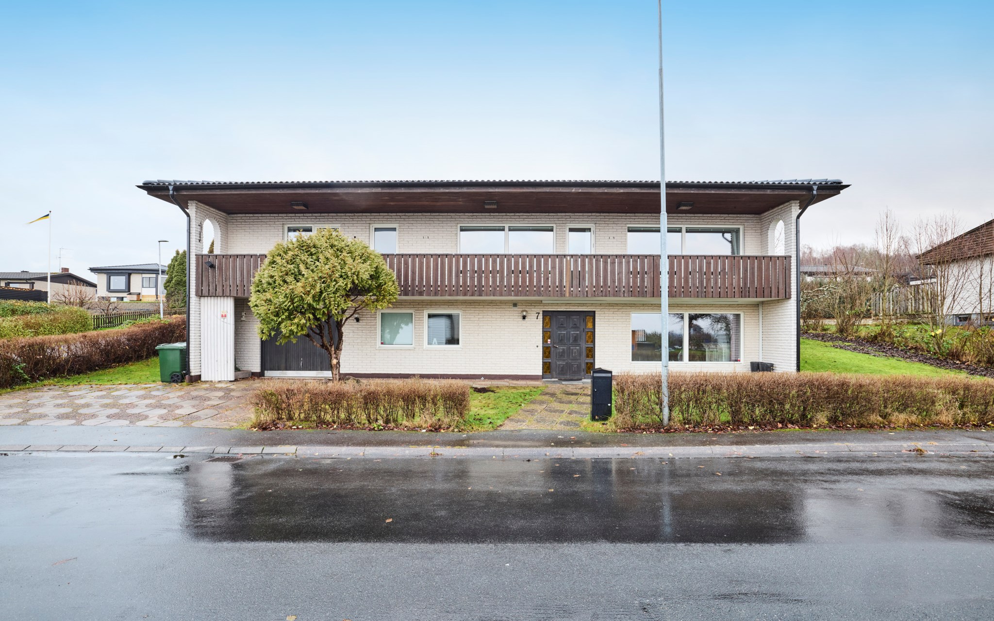 Ett Aneby-hus byggt 1975 i suterräng och i ganska tidstypisk stil. Mexitegel och långt utskjutande så kallat valmat tak, det vill säga takfall i alla väderstreck. Takfoten skyddar både fasad och fönster väl från regn och rusk. Huset mäter nästan 300 kvadrat varav 200 är boyta. De sociala ytorna väl tilltagna både uppe och nere, och känns nästan oändliga. Två pampiga öppna spisar drar ögat till sig. Kök och badrum väl i ordning, och fönstren bytta. Ett klassiskt hobbyrum som tål alla tänkbara upptåg, och säkert några otänkbara också. Huset värms med luftvärmepump och direktverkande el. Kamininsatsen nere kan bjussa på värme hela vägen upp, tack vare att trappan står mitt i huset.