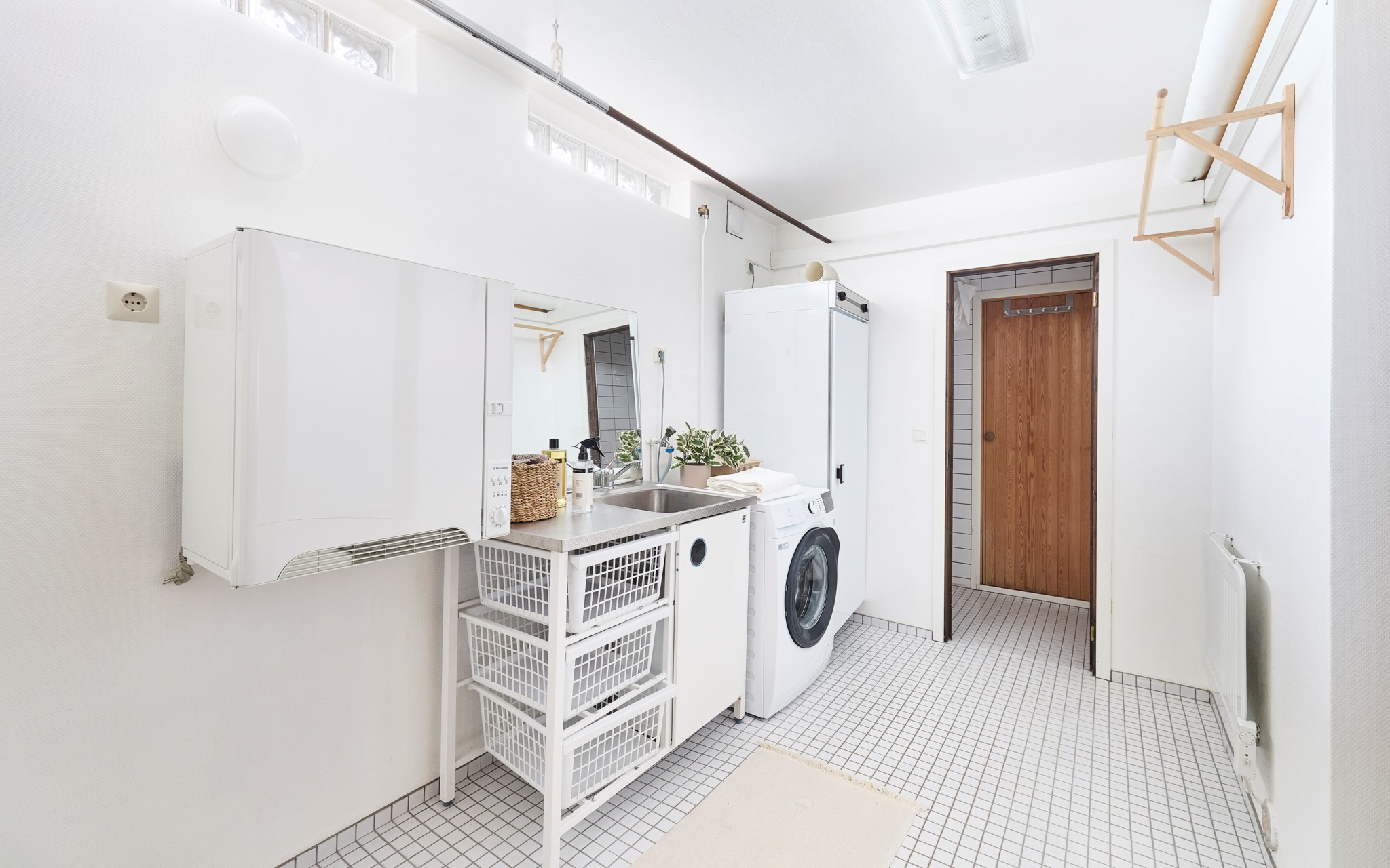 Här har nuvarande ägare renoverat för att göra tvättbestyren till en lite ljusare upplevelse i vardagen. Det är trots allt här du kommer spendera en inte obetydlig del av din vakna tid, och ibland en del halvvaken tid dessutom. Du hittar dessutom dusch och bastu, och ytterligare bra förvaring. Att ha dusch och tvättstuga i kombination är inte så dumt, du lägger av dig smutsiga kläder och greppar nya tyg när du själv är rentvättad. Kanske sätta upp en garderob till var och en i familjen här för den rena tvätten, så slipper du distribuera.