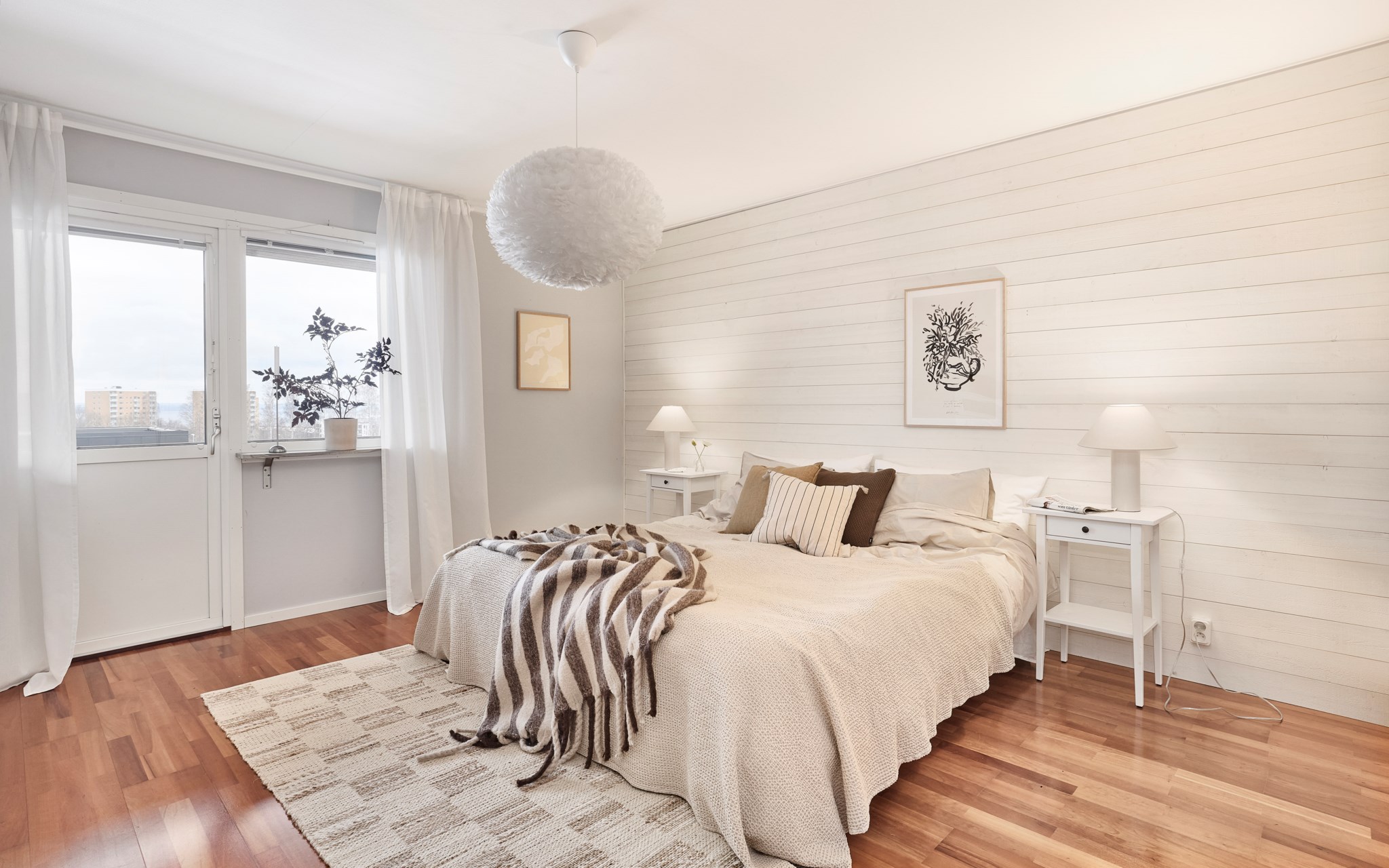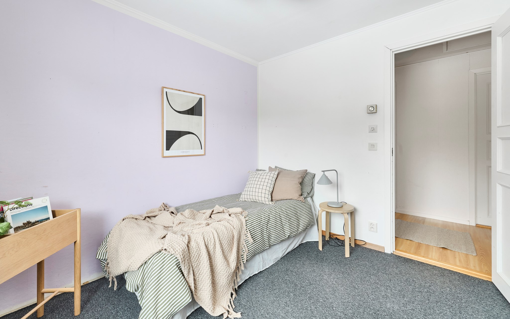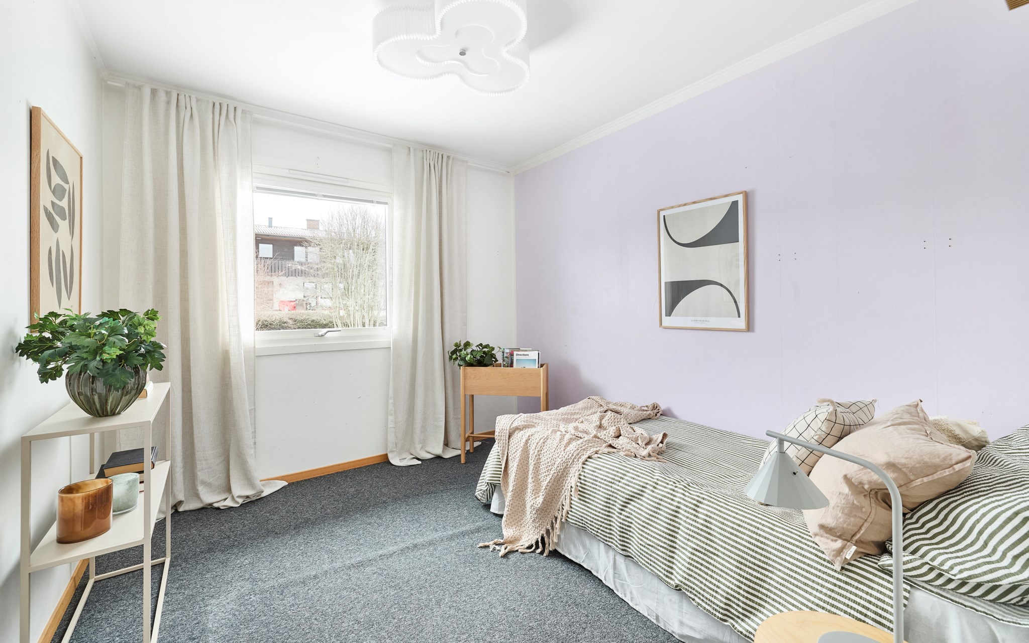 För många familjer är det antalet sovrum som fäller avgörande vid val av hus. Och här räknar du snabbt till fyra sovrum. Två i sängkammarstorlek, ett på vardera våningsplan, sen har du två ytterligare sovrum där uppe, varav det ena har egen dörr ut på baksidans uteplats. Stora sängkammaren uppe har i sin tur dörr ut på balkongen mot Vättern och solnedgångarna. I det stora sovrummet nere har ett behändigt pentry monterats tillsammans med ett kylskåp för att kunna hyras ut separat. Om familjen kräver ytterligare sovrum, skulle det stora allrummet nere kunna delas av efter öppna spisen, då det finns ett fönster på gaveln där.