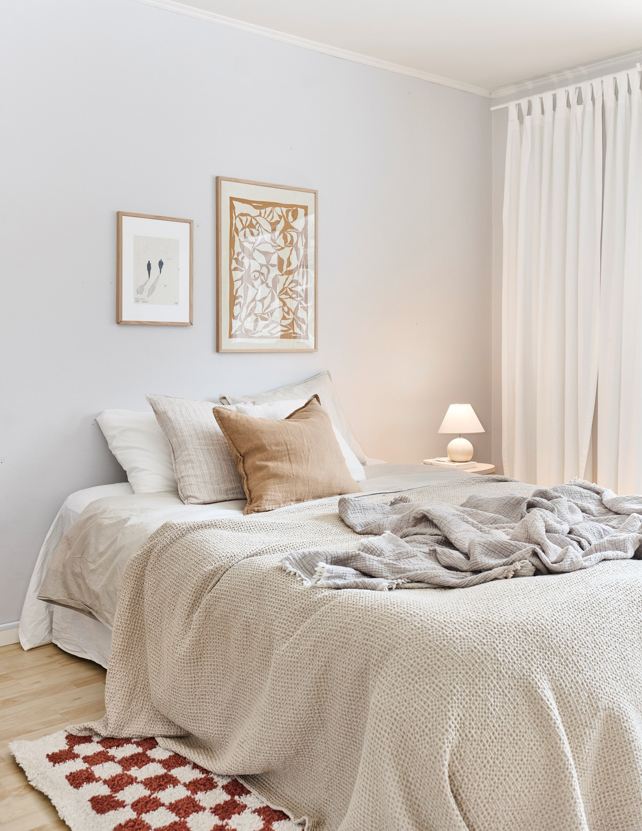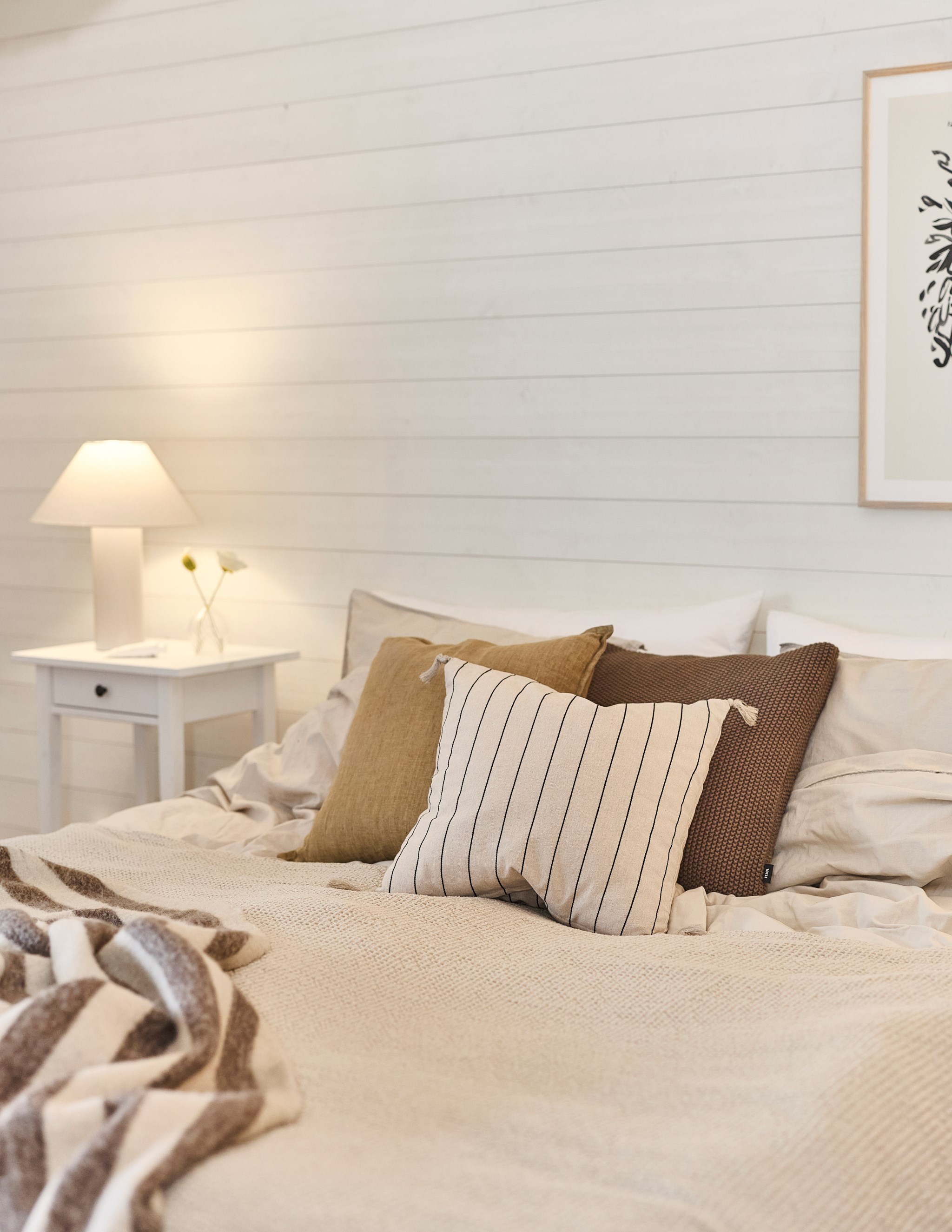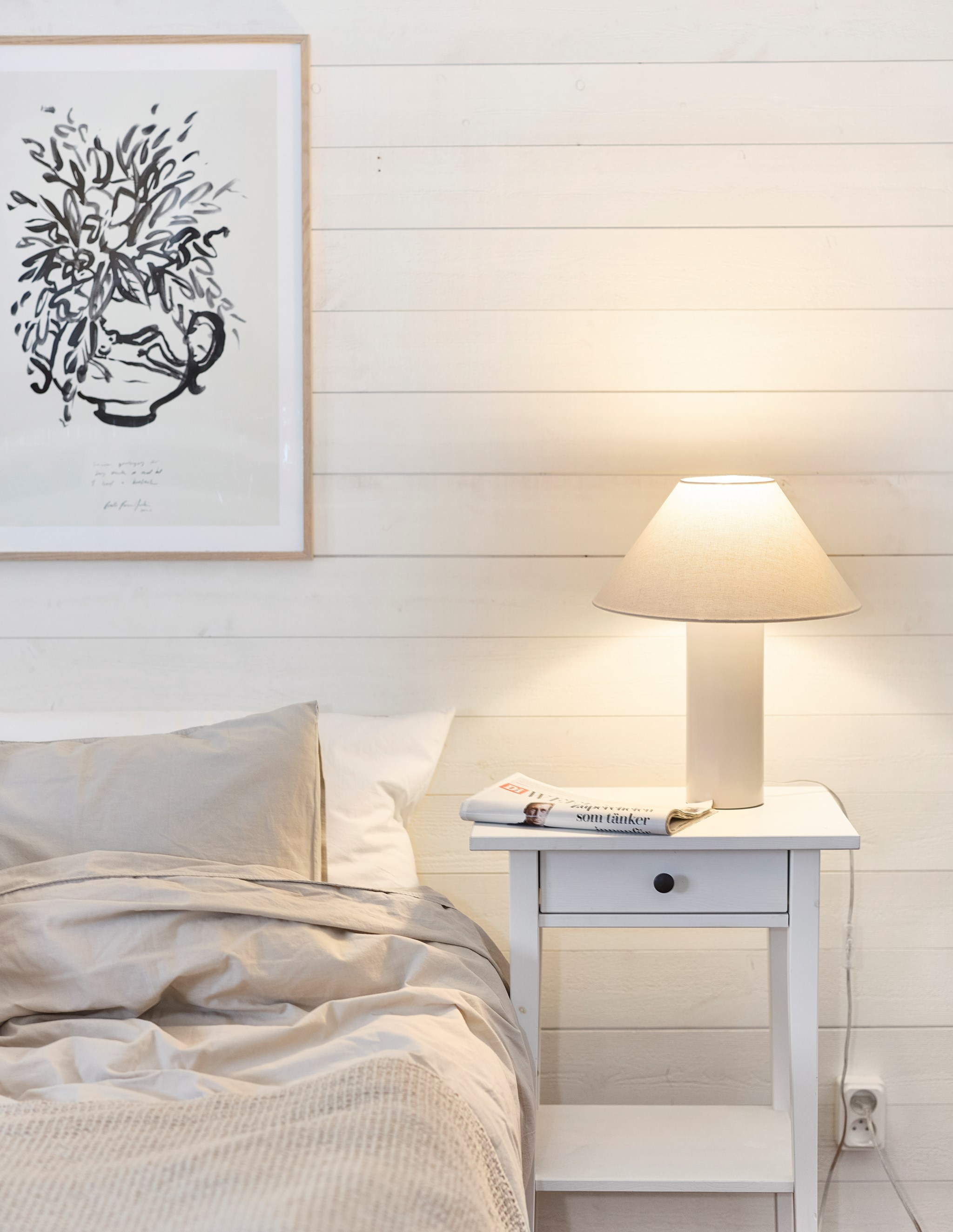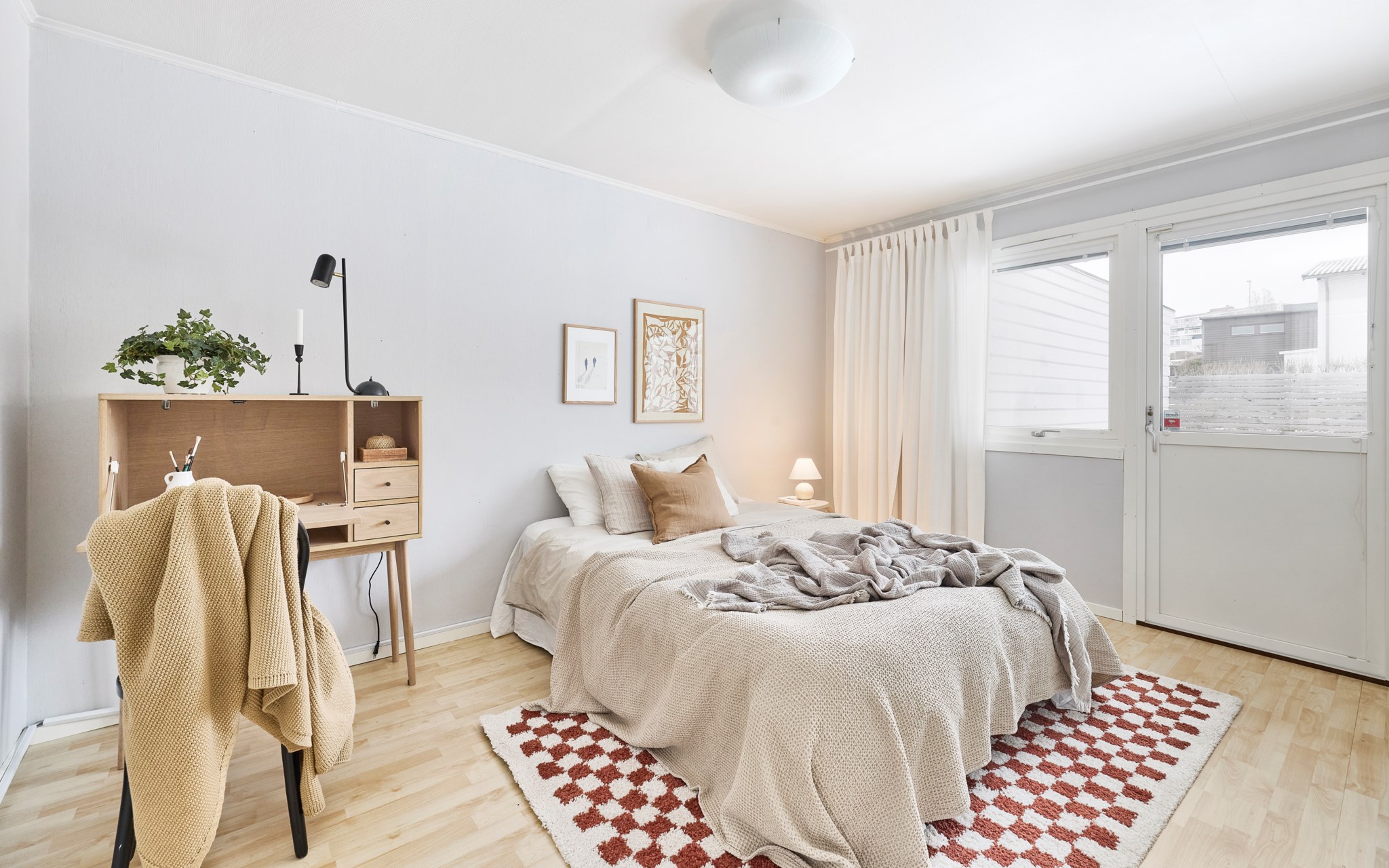 För många familjer är det antalet sovrum som fäller avgörande vid val av hus. Och här räknar du snabbt till fyra sovrum. Två i sängkammarstorlek, ett på vardera våningsplan, sen har du två ytterligare sovrum där uppe, varav det ena har egen dörr ut på baksidans uteplats. Stora sängkammaren uppe har i sin tur dörr ut på balkongen mot Vättern och solnedgångarna. I det stora sovrummet nere har ett behändigt pentry monterats tillsammans med ett kylskåp för att kunna hyras ut separat. Om familjen kräver ytterligare sovrum, skulle det stora allrummet nere kunna delas av efter öppna spisen, då det finns ett fönster på gaveln där.