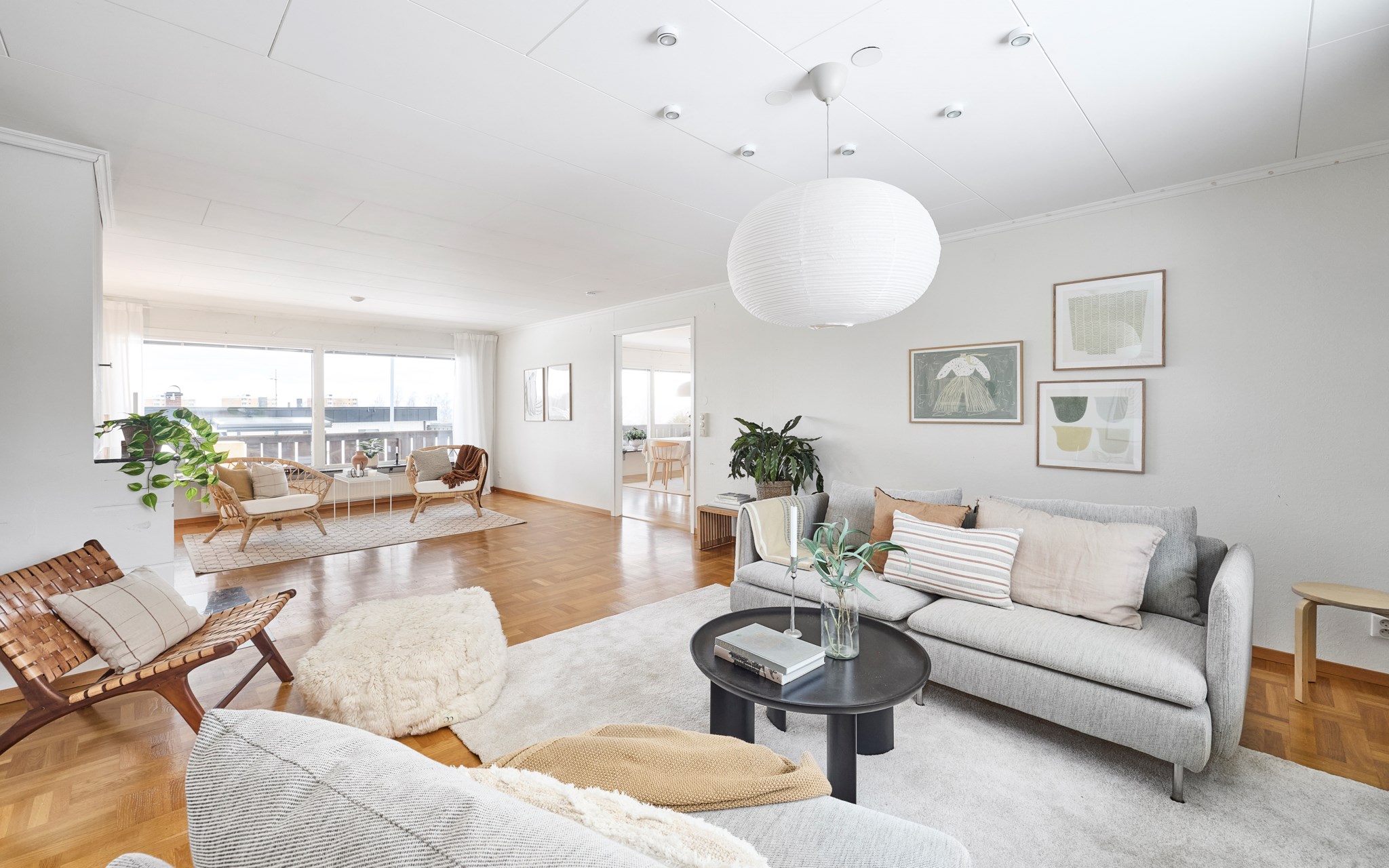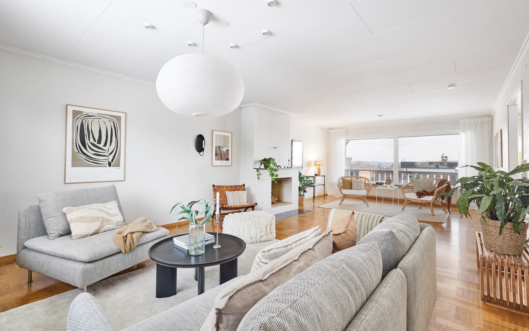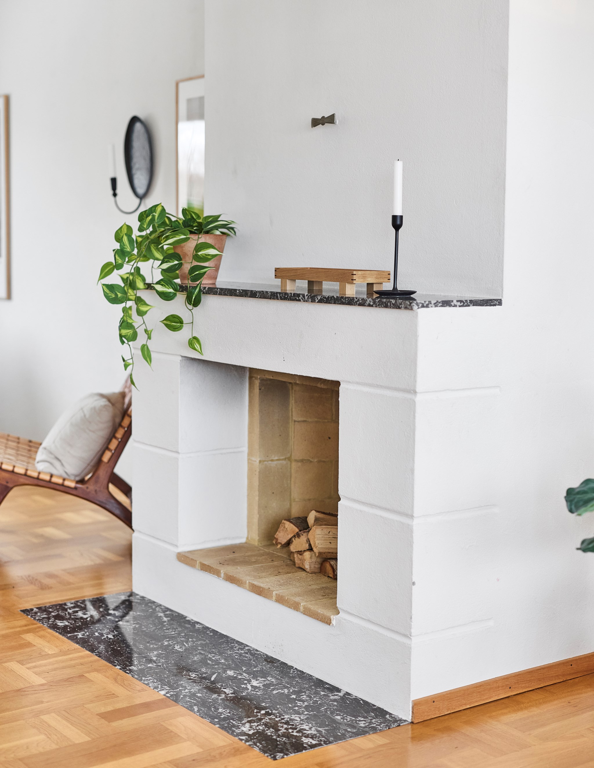 Även vardagsrummet uppe är proportionerat i den större skalan. Fritt fram att parkera ett matsalsbord här och kröna hela härligheten med gnistrande kristallkrona om det är vad du drömmer om. Även om du väljer ett stort bord så kommer det inte stå vägen för en maffig soffgrupp. Vardagsrummet mäter nämligen cirka X0 kvadrat. Mitt i rummet, mitt för passagen mot köket, ståtar husets andra öppna spis. Den har nog aldrig använts, men det bör inte vara några problem att få fart på rökkanalen. Kanske klokt att sätta in en kamininsats precis som nere för bättre verkningsgrad på veden.