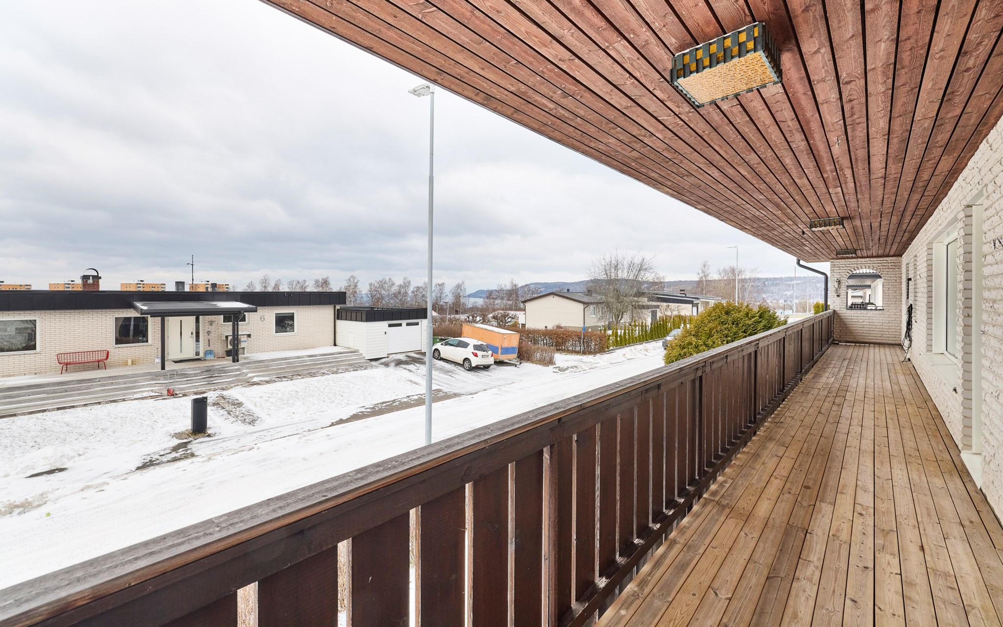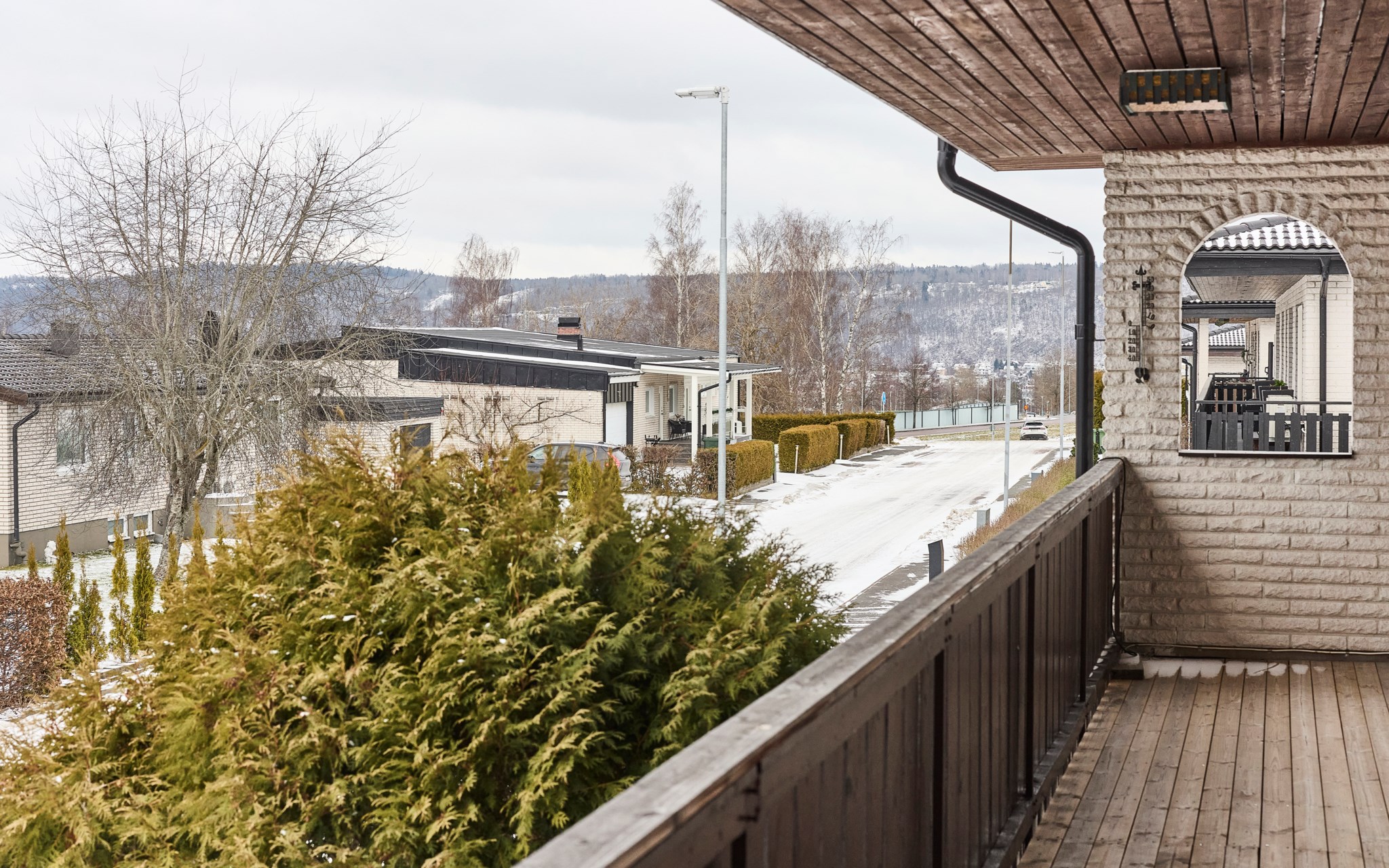 Helt under tak. Och helt underbar vy långt ut över Vättern och långt upp i Skärstadalen, när vädret låter blicken få fri fart. Balkongen är alltså lika lång som huset så det är många kvadrat att disponera mot kvällssolen på sommaren, och lika många kvadrat på morgonen, men då får du vara uppe riktigt tidigt om du ska få se solen bryta igenom horisonten. Faktum är att det kanske mest spektakulära på himlen är ett riktigt åskoväder som släpper loss sina laddade elektroner i augustiluften.