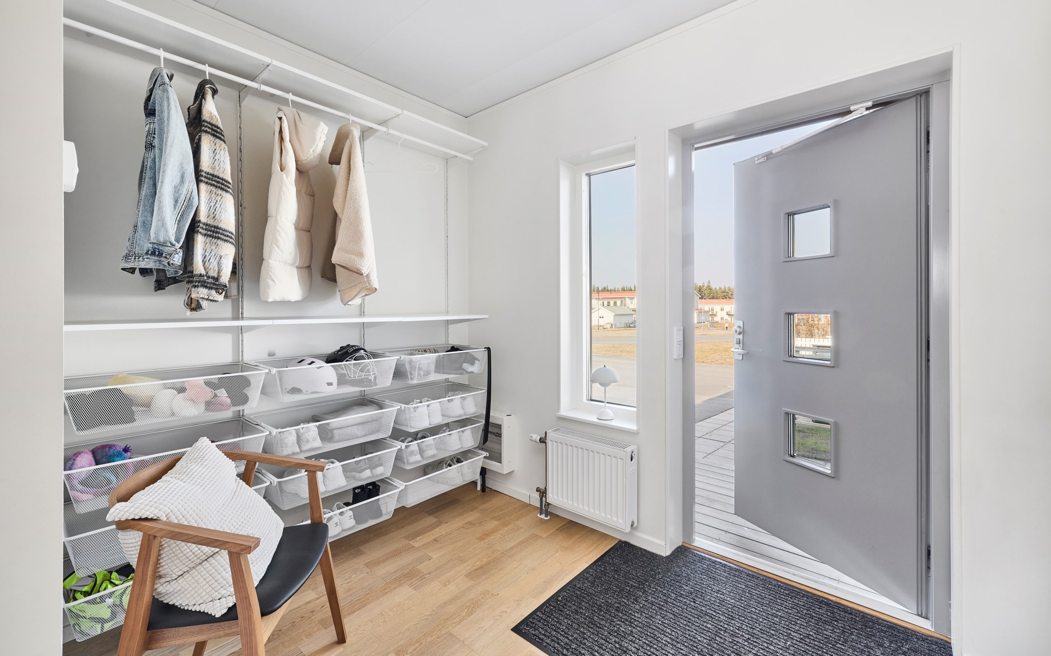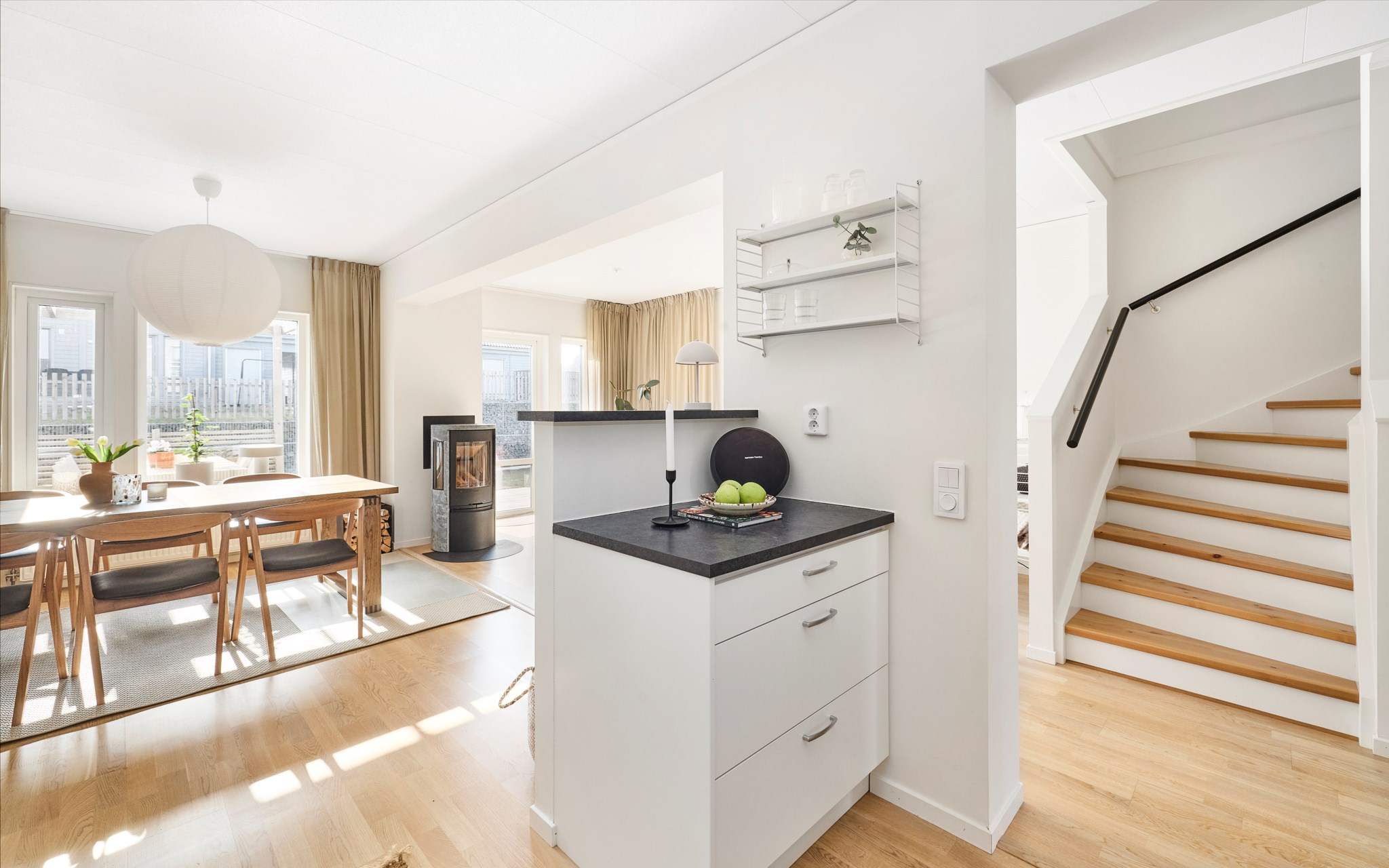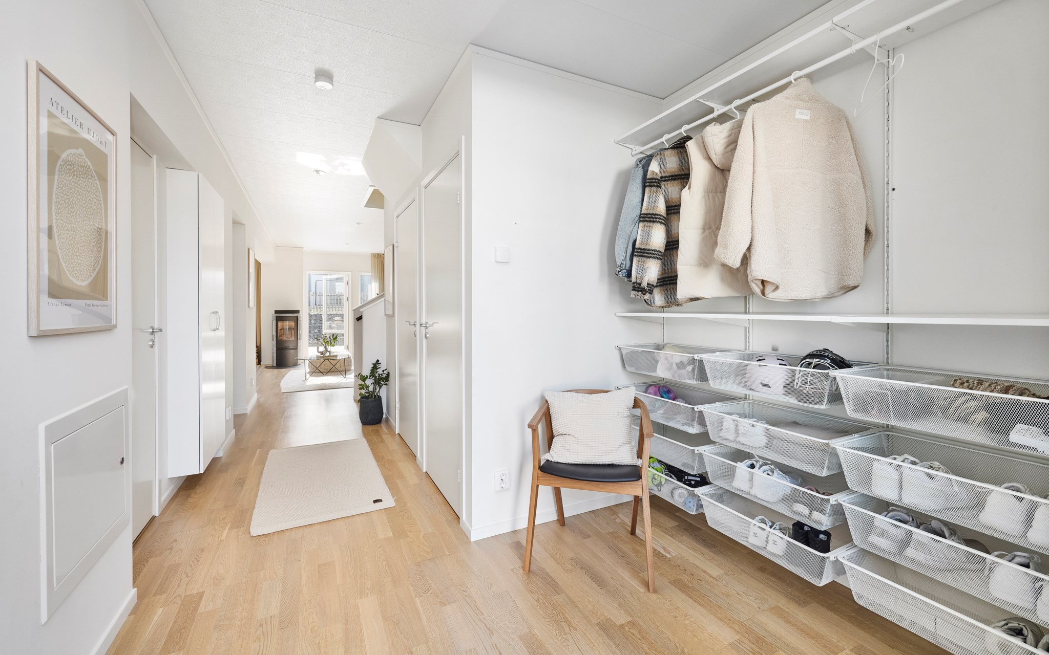 Du öppnar dörren och ser rakt genom huset. Ljuset från baksidan letar sig hela vägen in i hallen och blicken landar direkt på kaminen längre in i rummet. Redan här får du en första känsla av den öppna planlösningen och hur husets ytor hänger ihop. Här lever vardagen. Jackor åker av, skor ställs undan och någon går vidare mot köket. Avhängningsytan till höger sväljer det mesta, och vill du kan du enkelt sätta skjutdörrar eller garderober för att dölja förvaringen. Några steg in finns dessutom två praktiska förråd under trappan. Perfekt för städgrejer, säsongskläder och allt det där du vill ha nära till hands men inte framme.