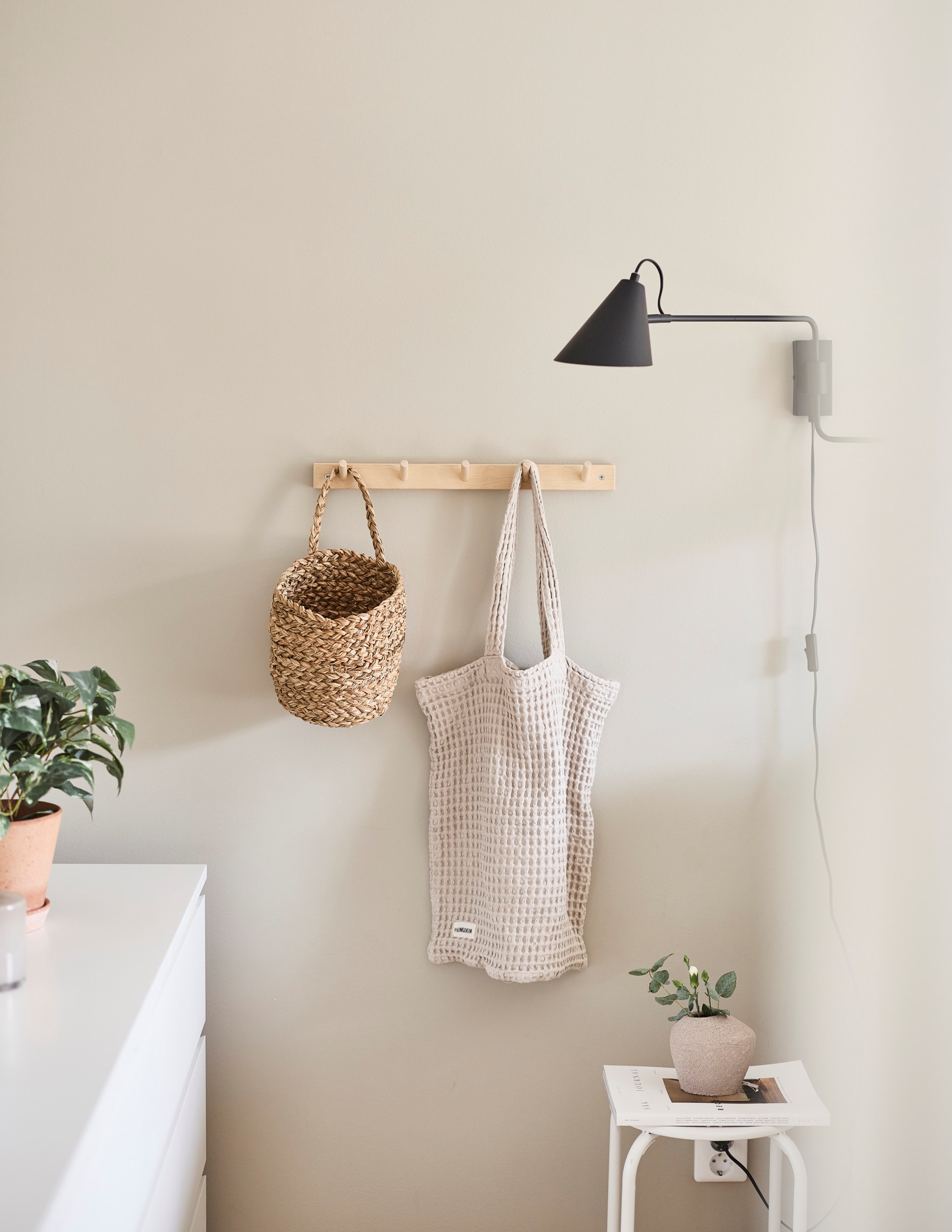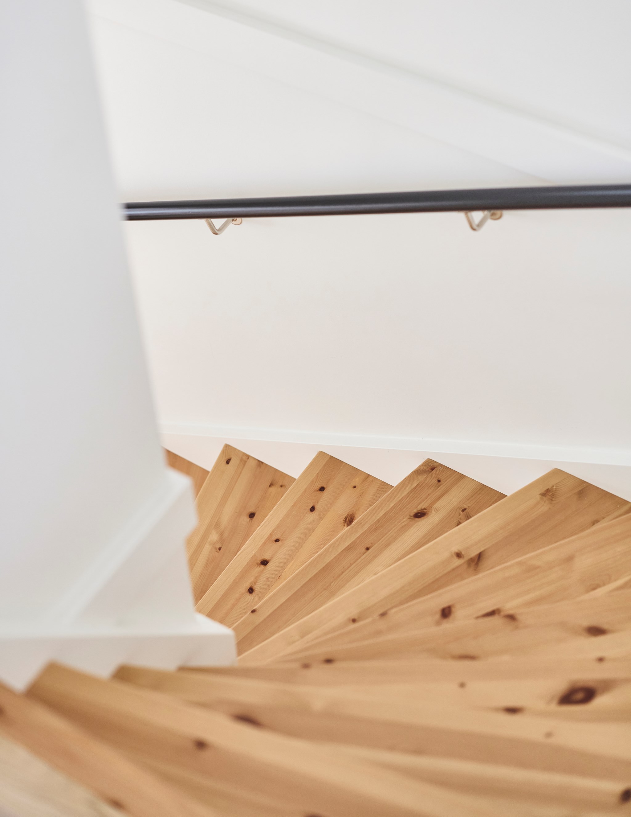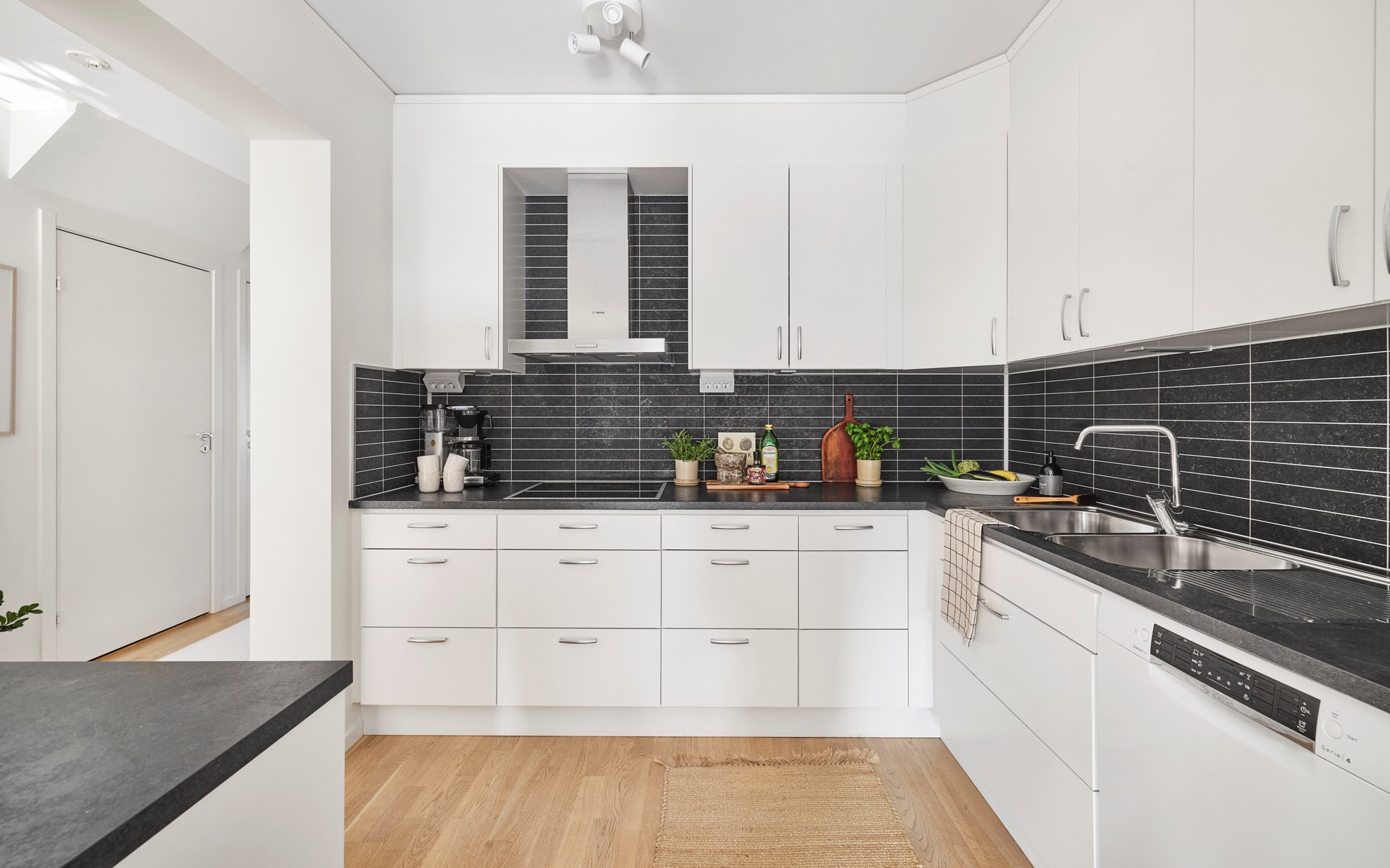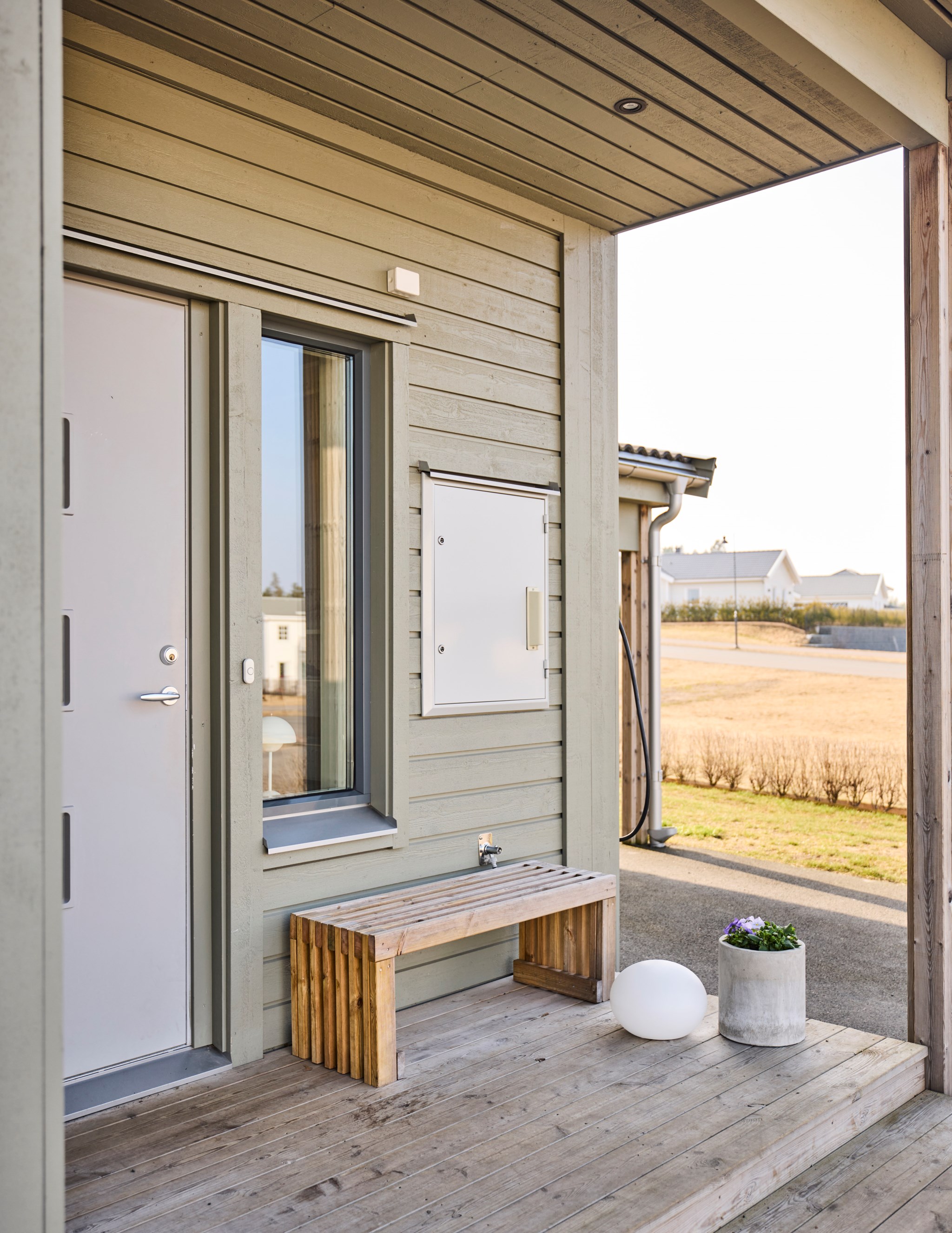 Du öppnar dörren och ser rakt genom huset. Ljuset från baksidan letar sig hela vägen in i hallen och blicken landar direkt på kaminen längre in i rummet. Redan här får du en första känsla av den öppna planlösningen och hur husets ytor hänger ihop. Här lever vardagen. Jackor åker av, skor ställs undan och någon går vidare mot köket. Avhängningsytan till höger sväljer det mesta, och vill du kan du enkelt sätta skjutdörrar eller garderober för att dölja förvaringen. Några steg in finns dessutom två praktiska förråd under trappan. Perfekt för städgrejer, säsongskläder och allt det där du vill ha nära till hands men inte framme.