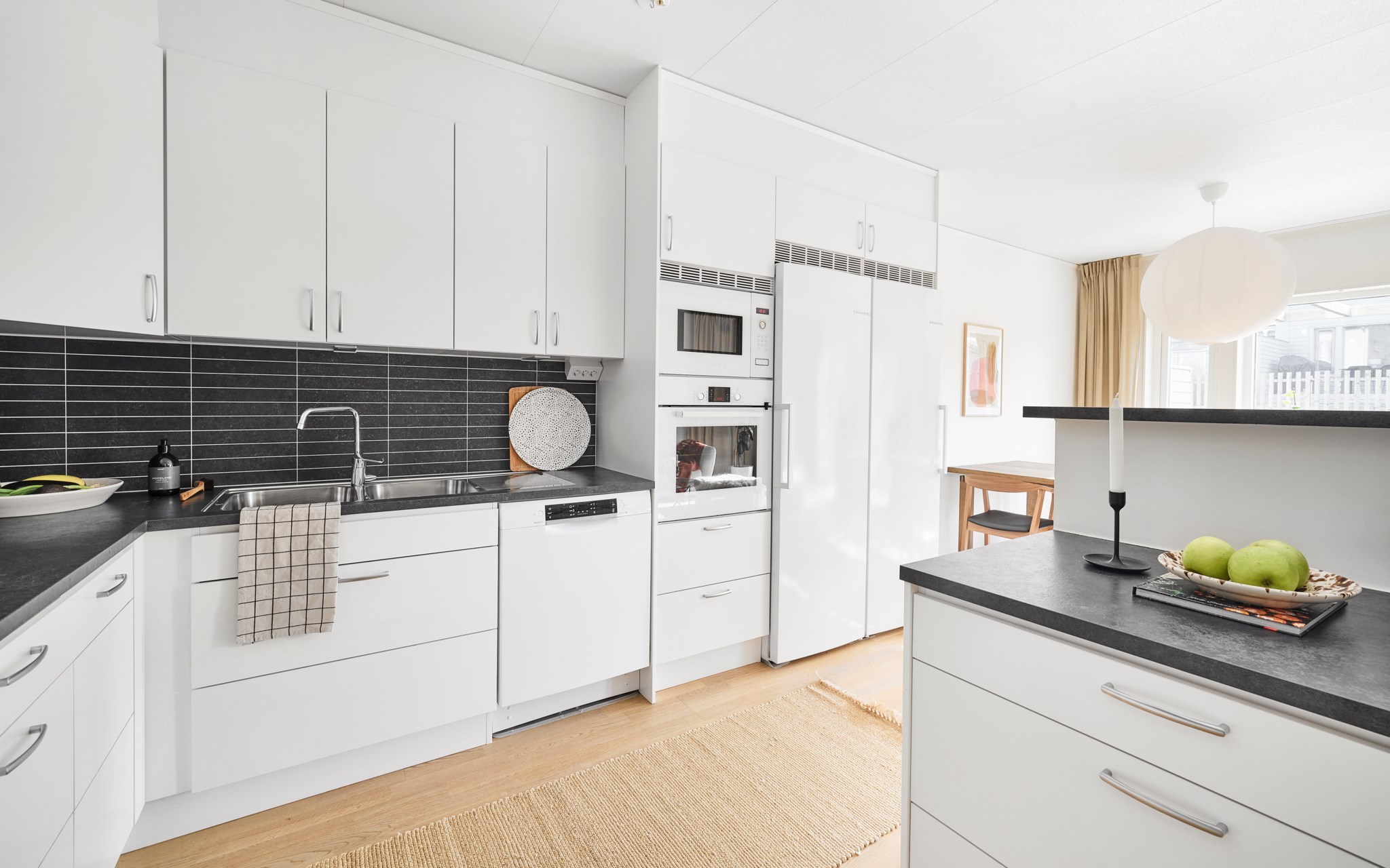Köket ligger mitt i huset och blir en naturlig samlingsplats. Här finns bra med arbetsyta och en köksö som ramar in rummet och skapar kontakt mot resten av hemmet. Köket var ett av de tillval familjen lade lite extra tanke på när huset byggdes och det märks i hur väl det fungerar i vardagen. Matplatsen ligger precis intill, vid fönstren mot baksidan. Här ryms ett stort bord där både middagar och pusselpyssel får plats. När gästerna stannar länge är det enkelt att flytta vidare till soffan intill och fortsätta kvällen framför den sprakande brasan.