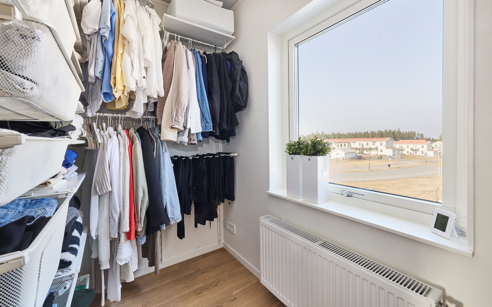 Direkt till vänster när du kommer upp på övervåningen ligger ett mindre rum som idag används som klädkammare. Förvaringen är generös med plats för både hängande kläder och hyllor, och fönstret mot gatan släpper in fint dagsljus. Vill du använda rummet på ett annat sätt kan det funka lika bra som hemmakontor eller litet lekrum. Ett flexibelt utrymme som enkelt kan anpassas efter familjens behov över tid.