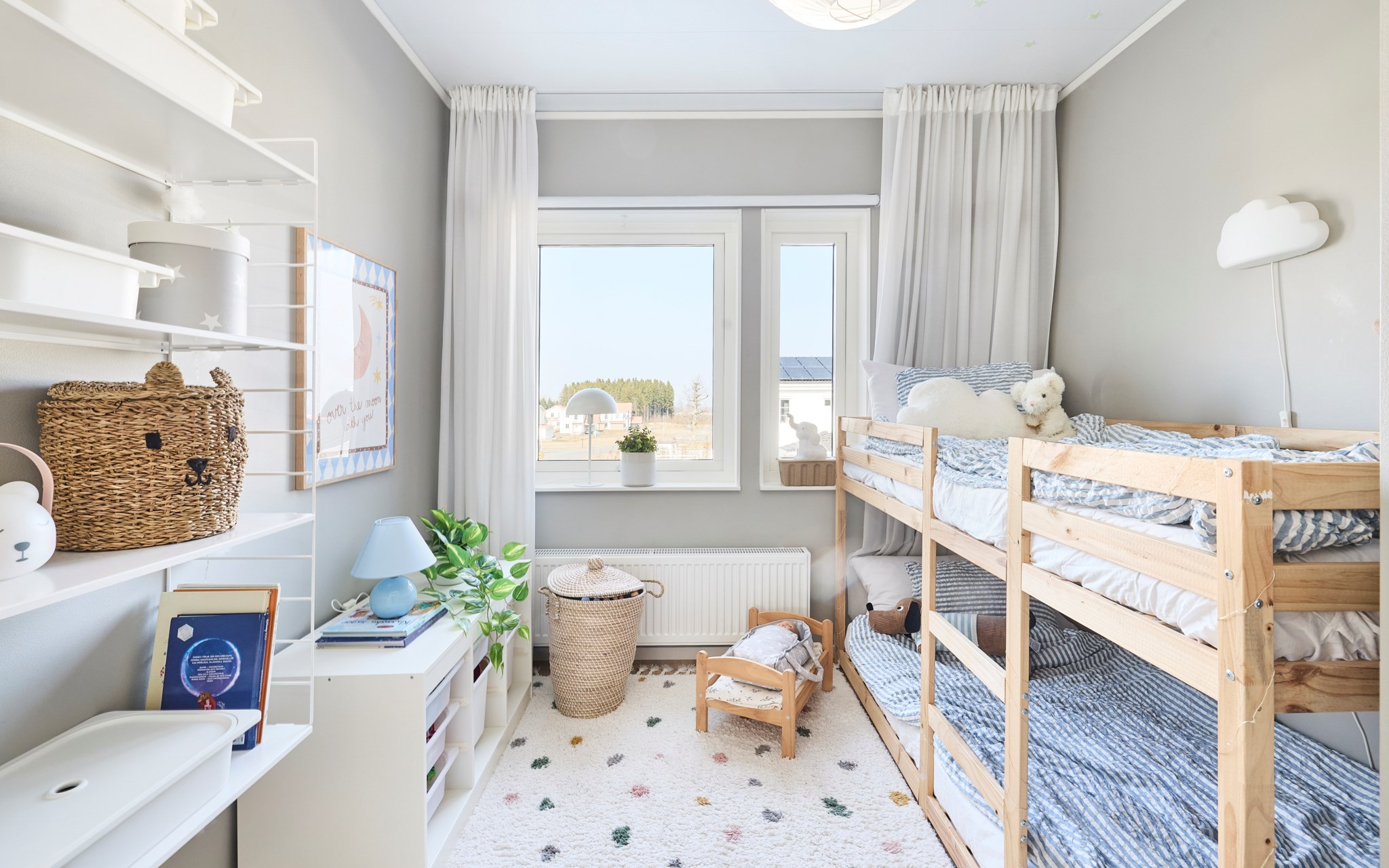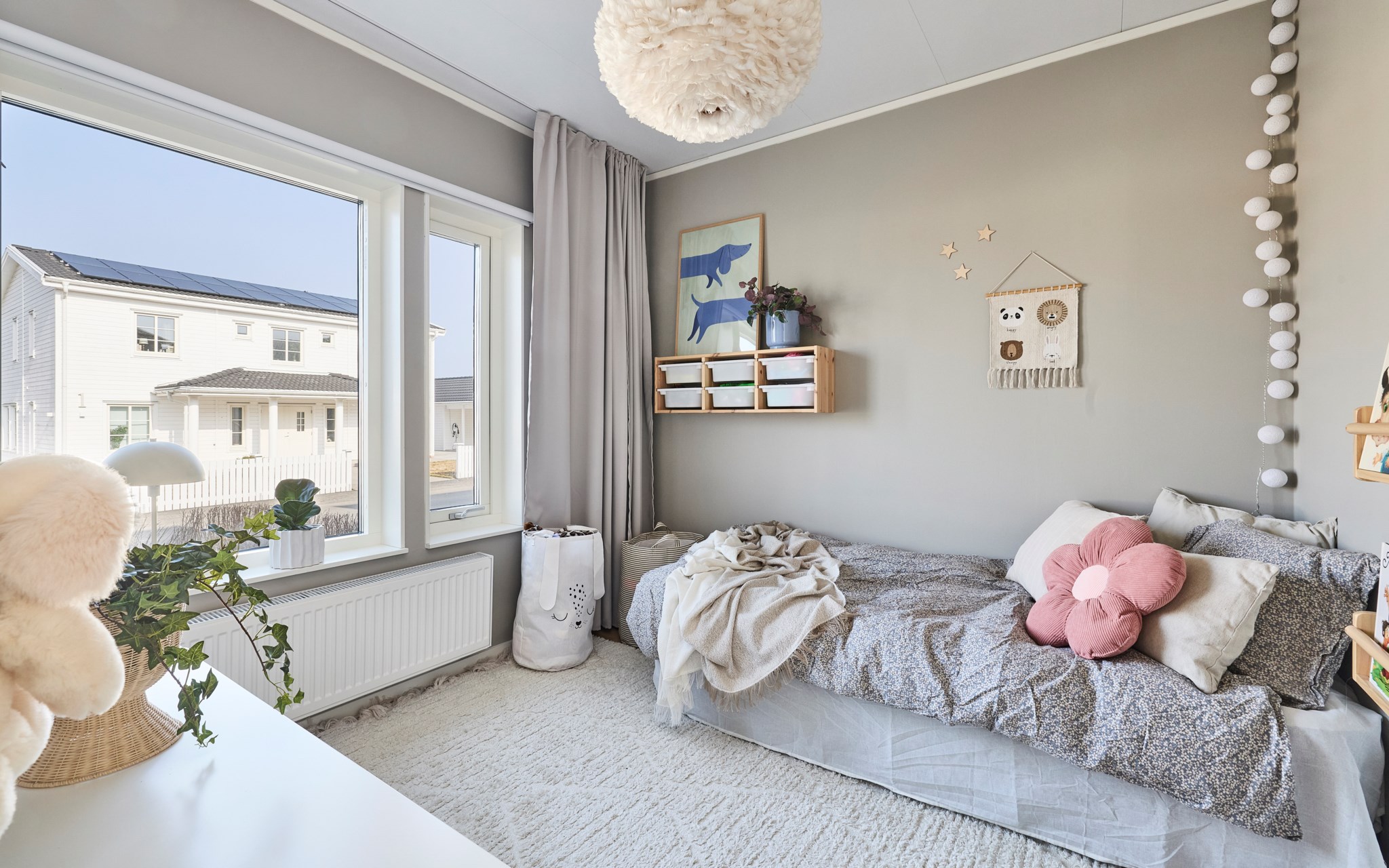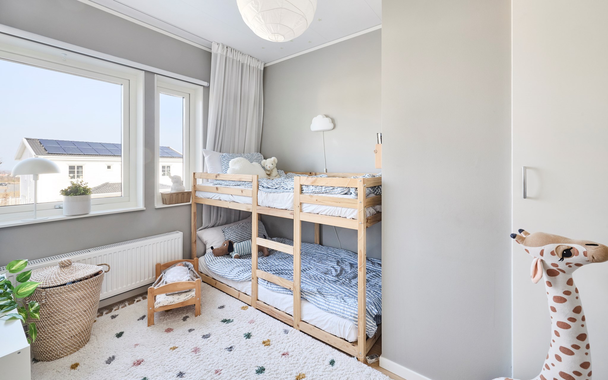 Hemmet har tre sovrum som går att använda flexibelt över tid. På entréplan finns ett rum som idag fungerar som gästrum. Storleken gör att det lika gärna kan bli barnrum, arbetsrum eller ett lugnt sovrum för den som vill. På övervåningen ligger de två andra sovrummen. Det ena används som föräldrasovrum med fönster mot baksidan och gott om plats för en större säng. Det andra är barnrum där två syskon har delat rum med våningssäng, men det funkar så klart lika bra att ställa in en vanlig säng, skrivbord och förvaring. Rummen är enkla att anpassa efter hur livet ser ut just nu.