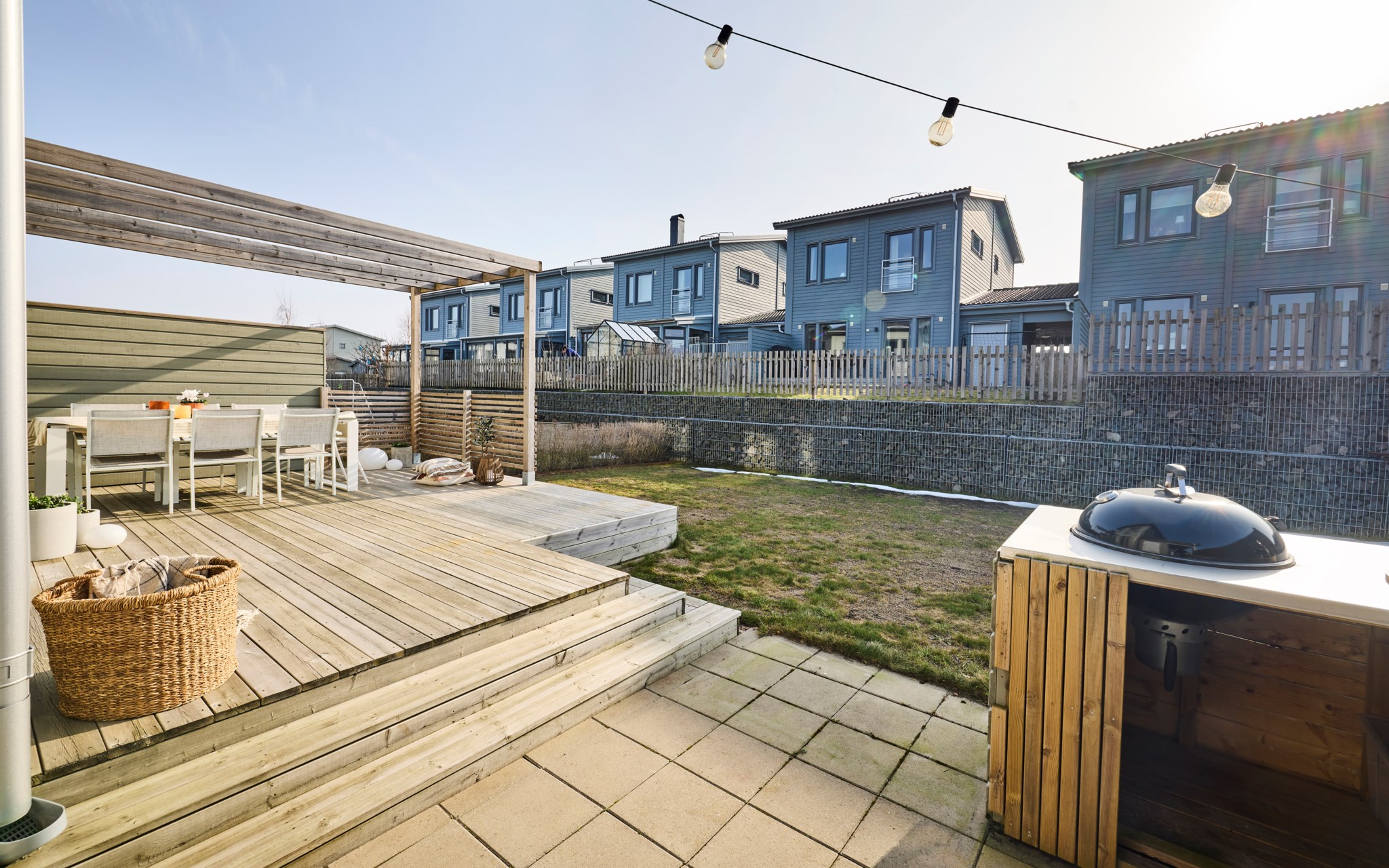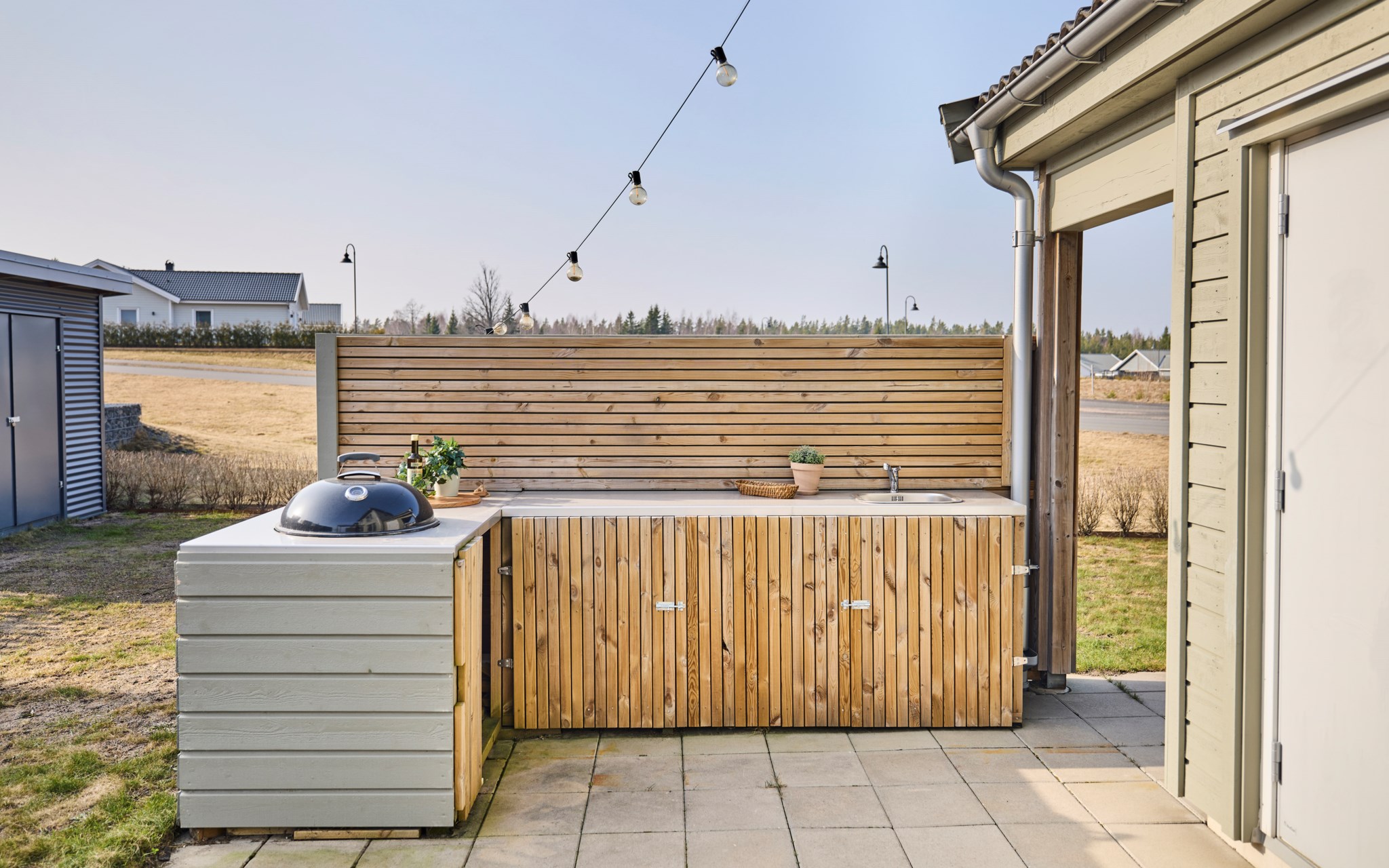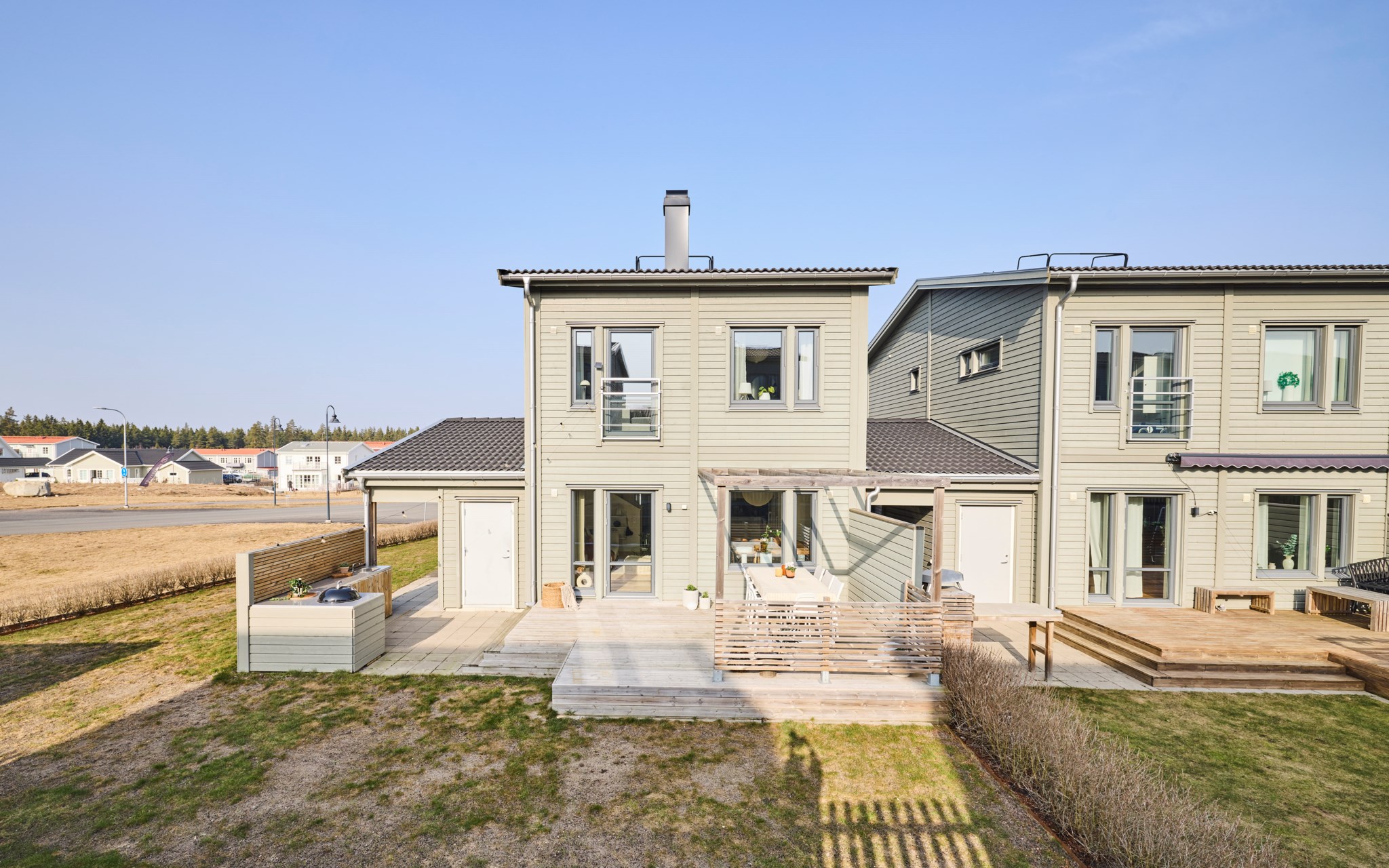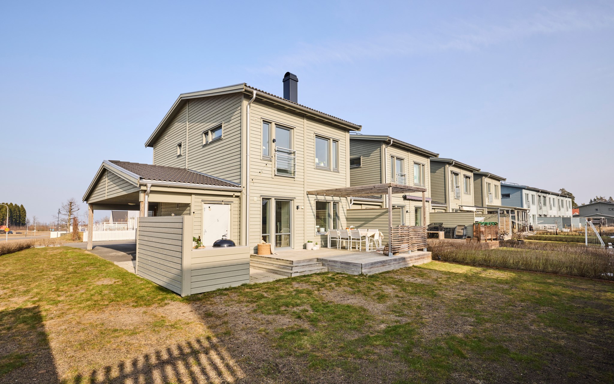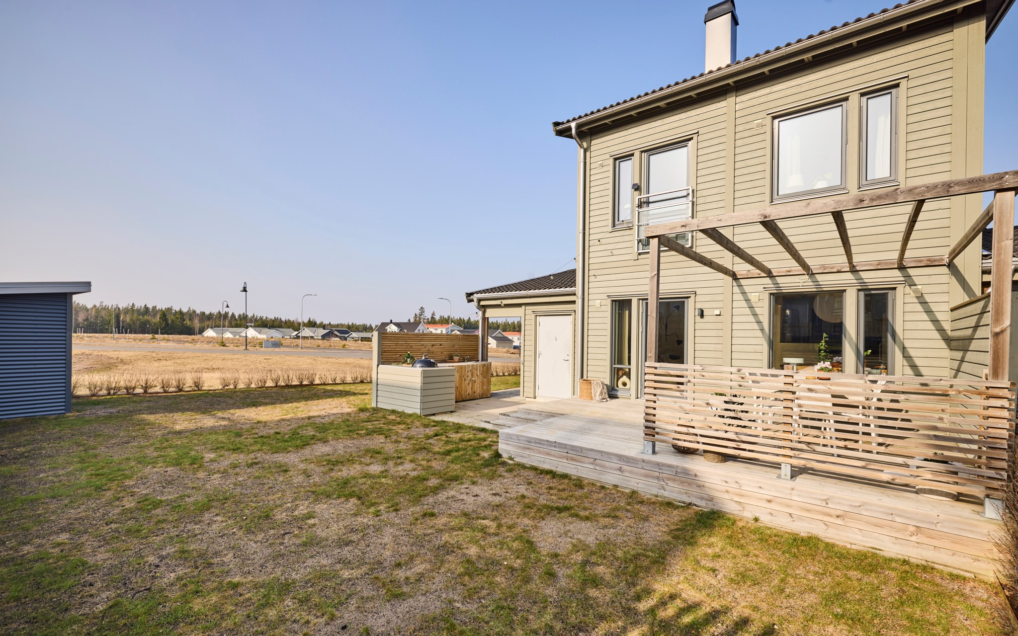 Från vardagsrummet kliver du rakt ut på uteplatsen. Under sommarhalvåret blir den nästan som ett extra rum. Hit kommer solen redan på morgonen och ligger kvar ända till kvällen, vilket gör att platsen gärna används från frukost till sena sommarkvällar. Altanen har byggts ut några kvadratmeter jämfört med standard och den generösa ytan gör det lätt att möblera med både matplats och solstolar. Gillar du matlagning ute? Då kan vi glädja dig med en stabil grillhörna. Runt uteplatsen finns en gräsyta som passar bra för lek eller odling. Häcken i tomtgräns är redan fin, men vill du ha det ännu mer ombonat är det bara att låta den växa sig högre.