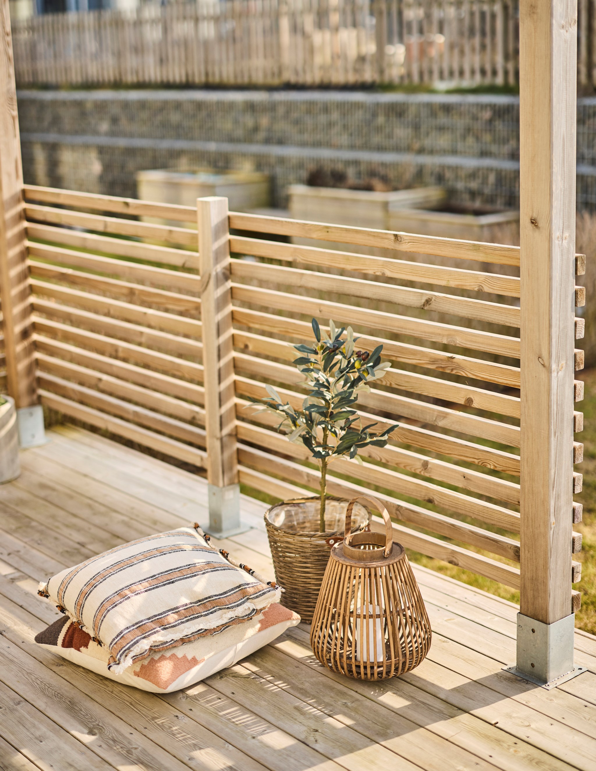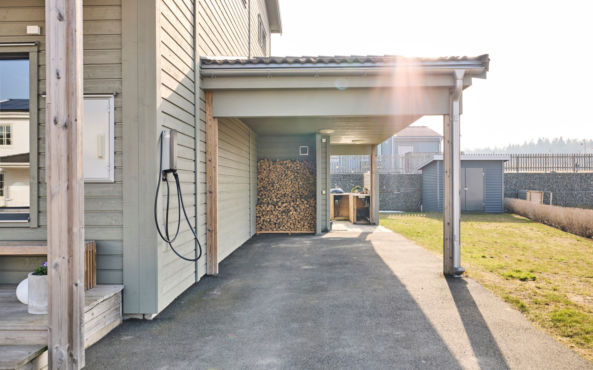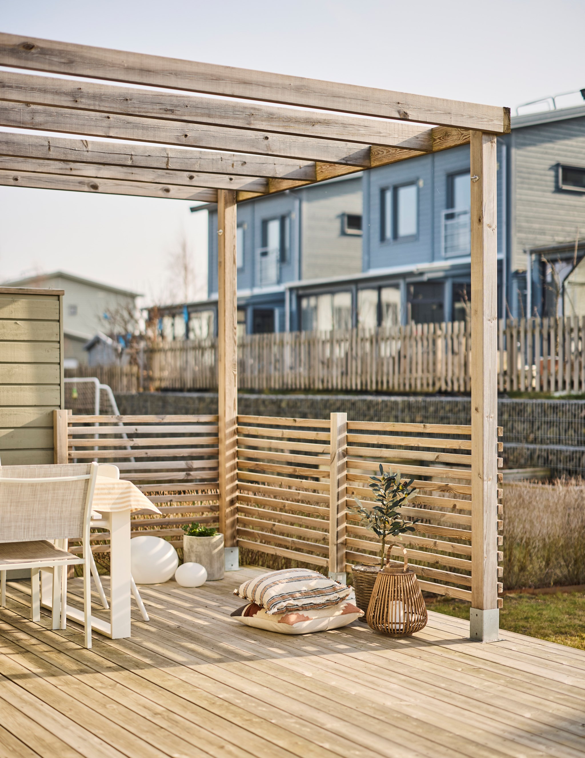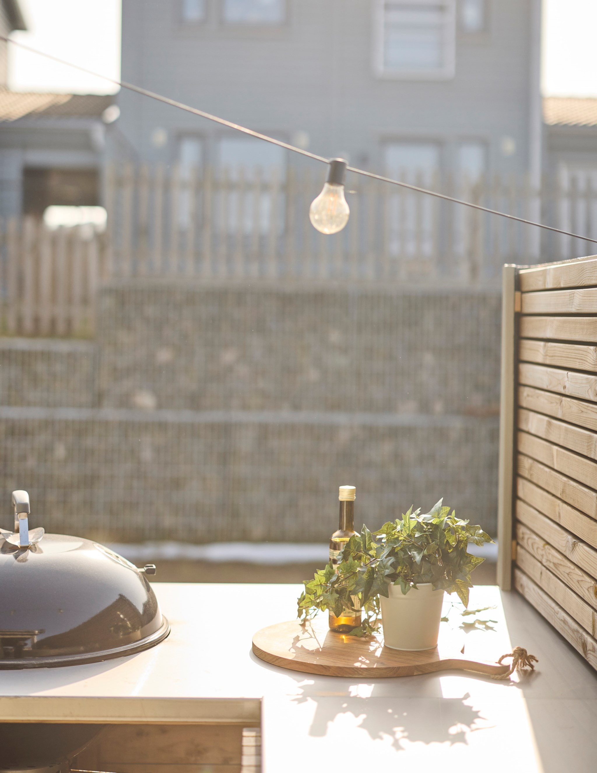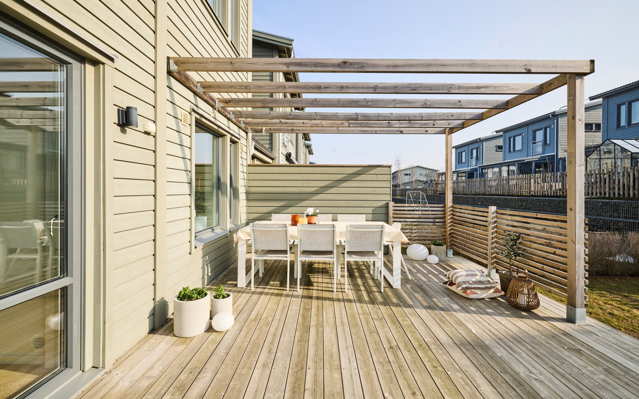 Från vardagsrummet kliver du rakt ut på uteplatsen. Under sommarhalvåret blir den nästan som ett extra rum. Hit kommer solen redan på morgonen och ligger kvar ända till kvällen, vilket gör att platsen gärna används från frukost till sena sommarkvällar. Altanen har byggts ut några kvadratmeter jämfört med standard och den generösa ytan gör det lätt att möblera med både matplats och solstolar. Gillar du matlagning ute? Då kan vi glädja dig med en stabil grillhörna. Runt uteplatsen finns en gräsyta som passar bra för lek eller odling. Häcken i tomtgräns är redan fin, men vill du ha det ännu mer ombonat är det bara att låta den växa sig högre.