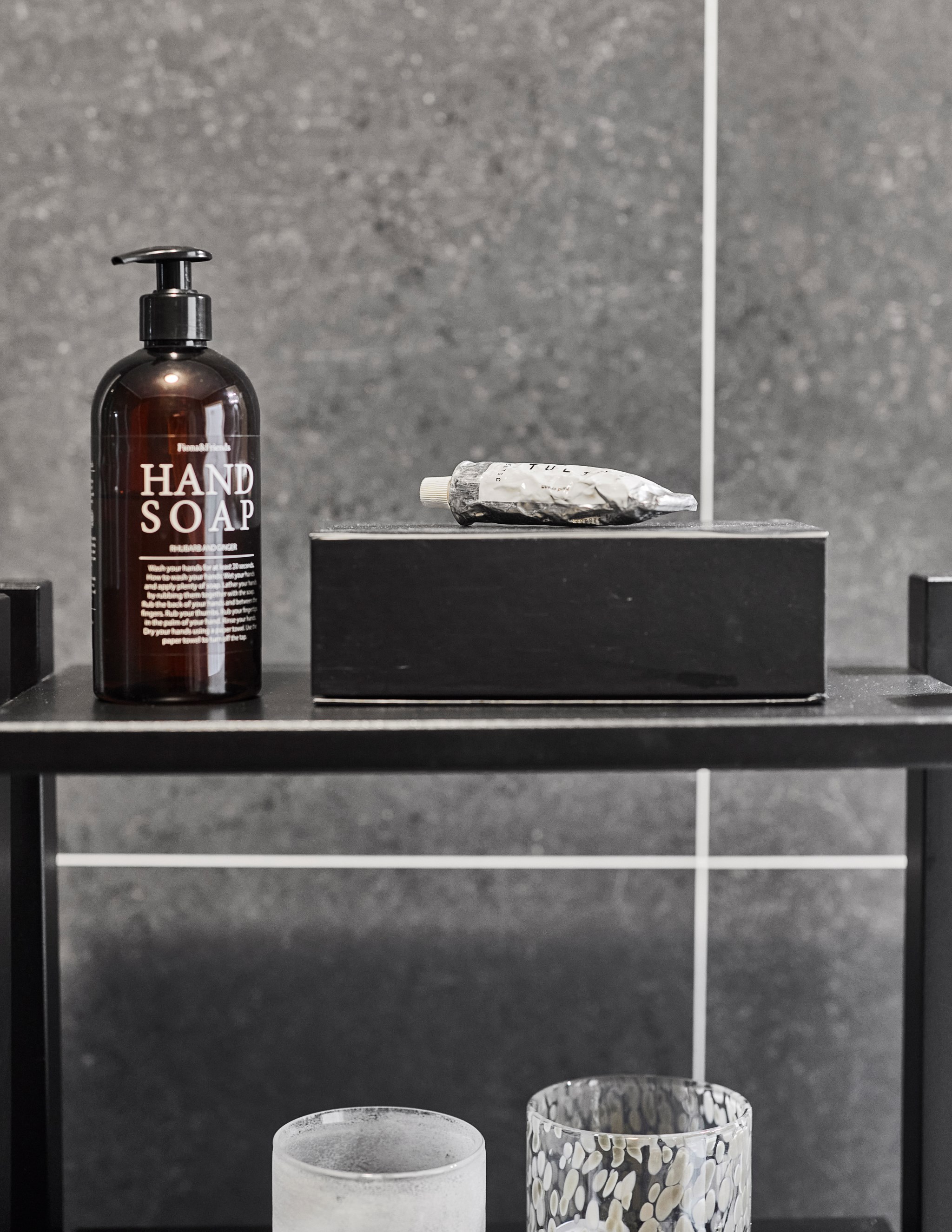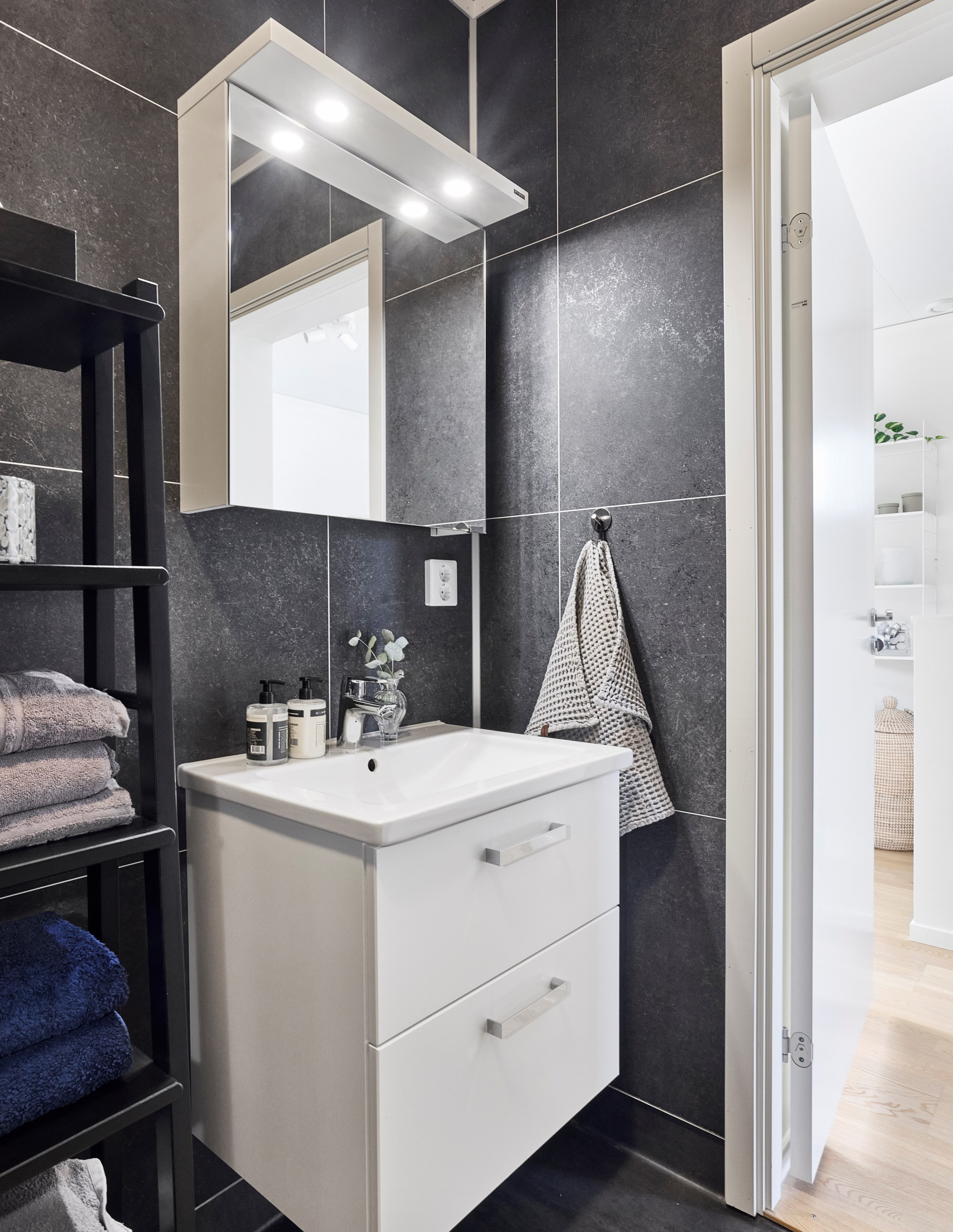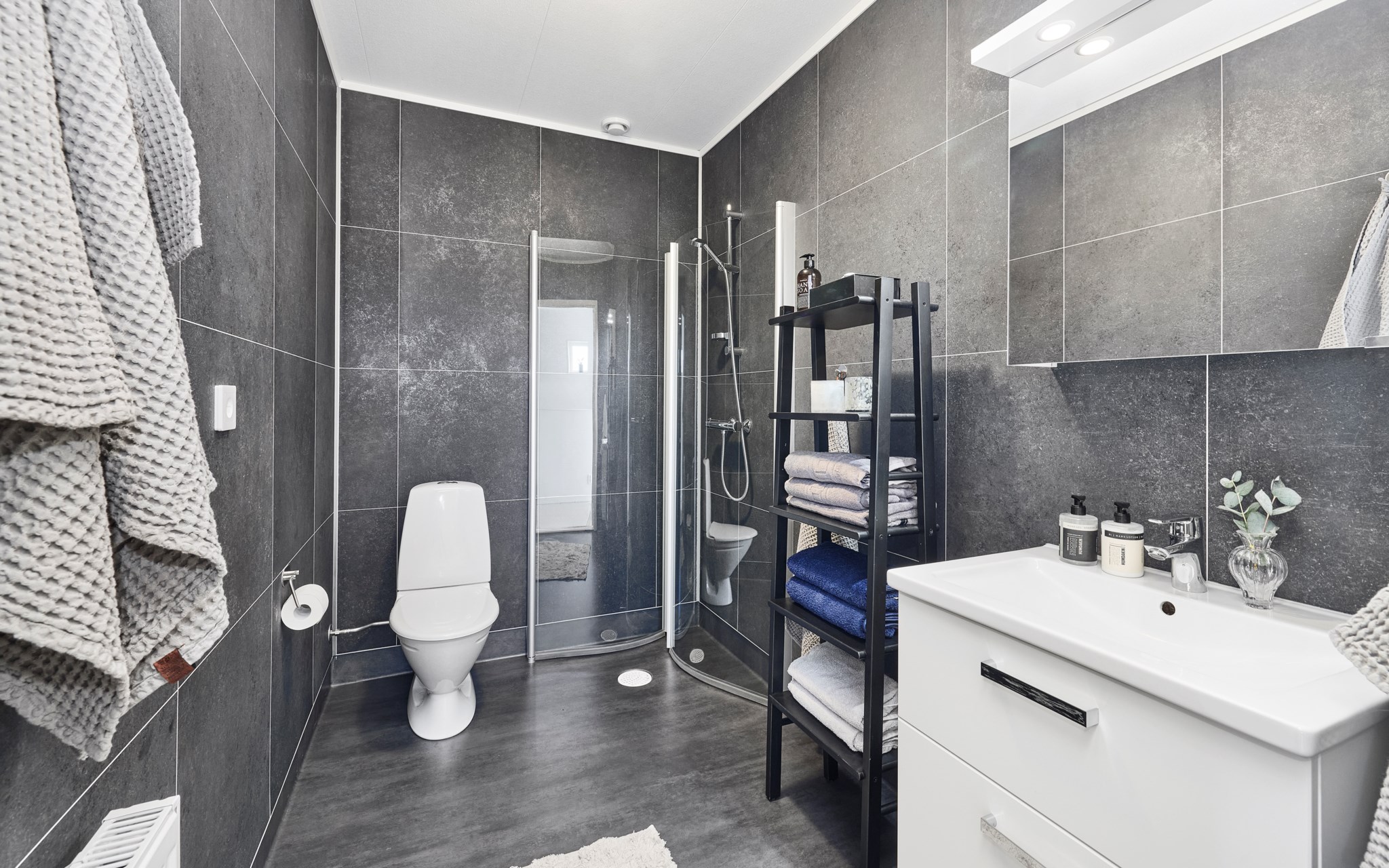 Huset har två badrum, ett på varje plan. På entréplan ligger ett rymligt badrum som även agerar tvättstuga. Här finns dusch, gott om arbetsyta vid handfatet och plats för både tvättmaskin och torktumlare, vilket gör det praktiskt i vardagen. En trappa upp ligger det andra badrummet. Här valde säljarna en mörkare kakelsättning än standard, vilket ger rummet en lite mer ombonad känsla. Storleken gör att det funkar bra även när flera gör sig i ordning samtidigt, något som varit uppskattat i familjens morgonrutiner.