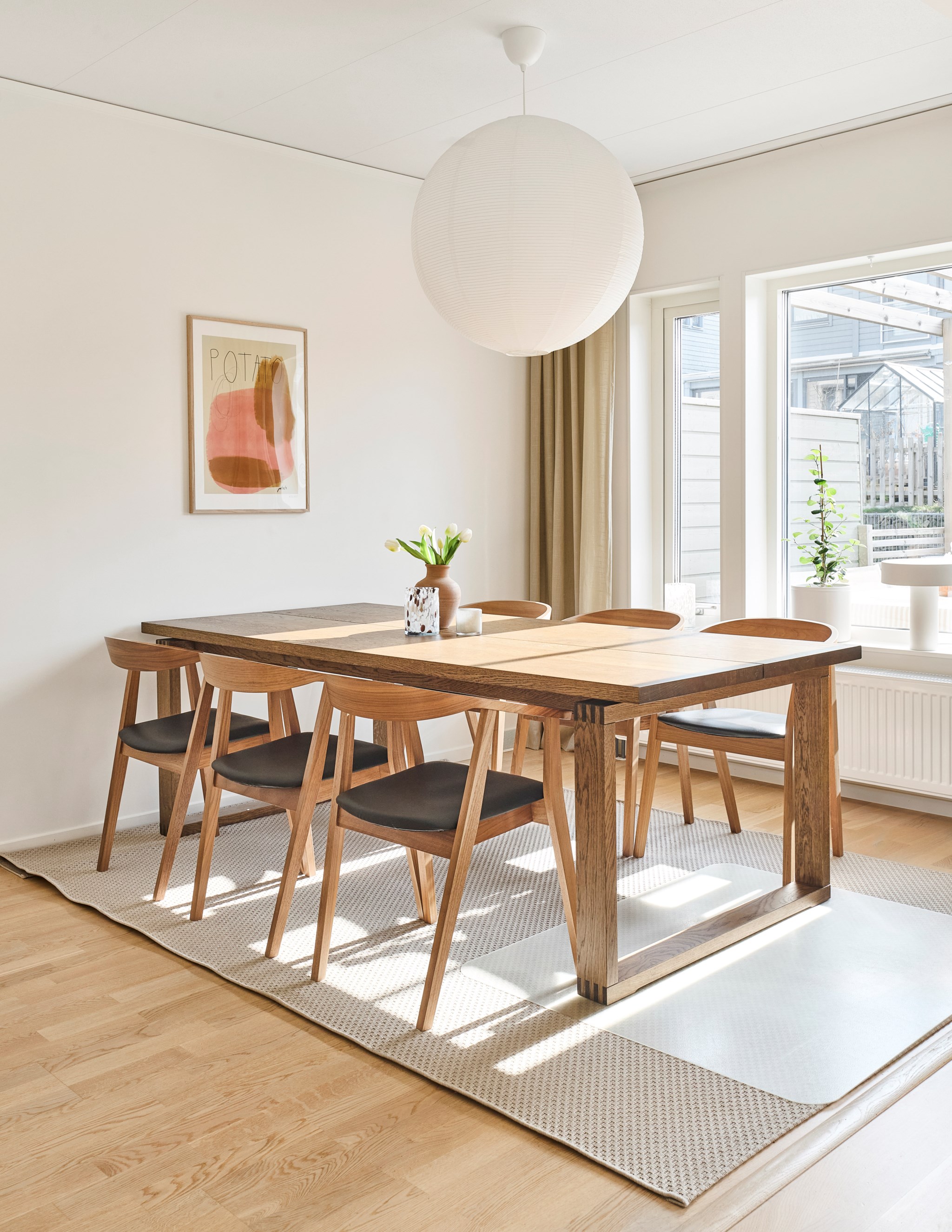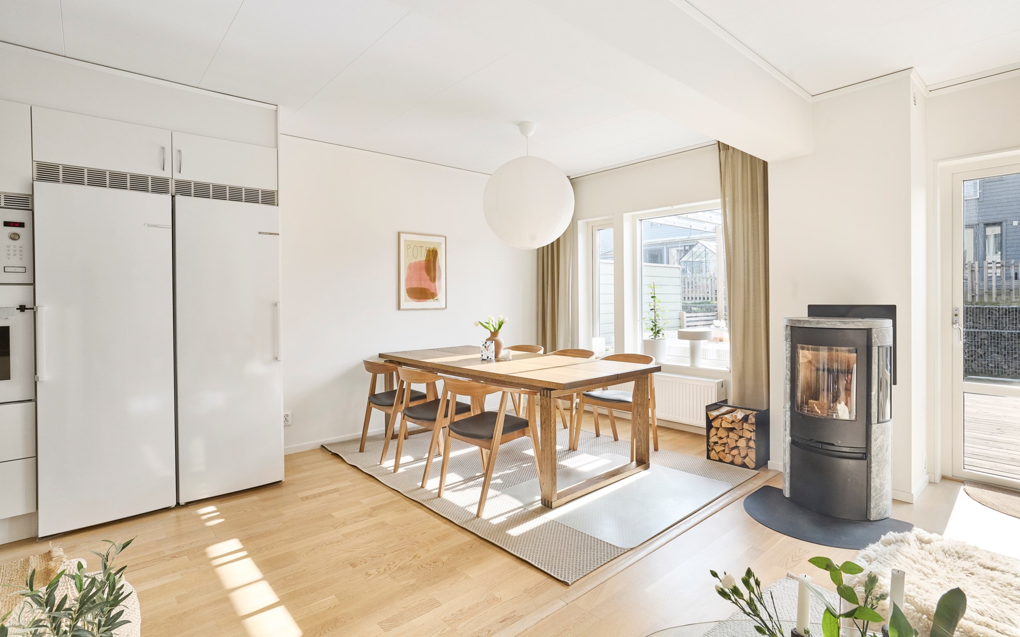 Vardagsrummet ligger i öppen anslutning till kök och matplats men har ändå en egen, lugn zon. Här hamnar familjen ofta tillsammans. Någon sitter i soffan, någon står kvar i köket och barnen kan pyssla vid bordet utan att ni tappar kontakten med varandra. Kaminen var ett av husets tillval när det byggdes och har blivit en självklar del av rummet. Och när brasan är tänd förändras stämningen direkt, särskilt under årets kallare månader. De stora fönstren och glasdörren mot uteplatsen släpper in generöst med ljus och gör att rummet känns öppet och luftigt.