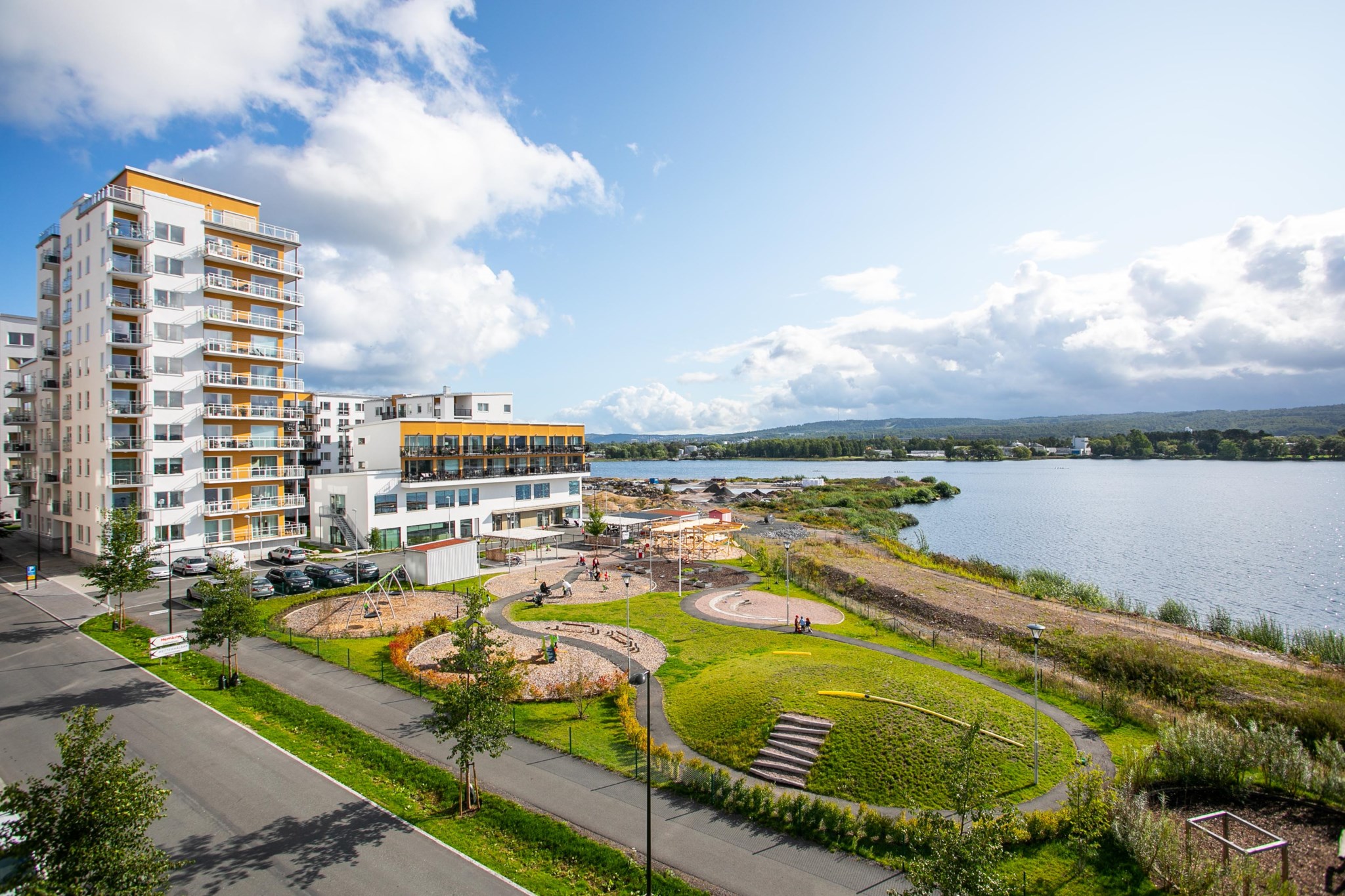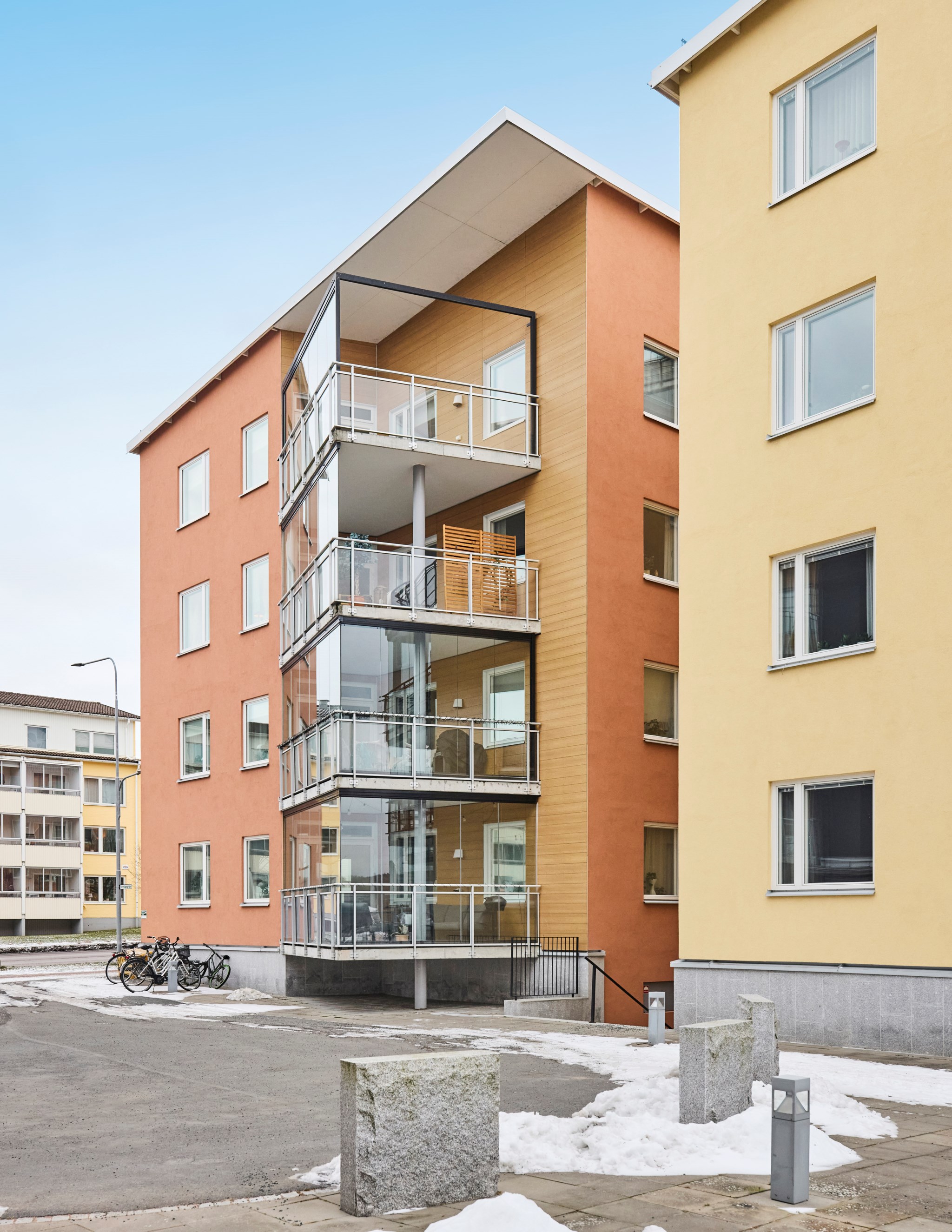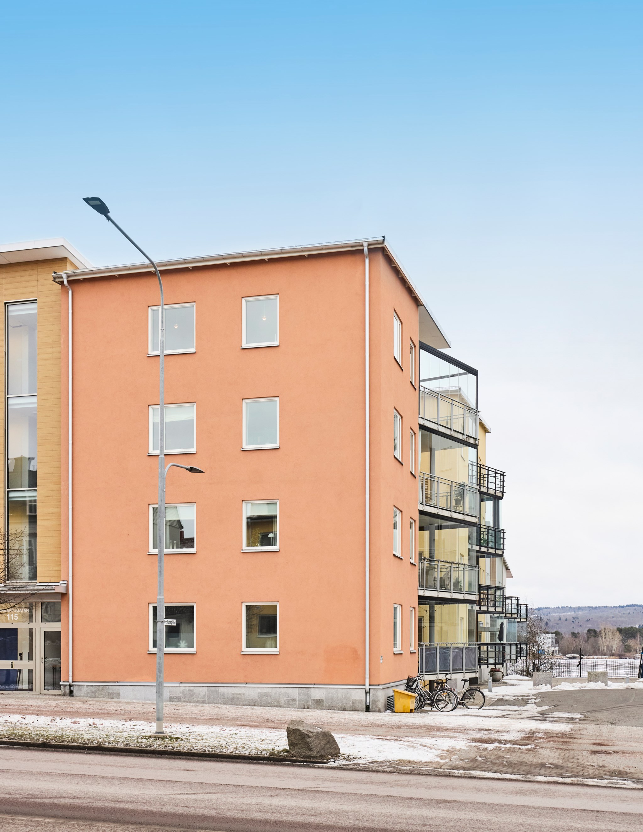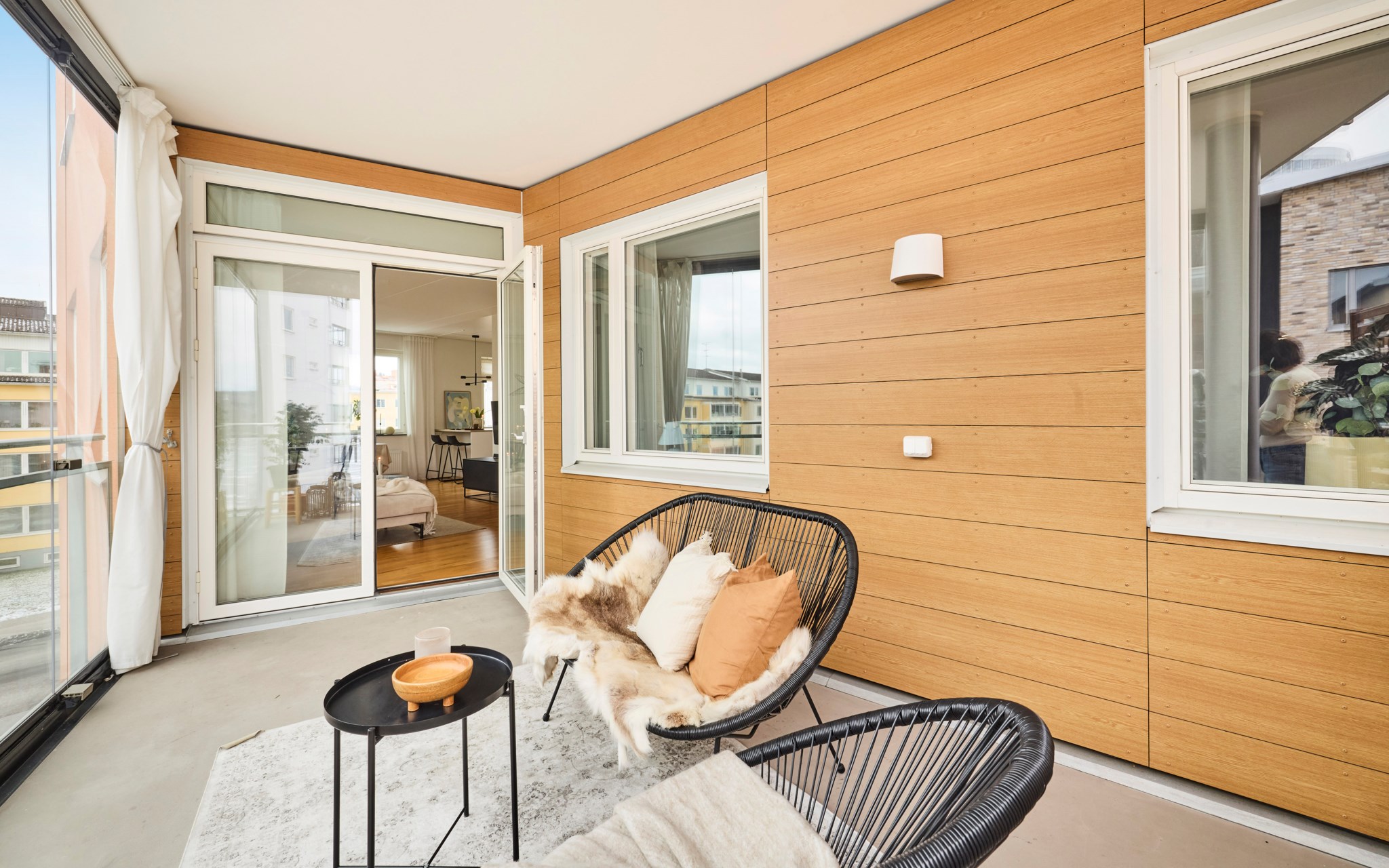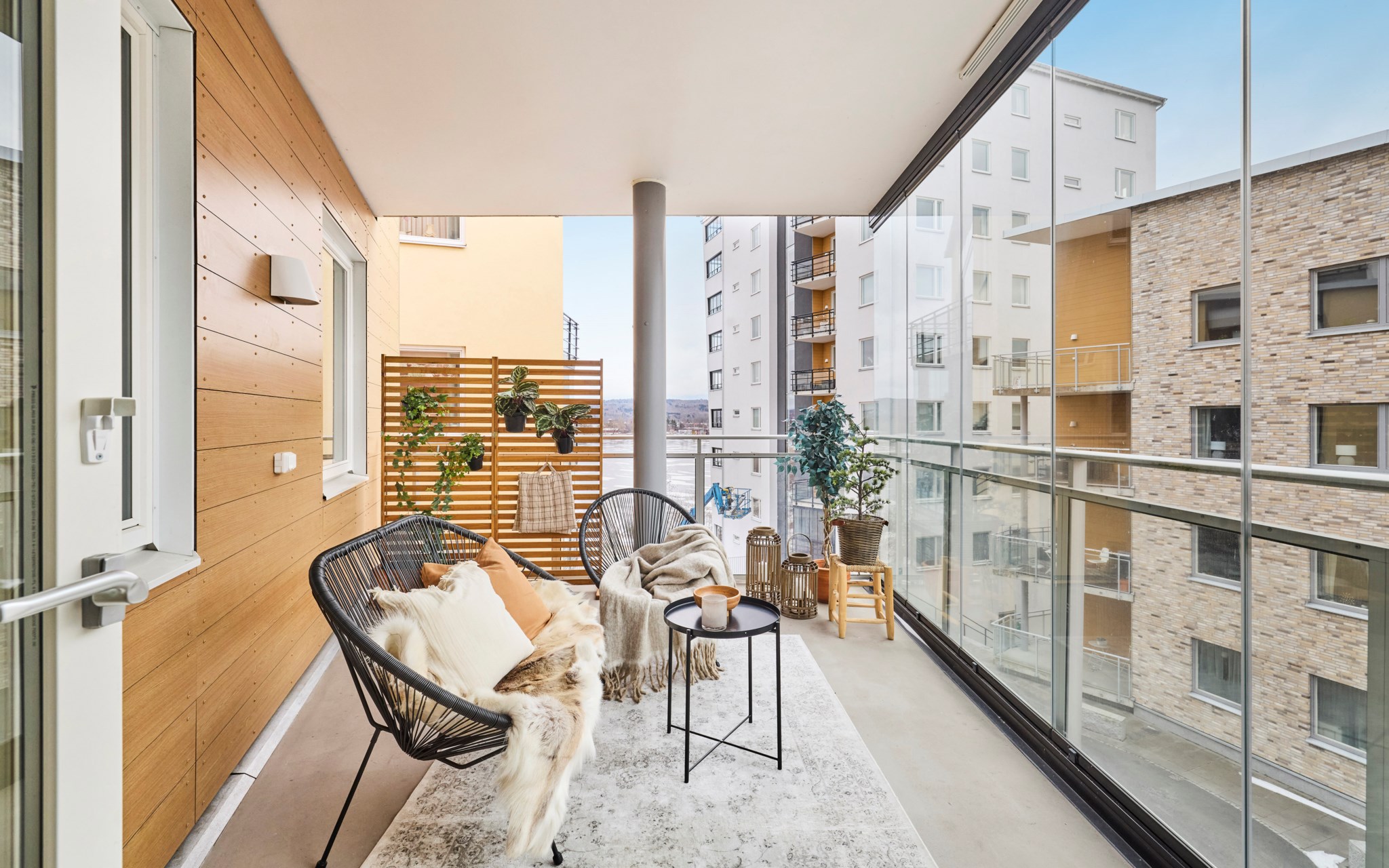 Från vardagsrummet når du balkongen som blir ett härligt extrarum under sommaren. Den är generöst tilltagen och skyddad av glaspartier, vilket gör den behaglig även när det blåser. Läget högt upp ger en fin känsla av avskildhet, med en fin glimt av sjön mellan husen.