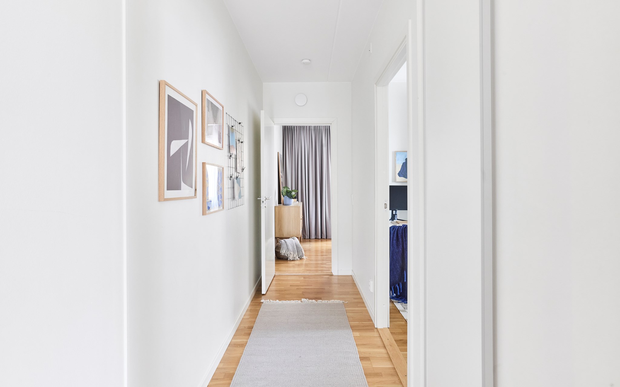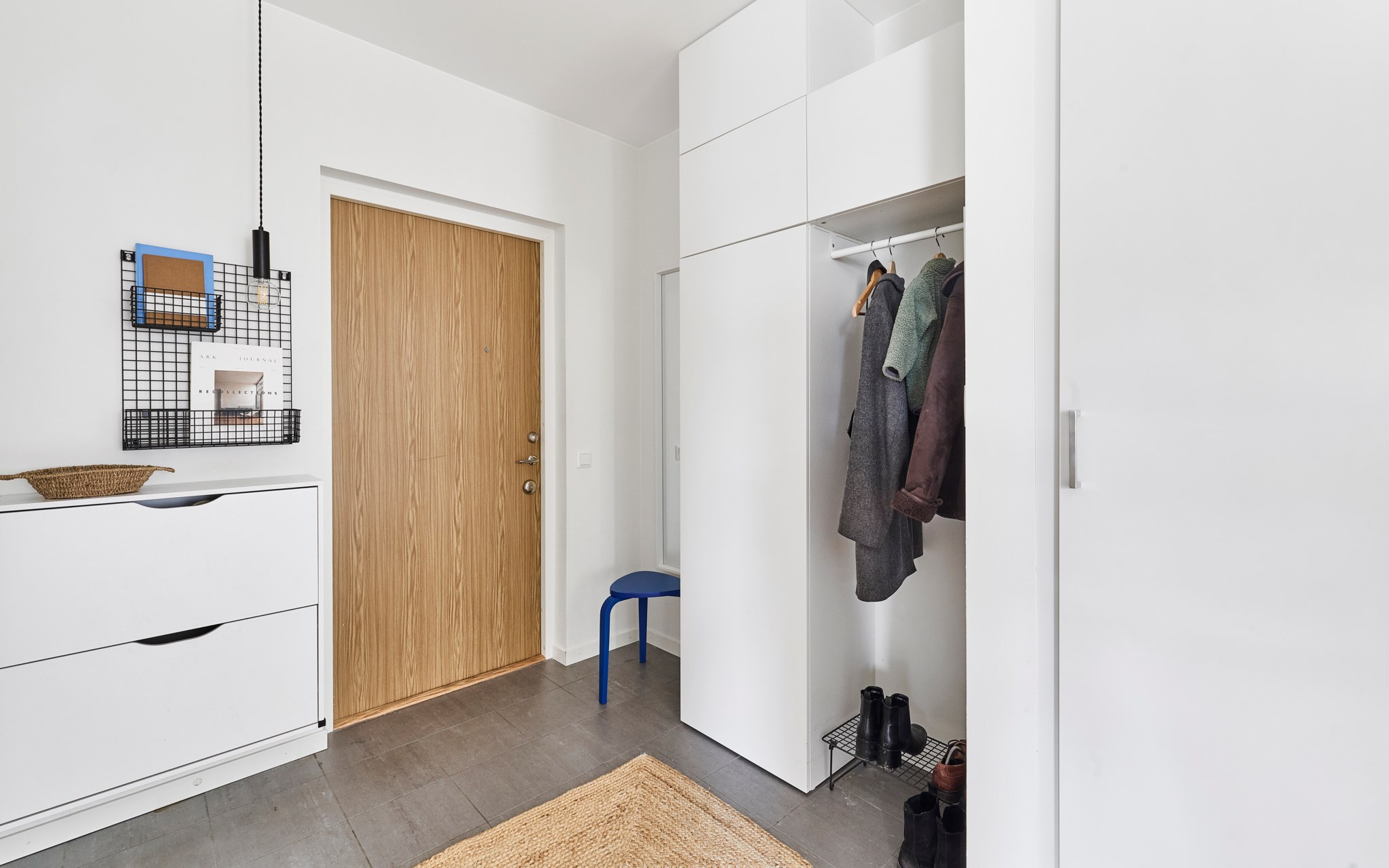Här möts du av en hall som faktiskt fungerar i vardagen. Inte bara en passage, utan en plats där det finns plats för både skor och jackor, och som är lätt att hålla ordning. Den platsbyggda förvaringen smälter in fint i rummet och är medvetet grundare, för att ge mer golvyta men ändå rymma ytterkläder och säsongens plagg. Skjutdörrsgarderoberna lite längre in gör det lätt att hålla hallen lugn även när livet pågår. Till detta finns ett generöst förråd om cirka 8–9 kvadratmeter på våning tre, perfekt för allt som inte behöver stå framme.