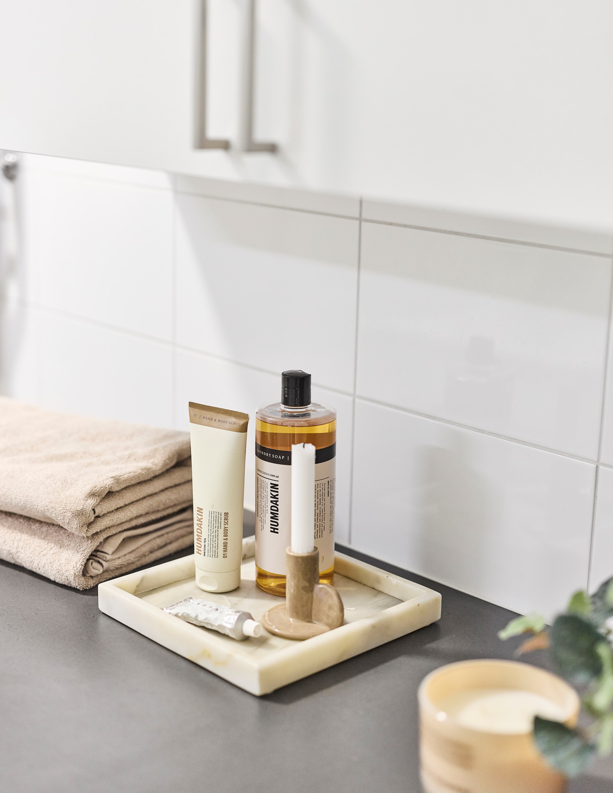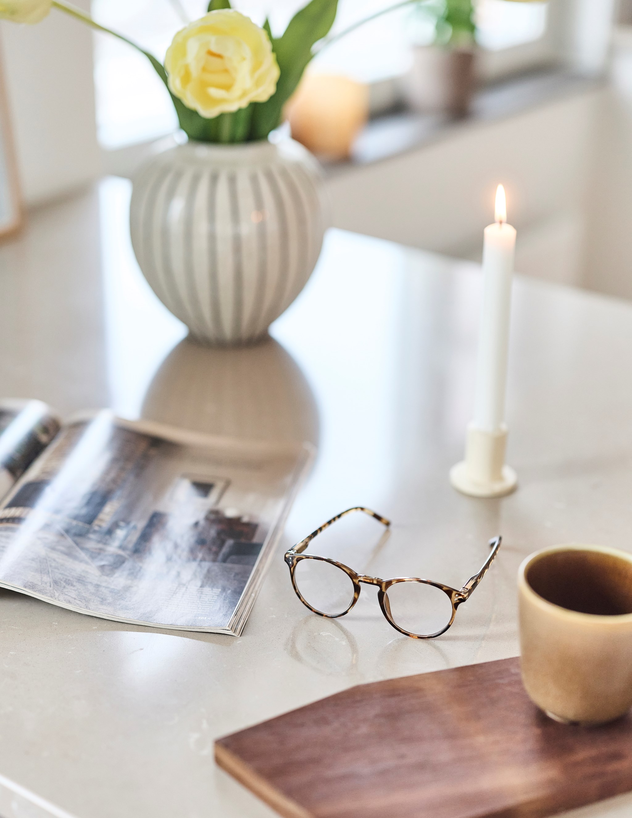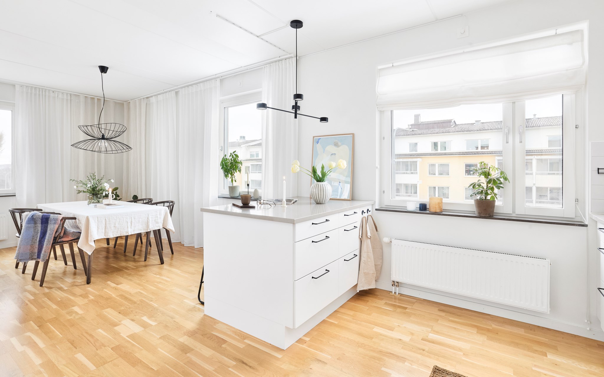 Under 2021 fick köket ett lyft med bland annat ett tillskott av en köksö, som har blivit en naturlig social samlingspunkt. På köksön och övriga köksbänkar ligger en slitstark och ljus kvartskomposit, ett exklusivt intryck tillsammans med de nya handtagen.