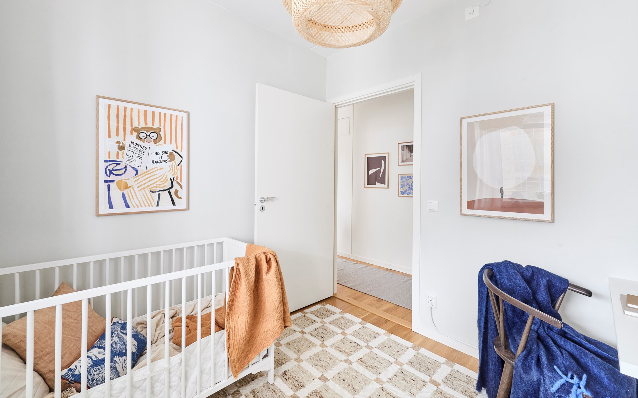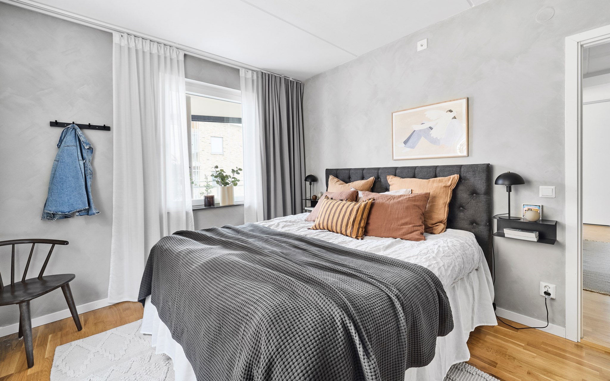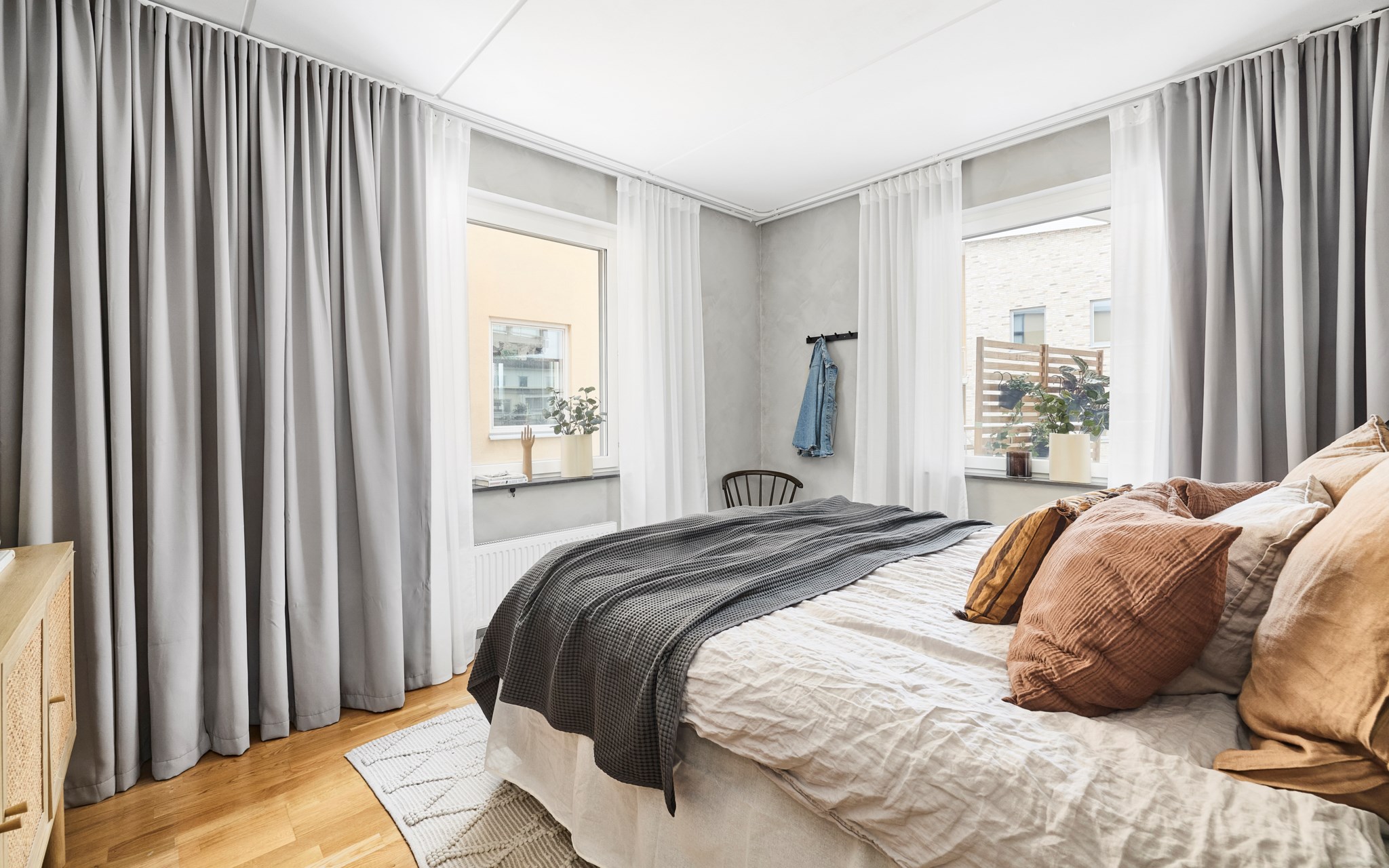 Sovrummen ligger samlade i en mer privat del av lägenheten, avskilt från de sociala ytorna. Det större sovrummet har plats för dubbelsäng, sängbord och förvaring, samtidigt som fönster i två riktningar ger ett mjukt ljus och en lugn atmosfär. Här har säljarna valt att ta bort en tidigare garderob för att skapa mer rymd, men behöver du mer förvaring finns möjlighet att åter sätta in en hög garderob om behovet finns. Väggarna är nyligen målade i en varm kalkfärg som förstärker känslan av vila och gör rummet lätt att landa i.