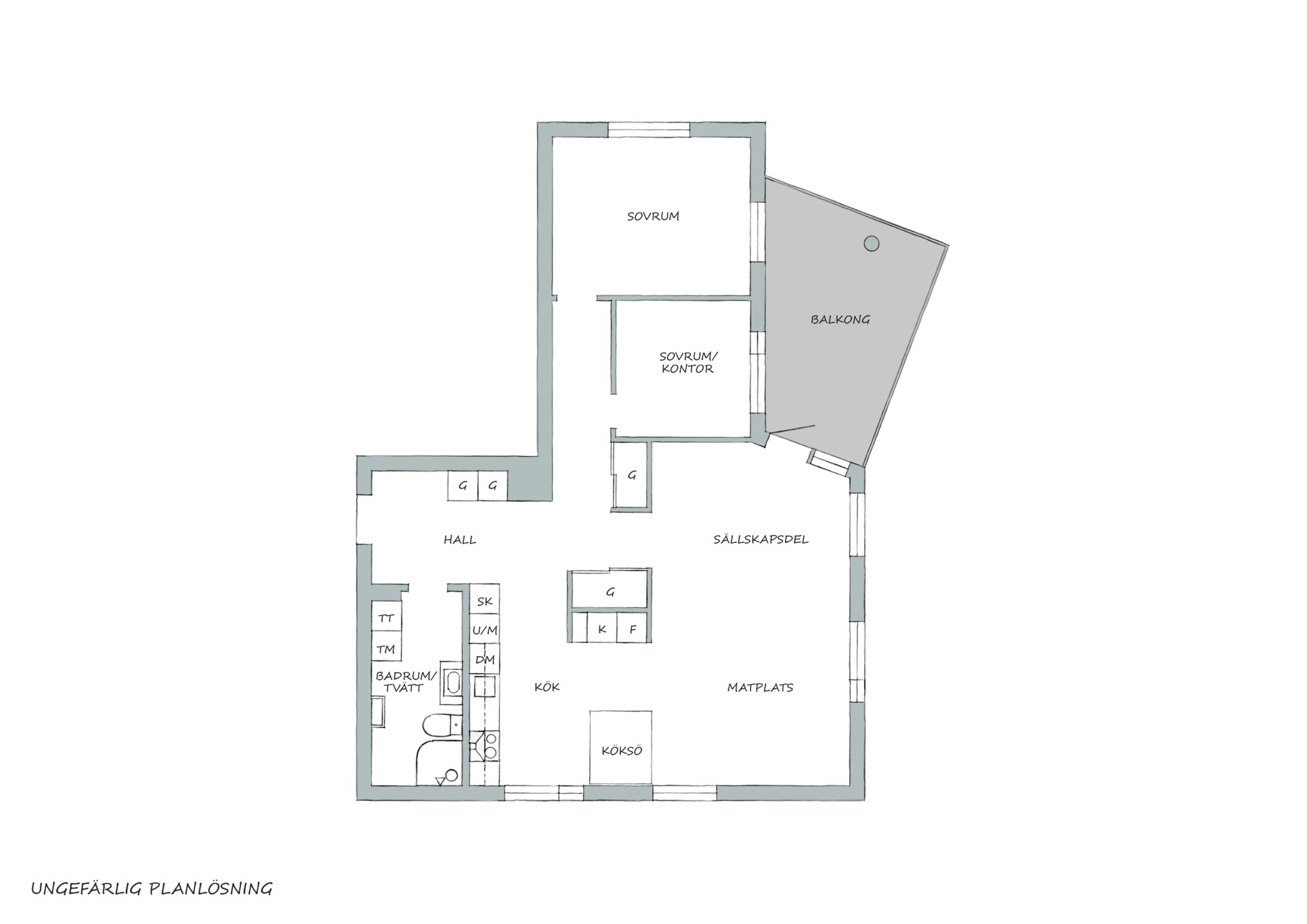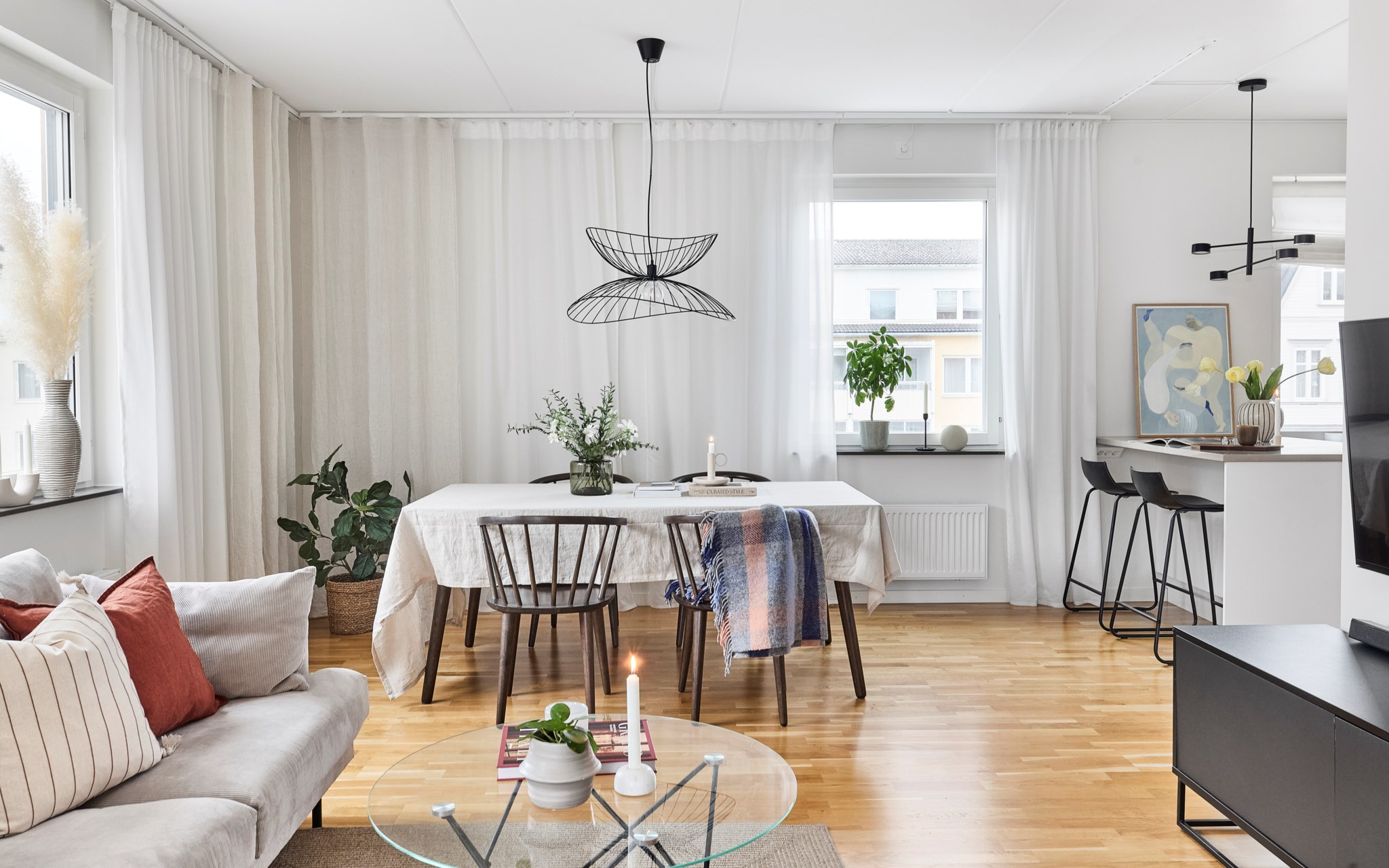 Vardagsrummet är ljust, luftigt och lätt att möblera. Takhöjden på runt 2,6 meter och de generösa fönsterpartierna ger rummet en öppen känsla, samtidigt som planlösningen skapar naturliga zoner för både soffgrupp och umgänge. Blicken dras direkt mot ljuset och vidare ut mot balkongen, vilket gör att rummet upplevs större än vad kvadratmetrarna säger. Här finns gott om plats att samla vänner, men också möjlighet att dra sig tillbaka och bara vara.