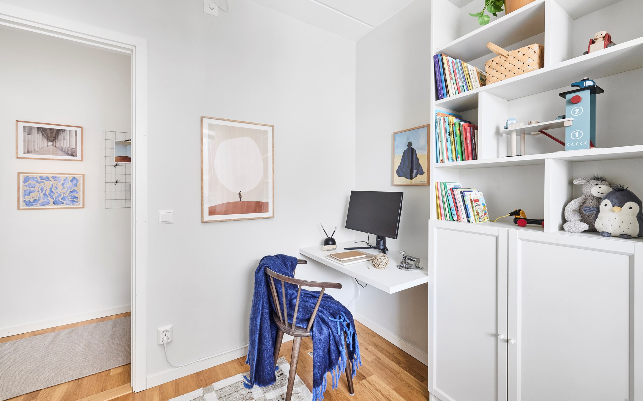 Det mindre sovrummet används idag som kombinerat barnrum och hemmakontor. Ett bra extrarum som enkelt förändras i takt med livet, oavsett om behovet är barnrum, kontor eller gästrum.
