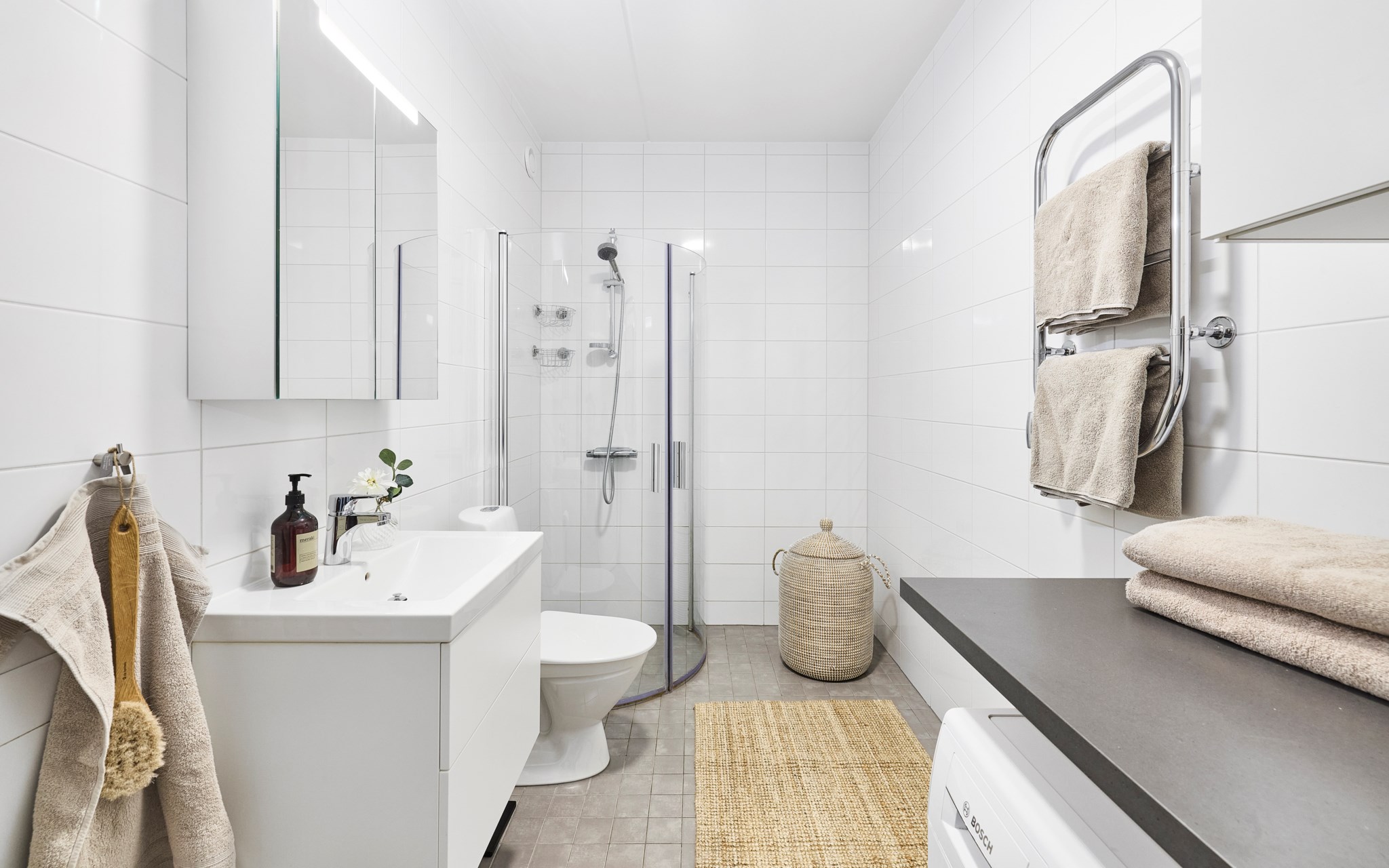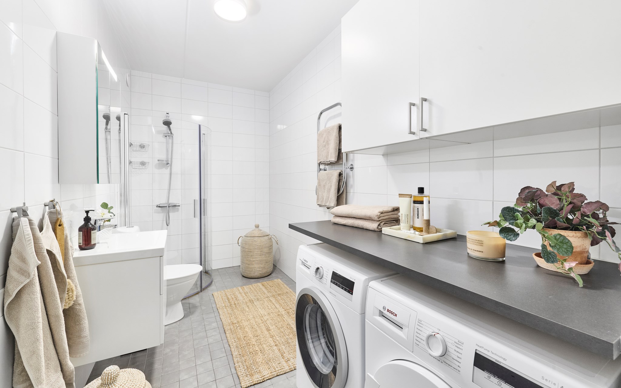 Badrummet ligger direkt till höger i hallen. Ett rymligt och funktionellt rum som kombinerar badrum och tvätt på ett sätt som verkligen fungerar i vardagen. Här finns dusch med glasväggar, wc och handfat, tillsammans med tvättmaskin och torktumlare placerade under en praktisk arbetsbänk. Gott om väggyta ger plats för både skåp och avhängning, vilket gör det enkelt att hålla ordning.