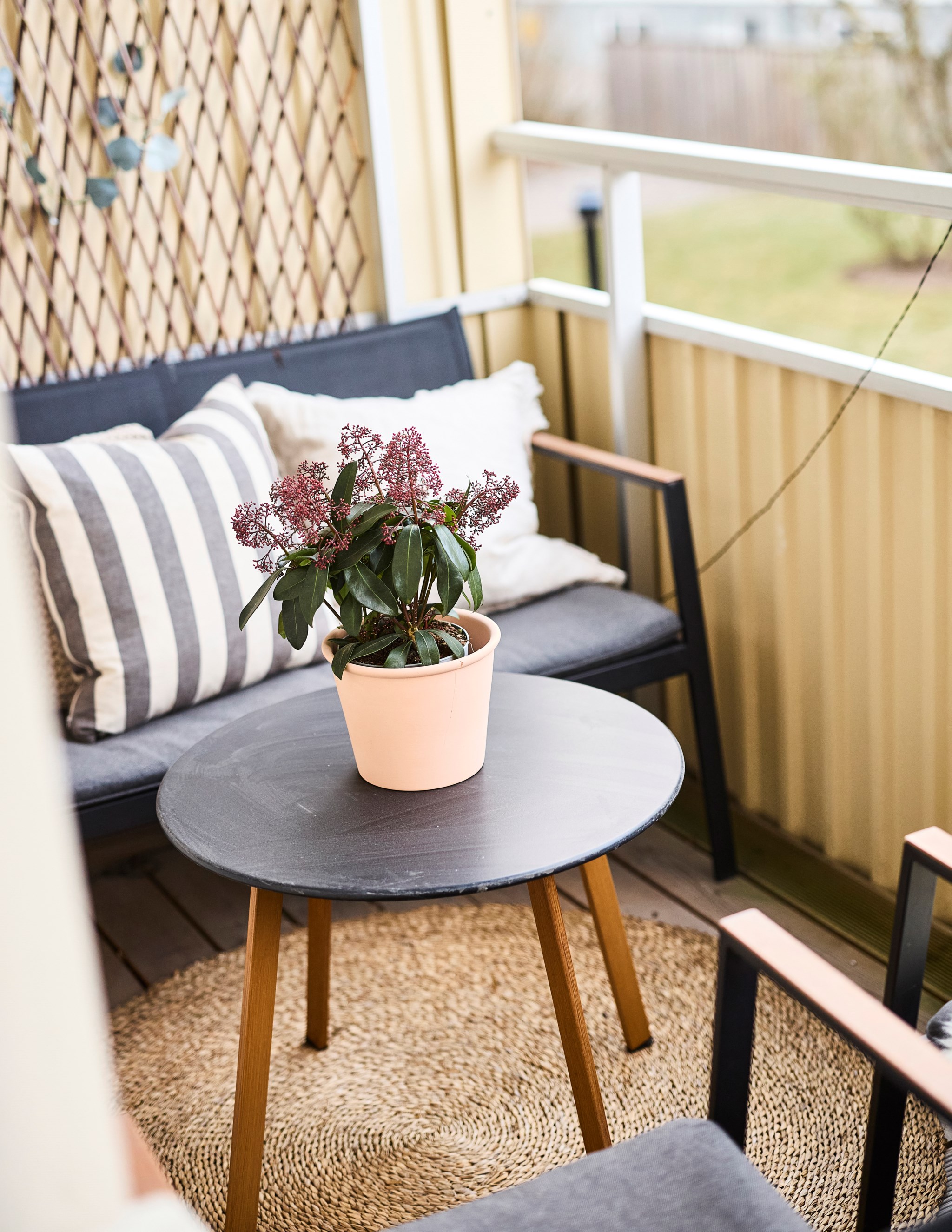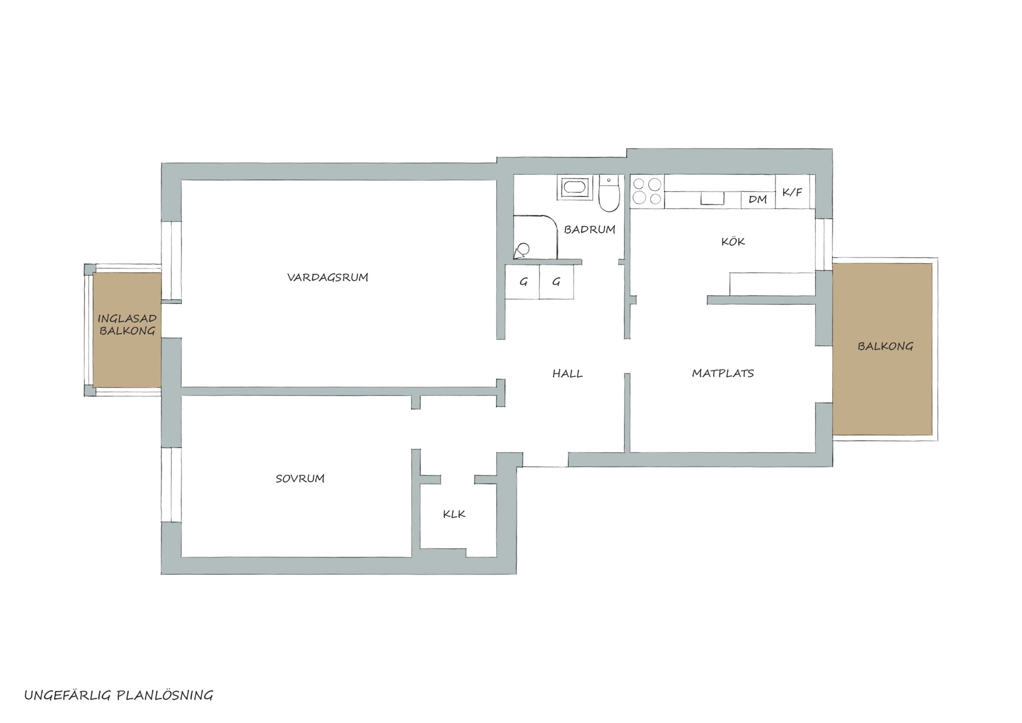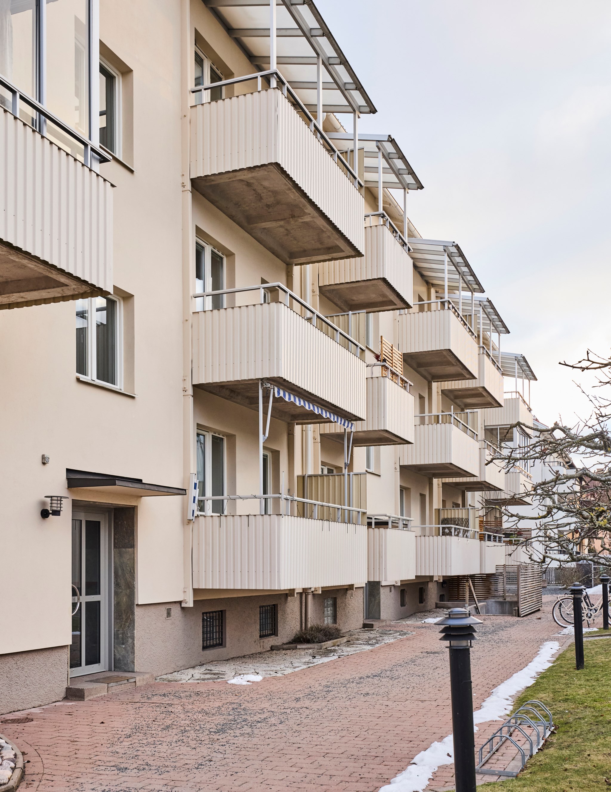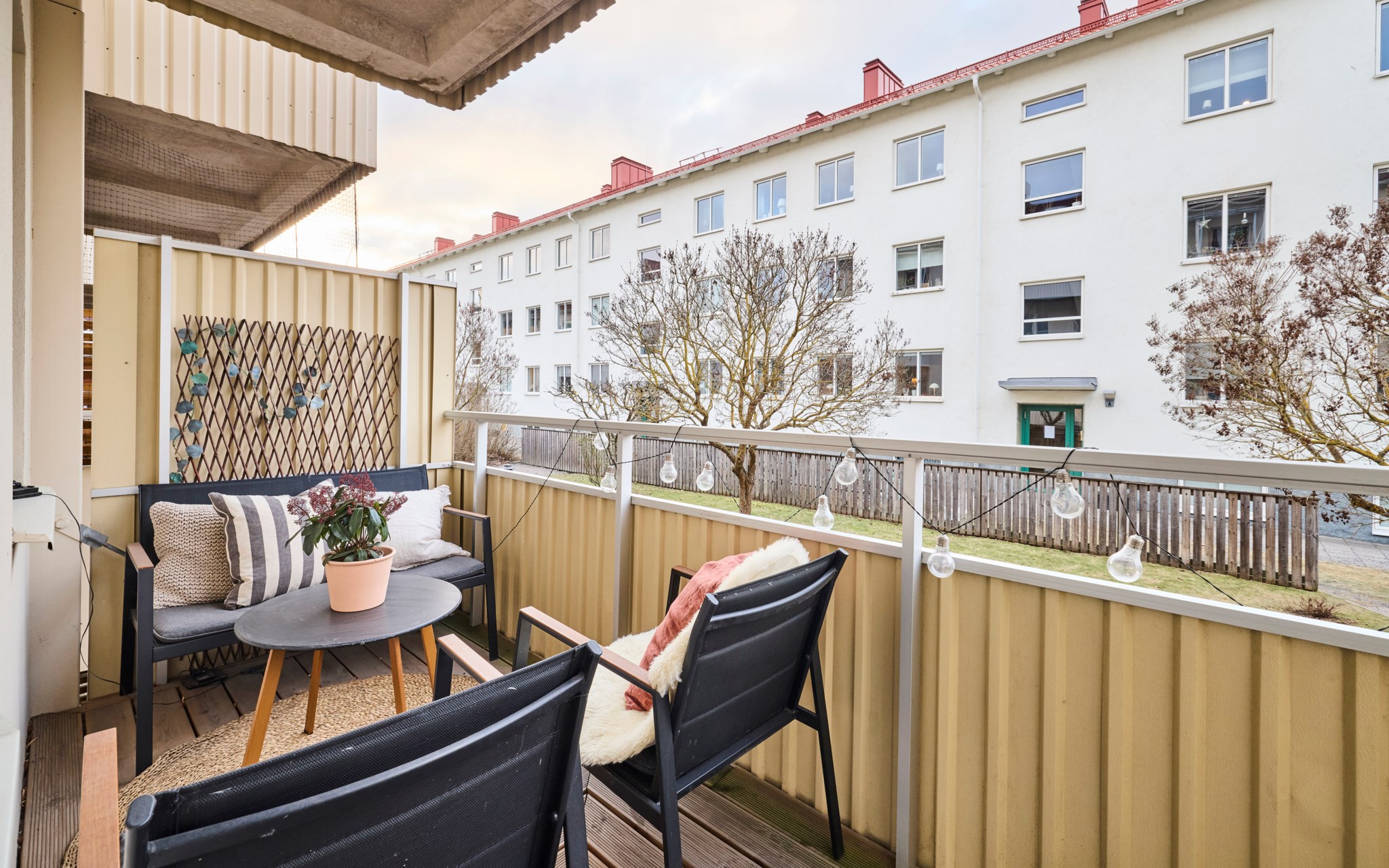 Det gäller att välja lägenhet och balkong efter vilken typ av människa man är. Här är det överlägsen fördel för kvällsmänniskan kan man säga. Lugnt läge för två att titta djupt i bubblande glas, eller djupt in i varandras ögon. Sol från eftermiddagen och en bra stund mot kvällskvisten, lite olika beroende på tid på året såklart. Huset mitt emot stjäl inte solen på kvällen eftersom gatunätet öppnar sig som en tårtbit precis här. Lägenheten har alltså två balkonger, och föreningen har satsat på nya lite större balkonger mot gården, där du kommer sitta både länge och väl. Lilla balkongen mot morgonsolen är inglasad och har använts mest som växthus av nuvarande ägare. Tomaterna växer villigt och rodnar snabbt rapporteras det.