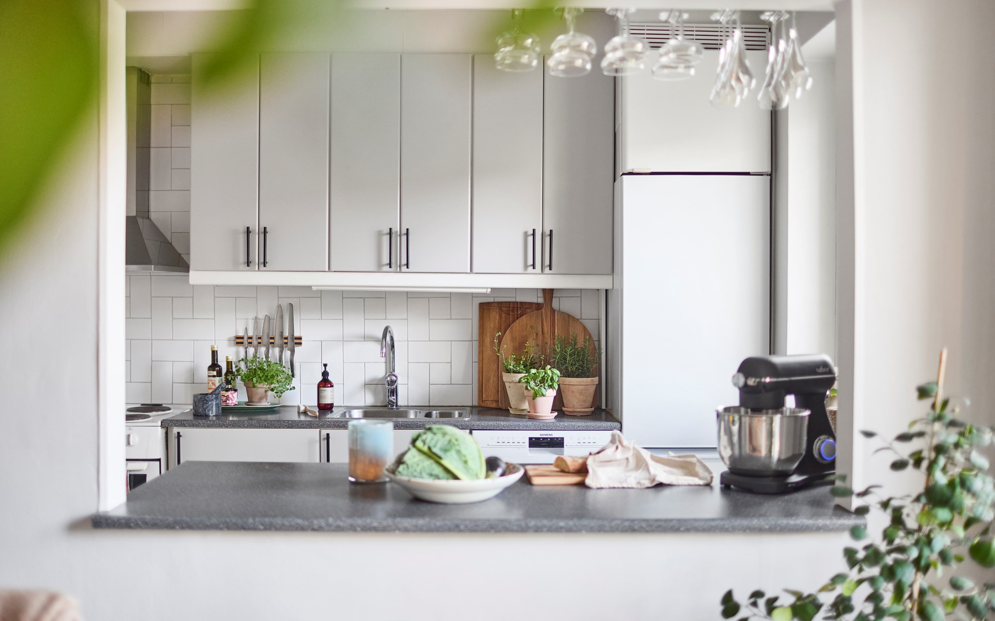 Köket som kommer från IKEA är utrustat med följande vitvaror: Spis med häll och ugn, spisfläkt, diskmaskin samt kyl/frys.