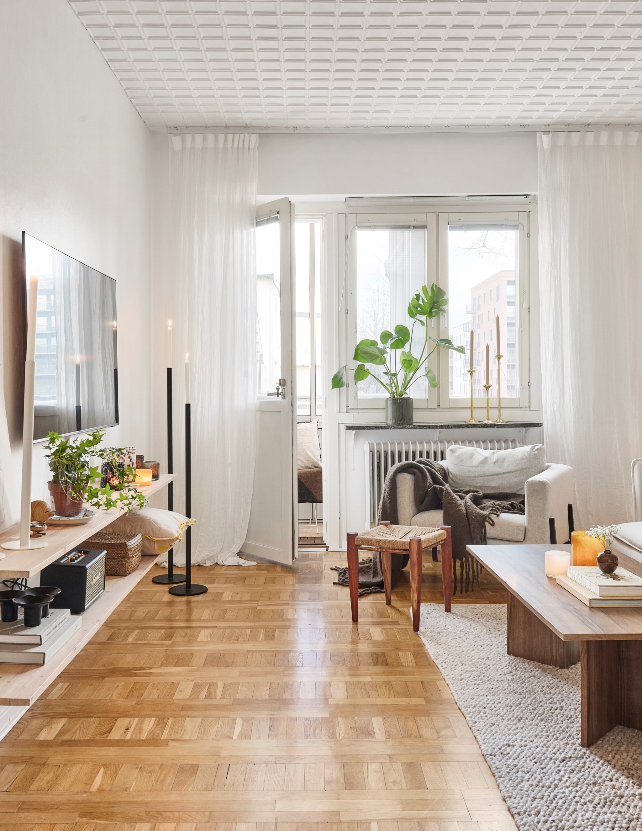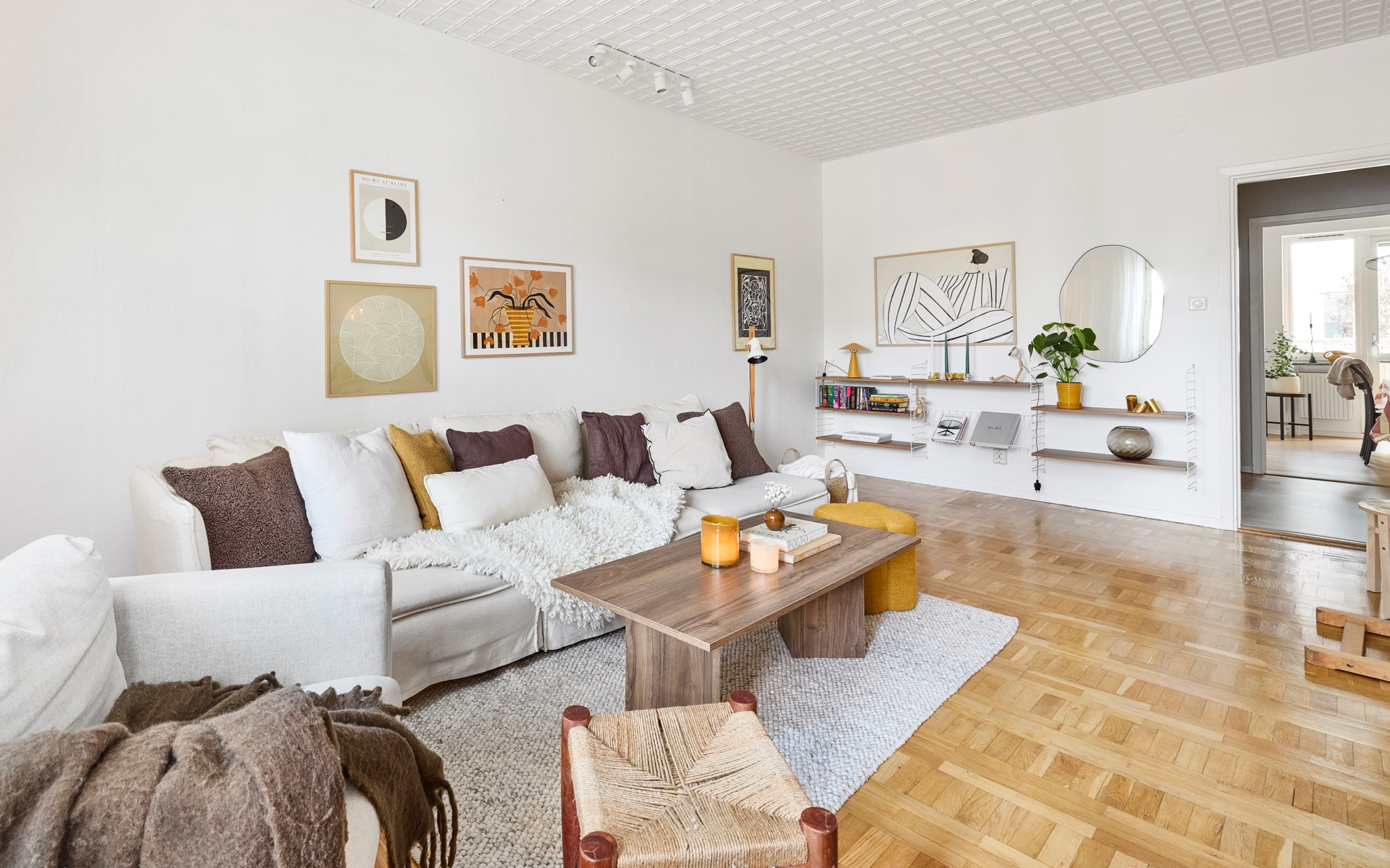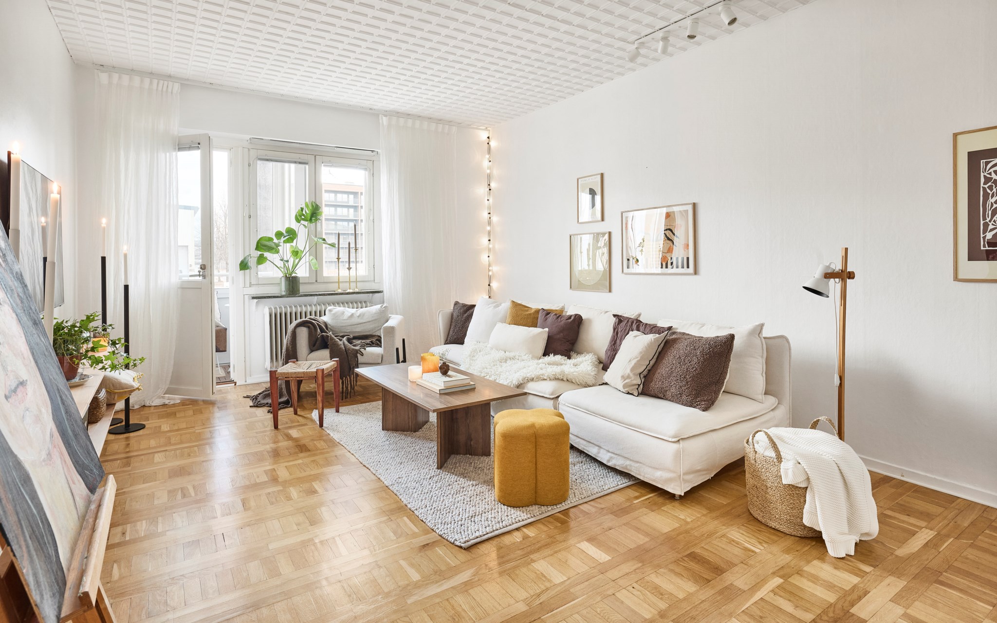 Se till att lämna så mycket golvyta fri som möjligt här för att kunna njuta av det vackra golvet till vardags. Golvet ligger i så kallat stegförband som blandar ekmönstret på längden och bredden i ett fint tempo över hela ytan. Golvet original sedan huset byggdes och med lagom fin patina med lätt knirr här och där. Kvistfritt såklart, det blir lugnast för ögat så. Original är alltid rätt bevara. Har du ögonen med dig, ser du att den fina stenbänken i fönstret är original även här, vilket inte är självklart efter ett fönsterbyte. Här i 86:an har både förening och tidigare ägare förnyat med varsam hand, vilket alltid är bäst på sikt – ekonomiskt och estetiskt.
