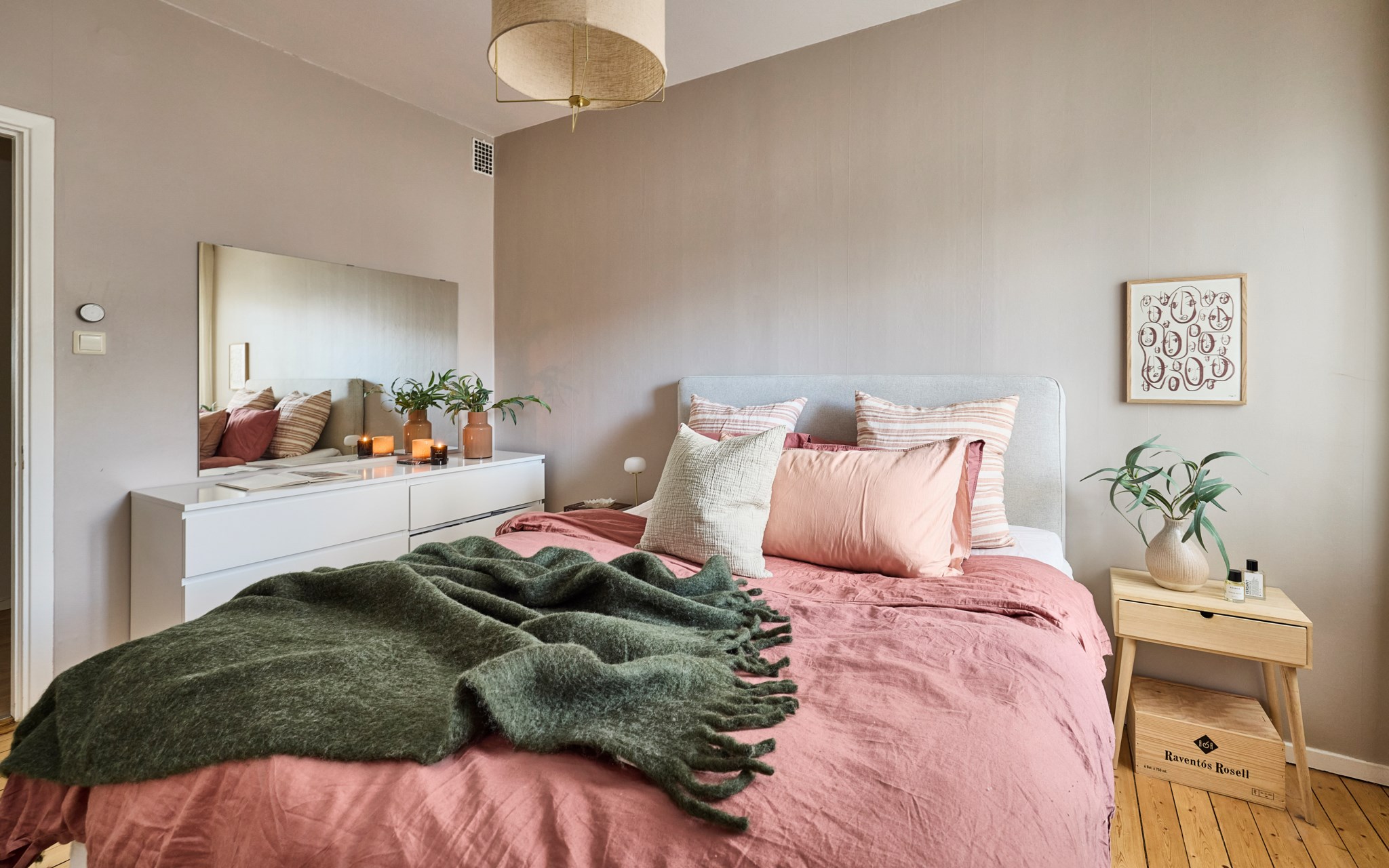 Även sovrummet är stort med gott om plats att svänga runt fotänden, och gott om plats om du vill möblera med något som tar lite större plats. Nuvarande ägare brukar ha ett skrivbord här inne vilket inte är något problem, om du vill och har möjlighet att jobba hemifrån. På golvet har ett fint plankgolv kommit i dagen, som är original, men som aldrig var tänkt att ligga fritt som nu. Det har legat dolt under ett antal korkmattor under många, år men andas nu fritt och vackert även det. Plats för garderober om du vill, men du missade väl inte klädkammaren precis ute i hallen.