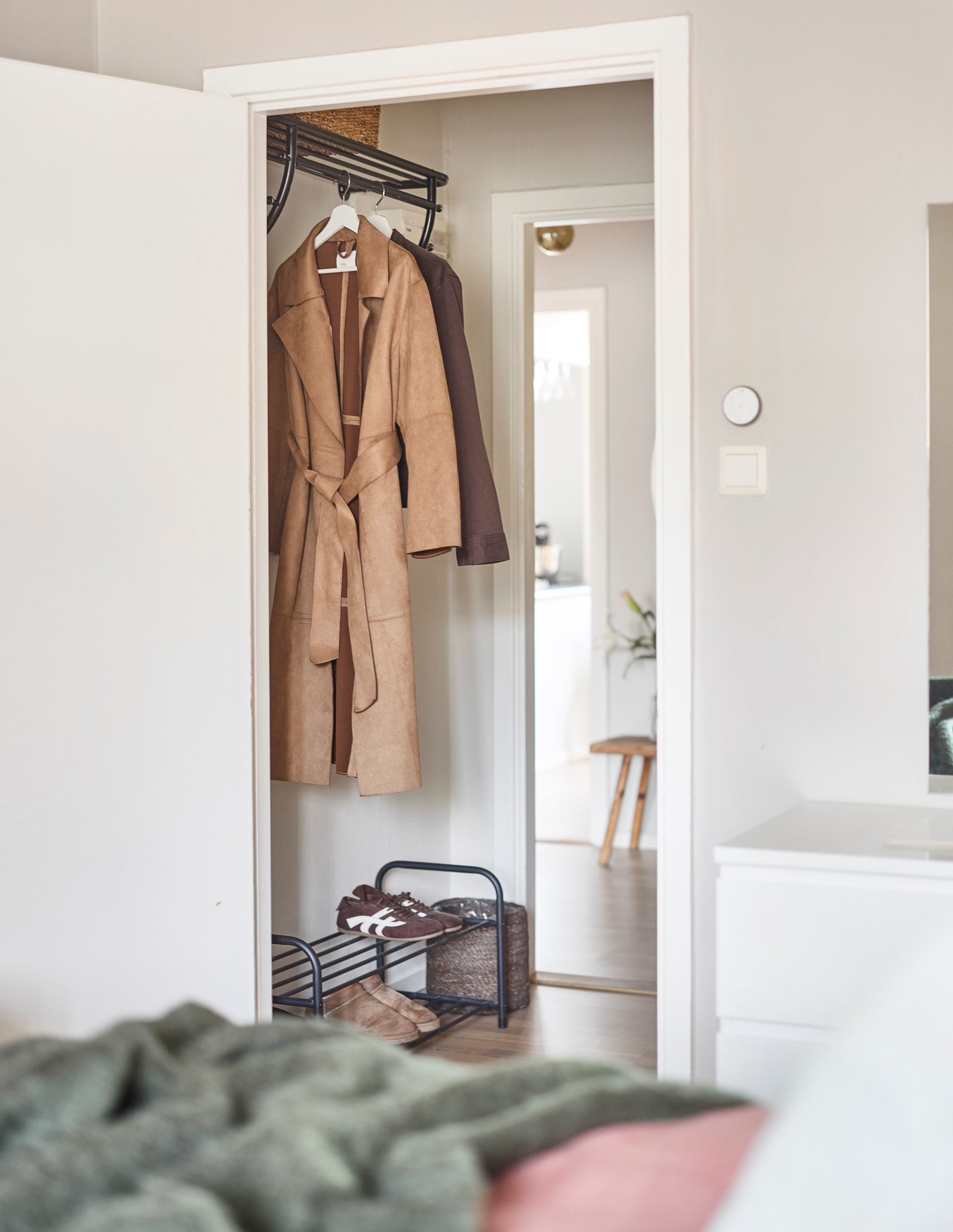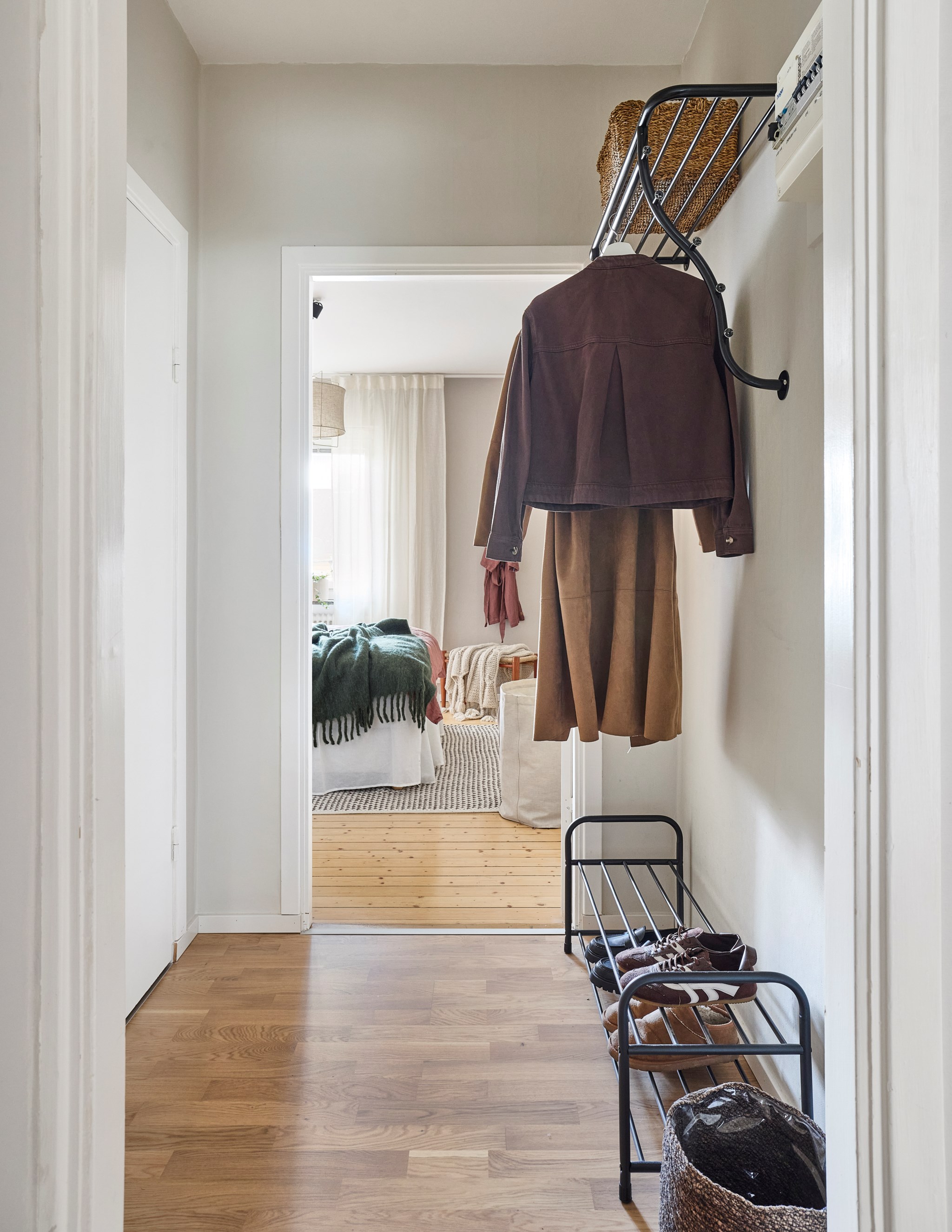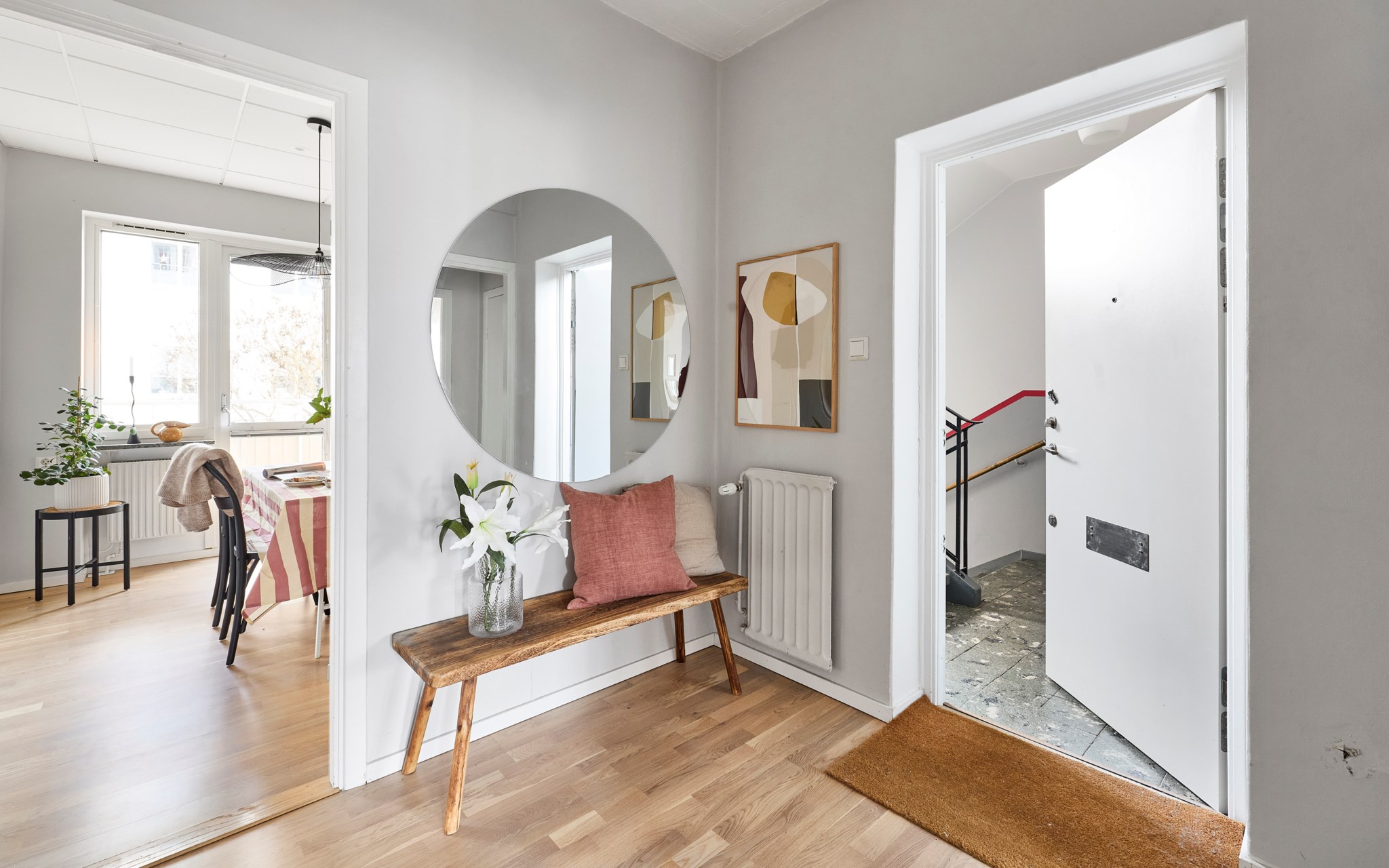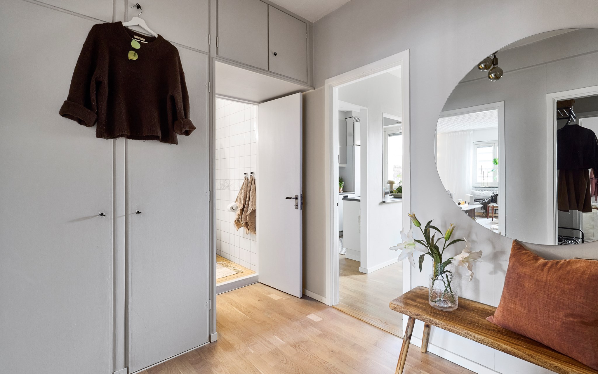 Här har du både en vanlig hall och ett smärre kapprum till vänster som gör att du slipper ha skor och jackor mitt i synfältet till vardags. Två garderober och ännu fler överskåp, plus en klädkammare gör att du trollar bort en hel del hårt och mjukt. Därför inga problem att få plats med en liten bänk för både korta och långa ben innanför dörren. Elementet perfekt för två par våta vantar. Redan här i hallen blir du varse att lägenheten har fönster i både öster och väster. Så här på vintern letar sig solljuset djupare in i lägenheten. På golvet en nyare ljus ekparkett som fortsätter in till kök och matplats.