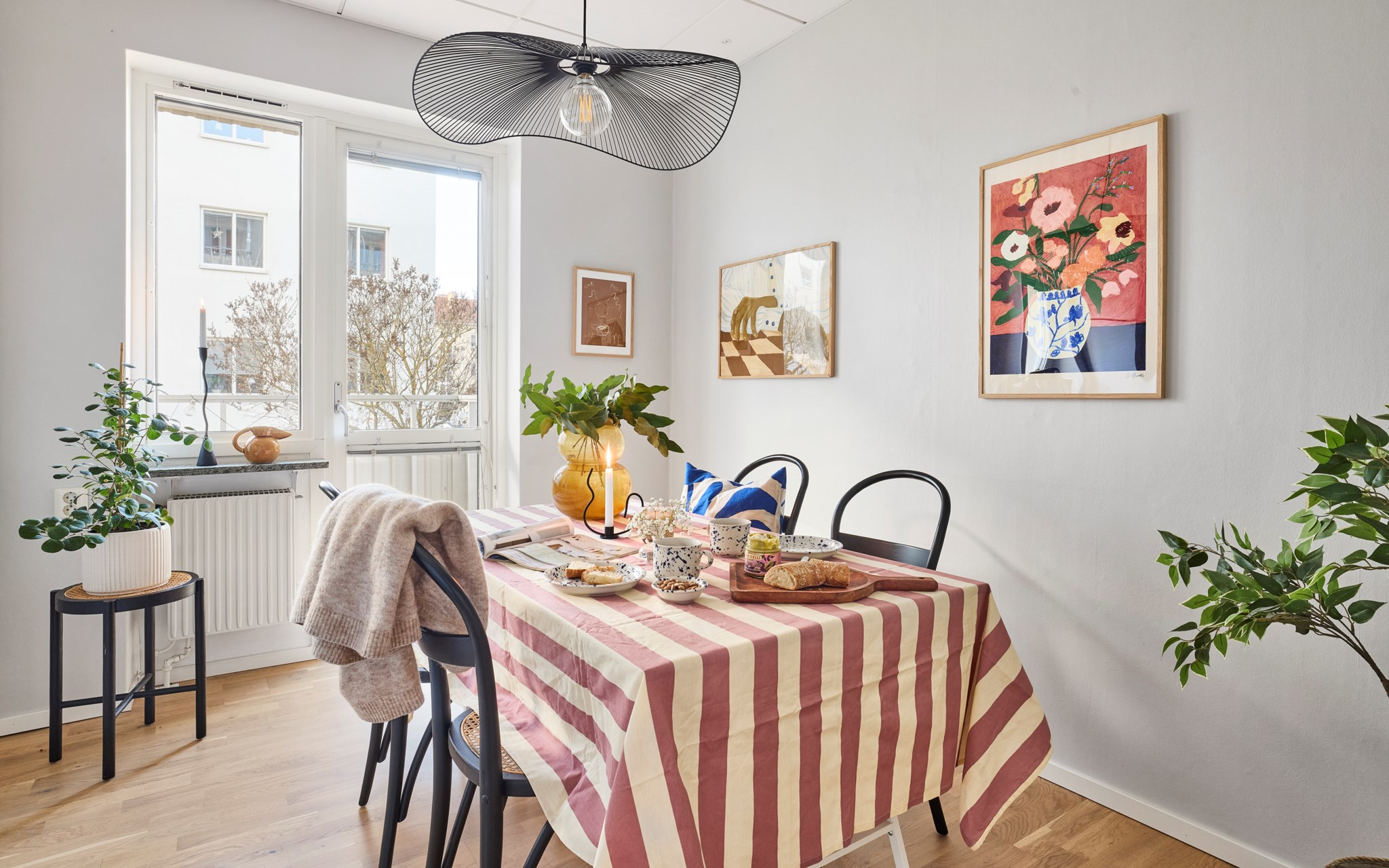 Köket ihop med matplatsen blir väldigt socialt, här umgås vi ofta med vänner. Extra härligt under sommarhalvåret med balkongen precis intill.