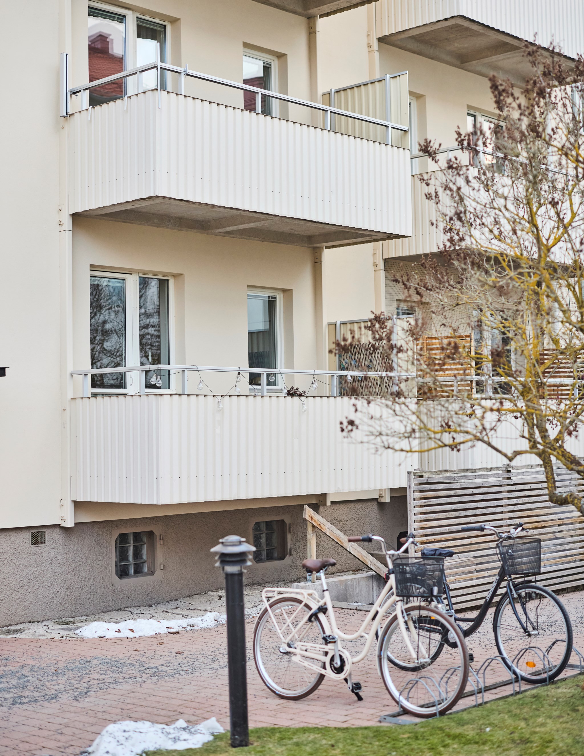Lägenheten har en inglasad balkong i öster med förmiddagssol samt en större balkong i väster med eftermiddagssol.
