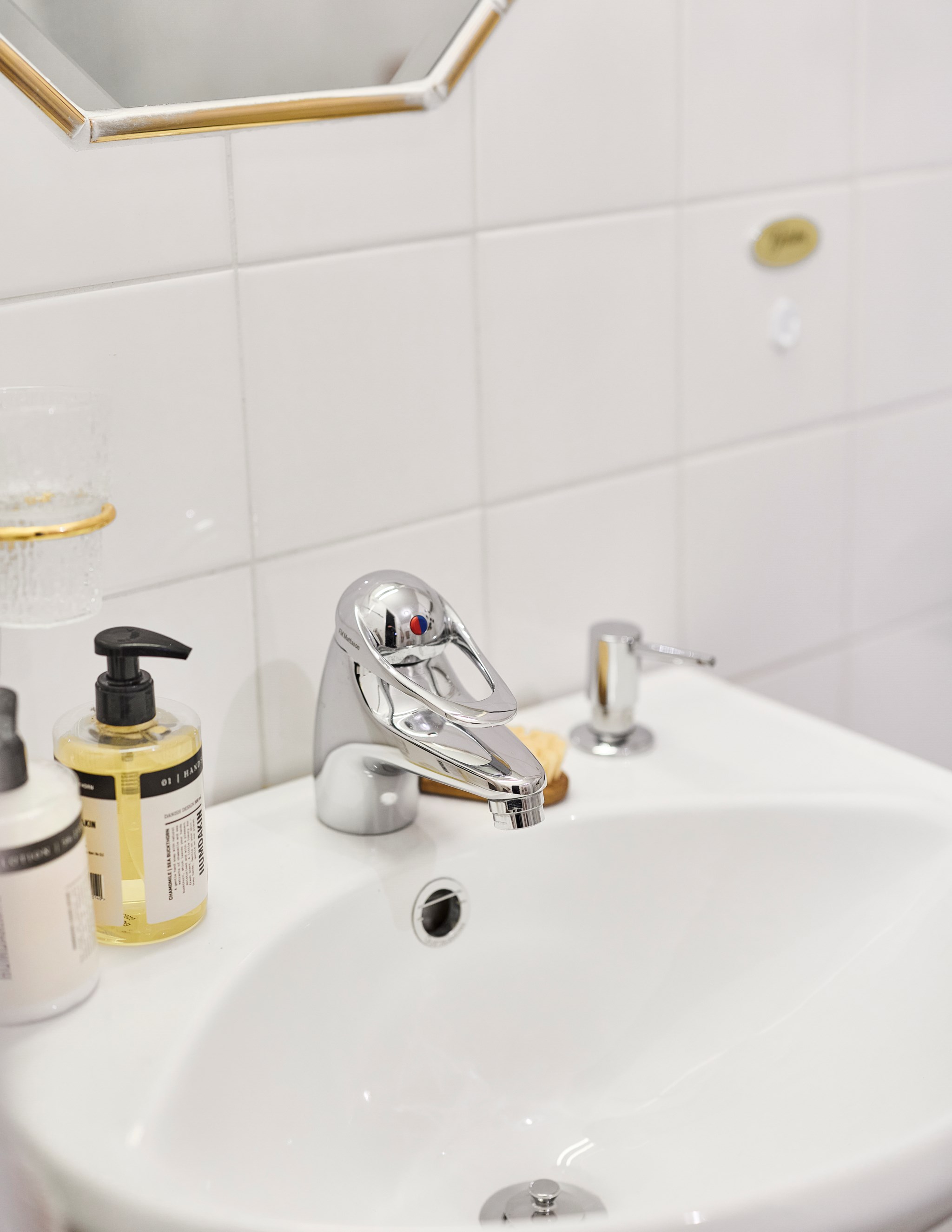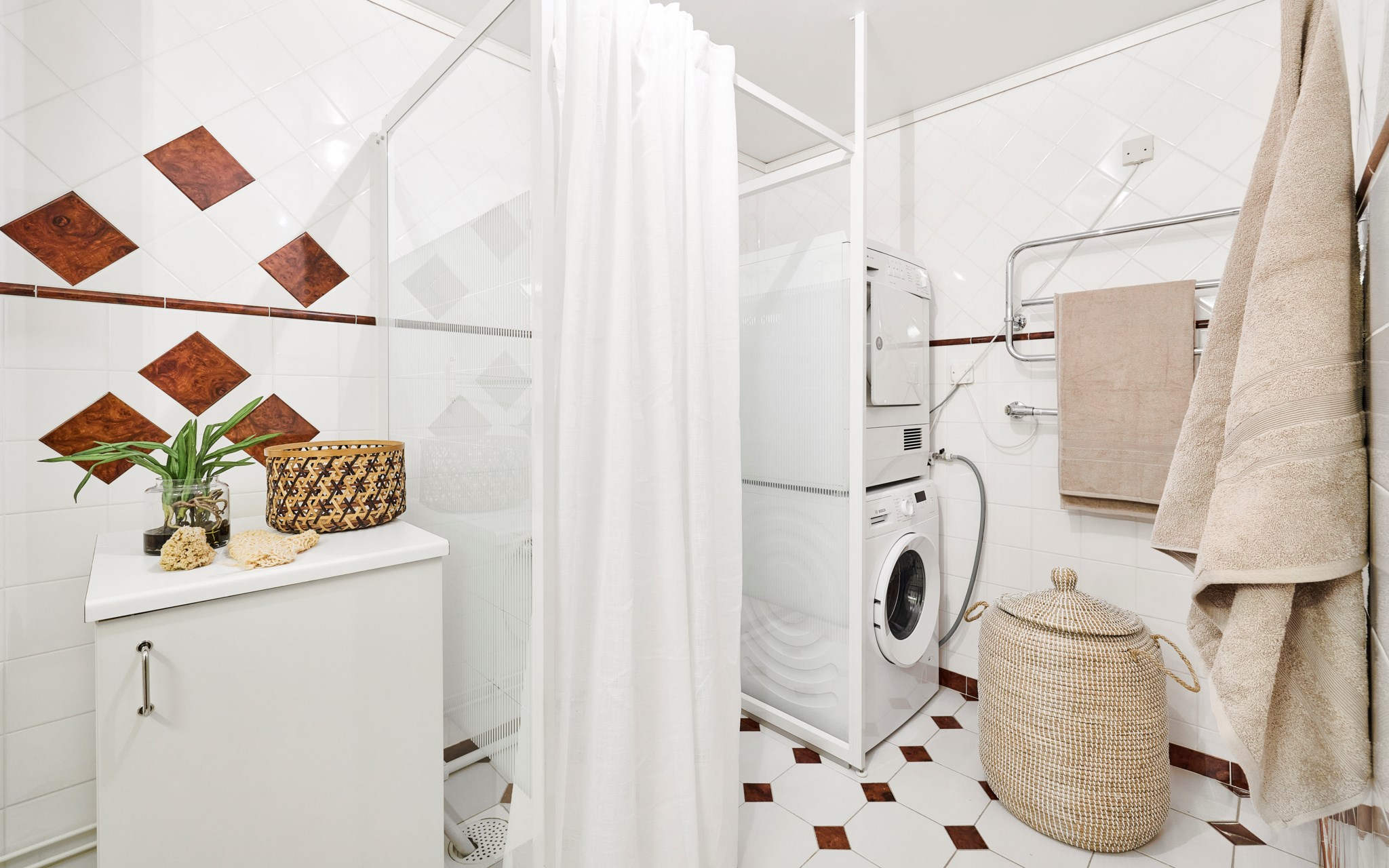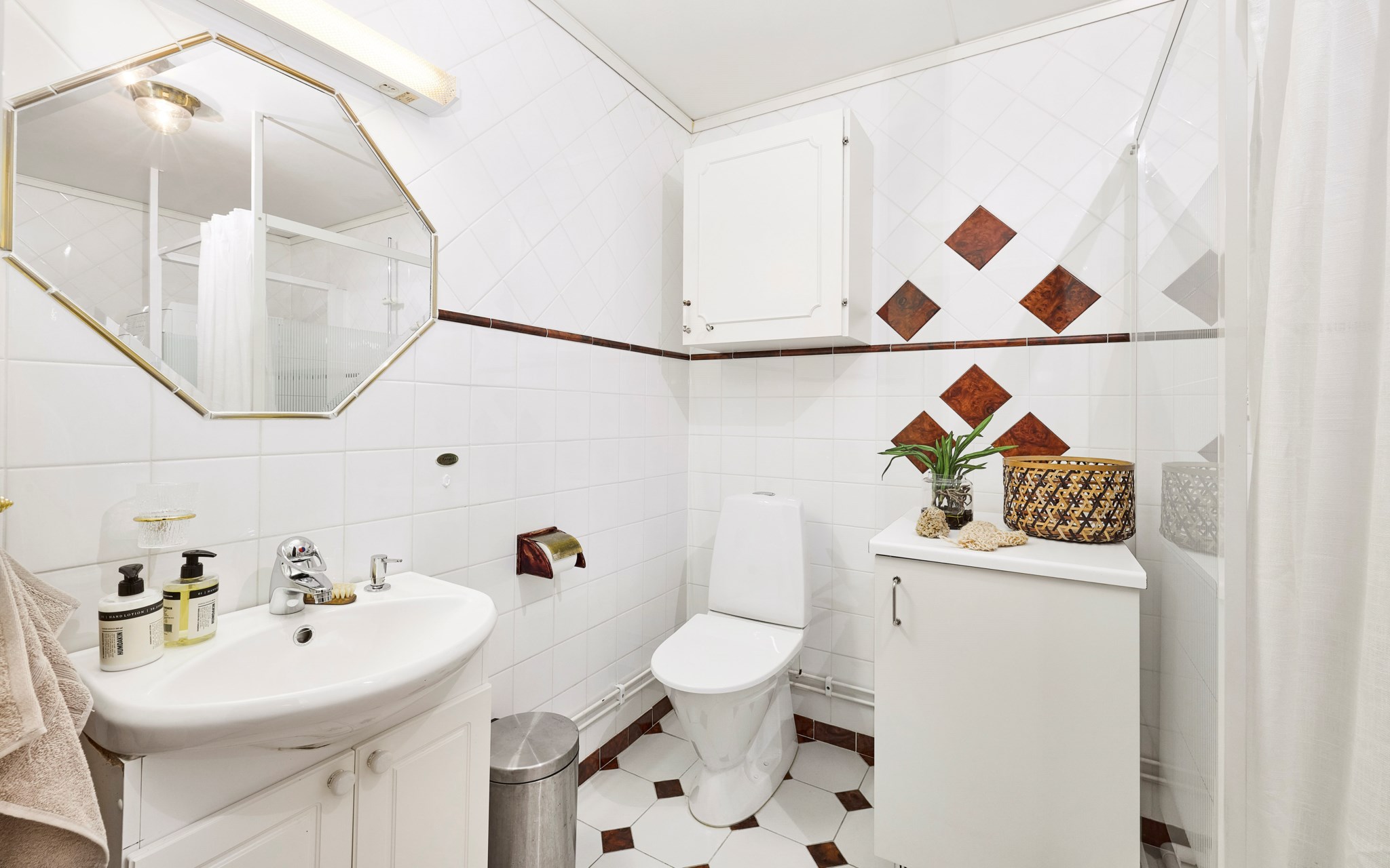 Badrummet renoverades för några år sedan och känns fortfarande fräscht och ordentligt gjort. Här inne finns gott om plats, med både dusch och en smidig tvättdel utan att rummet upplevs trångt. Många blir faktiskt lite förvånade över hur mycket badrummet rymmer när man väl kliver in – ett riktigt bra och funktionellt rum för hela vardagen.