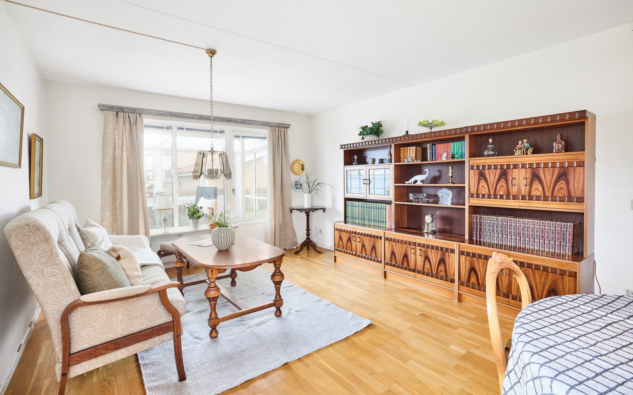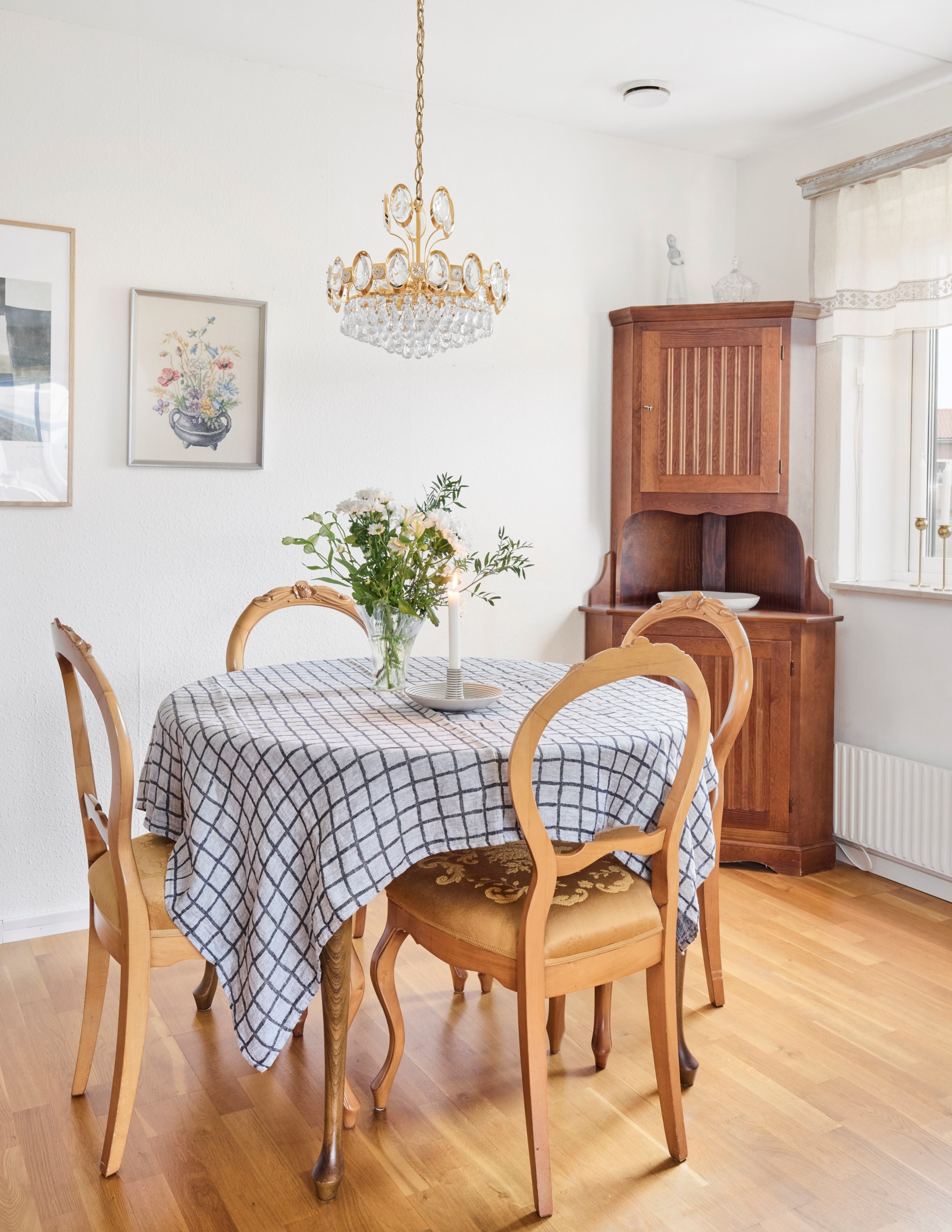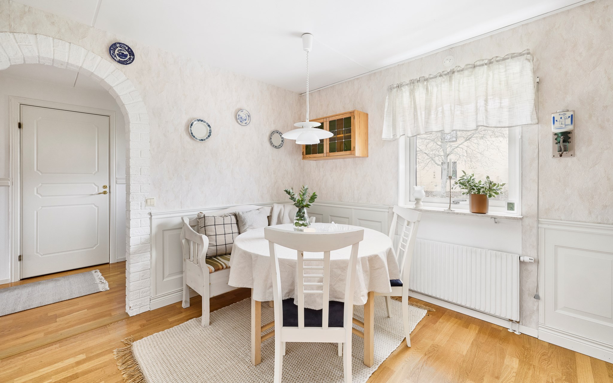 Köket dyker upp direkt till vänster från hallen, med utsikten mot öppen och stillsam grönska. Här möts du av ett äldre men fräscht kök där inredningen har stått sig väl genom åren, samtidigt som vitvarorna är nyare och ger den där lilla moderna skjutsen i vardagen. Det naturfärgade ekparkettgolvet värmer upp hela känslan och gör det lätt att trivas här. Utanför köksfönstret – där kvällssolen gärna dröjer sig kvar – ryms en trivsam plats för eftermiddagen.