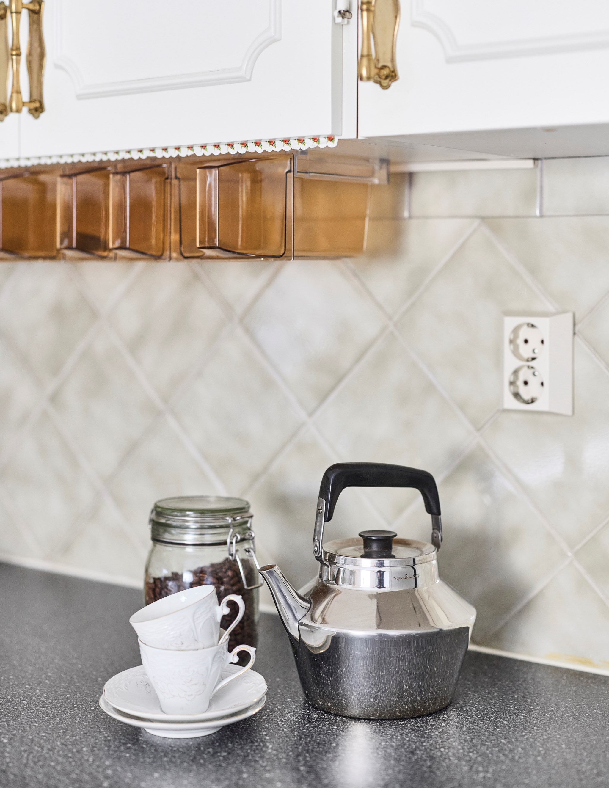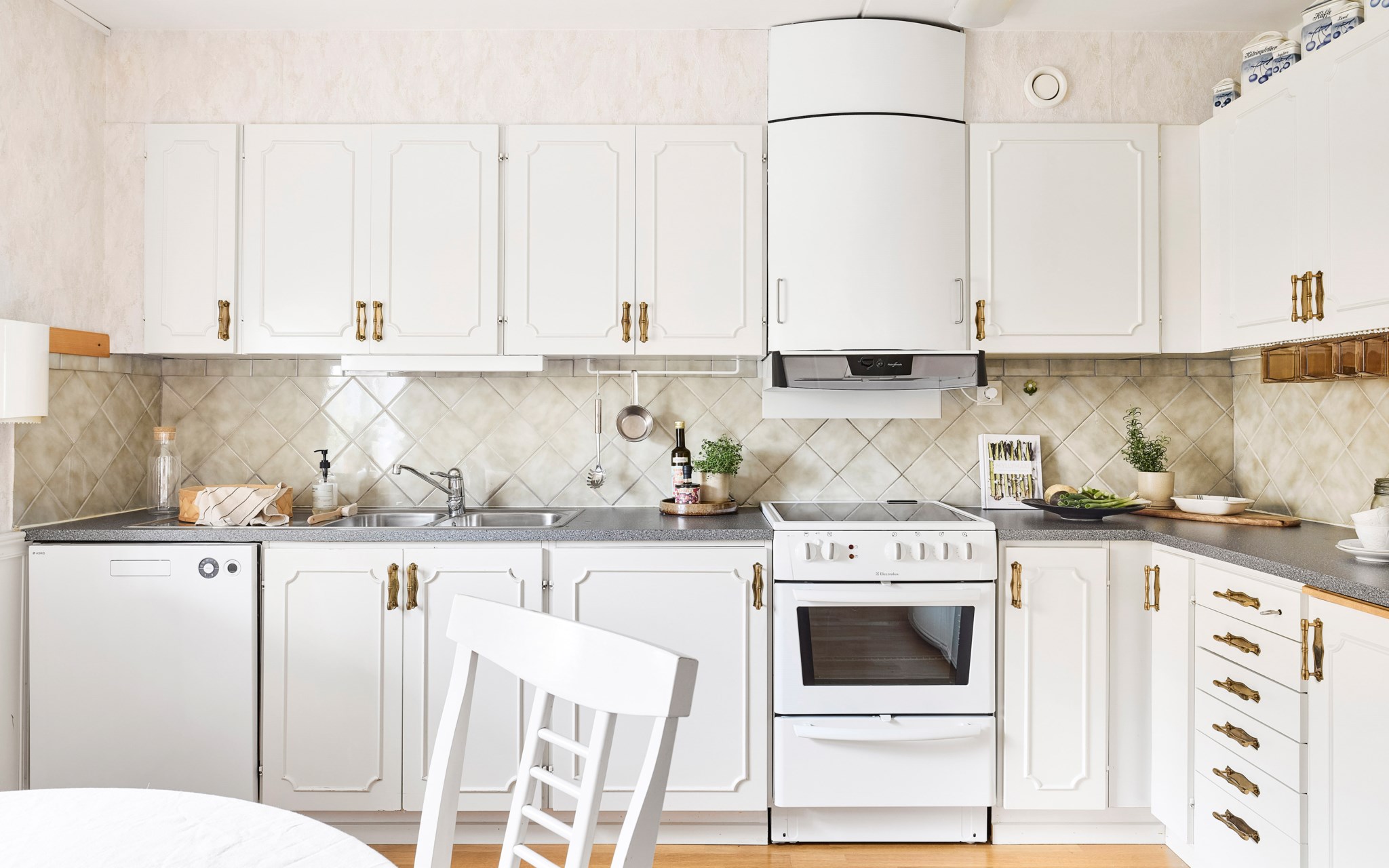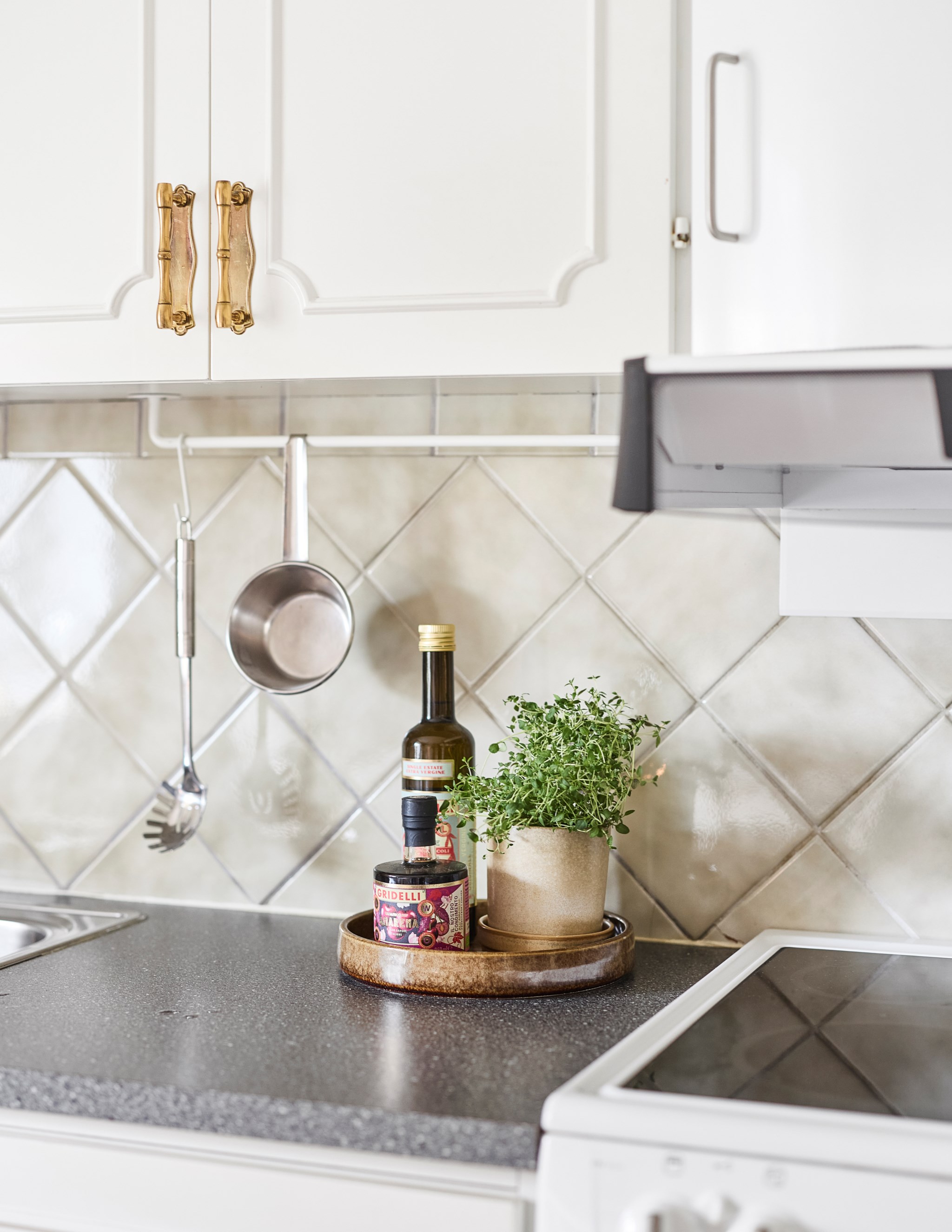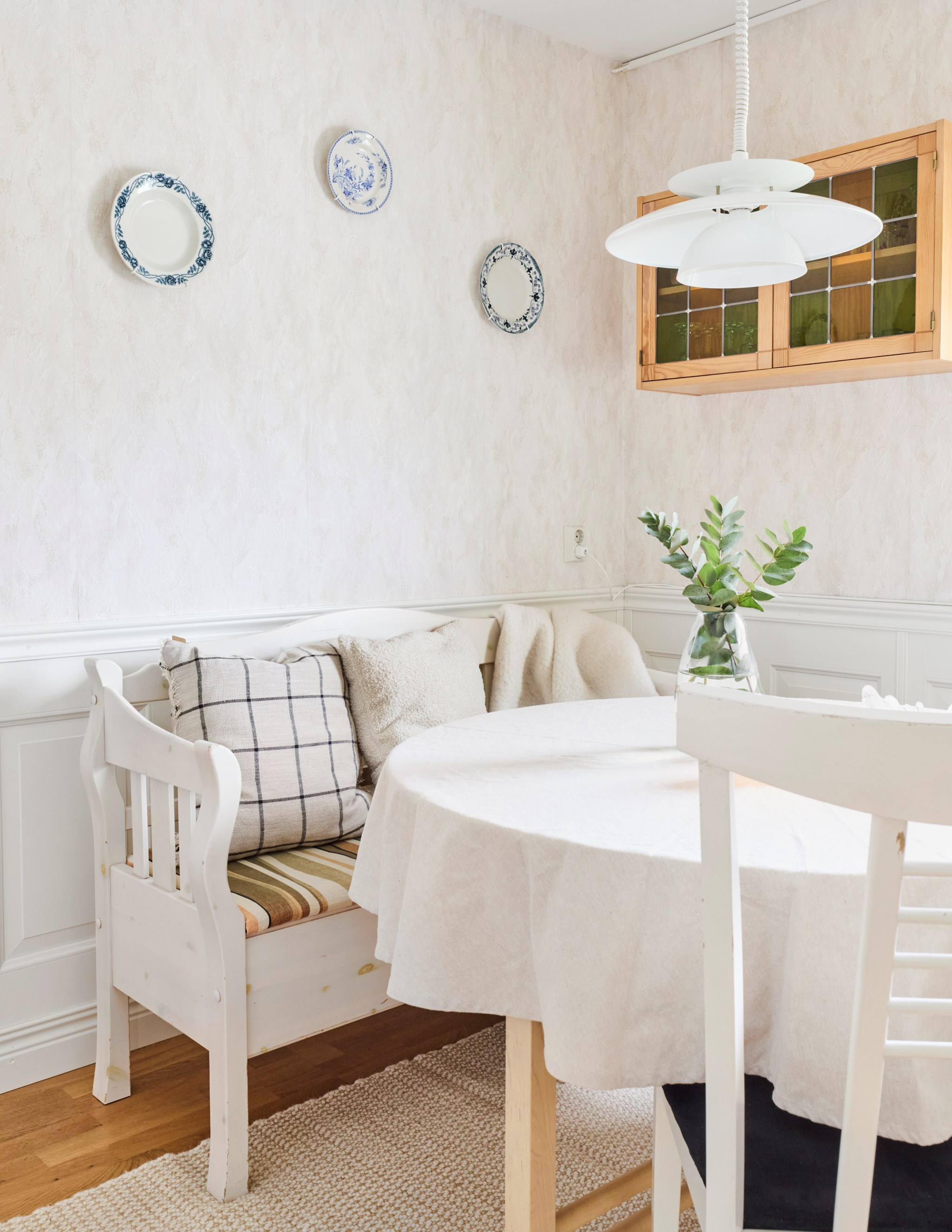Köket dyker upp direkt till vänster från hallen, med utsikten mot öppen och stillsam grönska. Här möts du av ett äldre men fräscht kök där inredningen har stått sig väl genom åren, samtidigt som vitvarorna är nyare och ger den där lilla moderna skjutsen i vardagen. Det naturfärgade ekparkettgolvet värmer upp hela känslan och gör det lätt att trivas här. Utanför köksfönstret – där kvällssolen gärna dröjer sig kvar – ryms en trivsam plats för eftermiddagen.