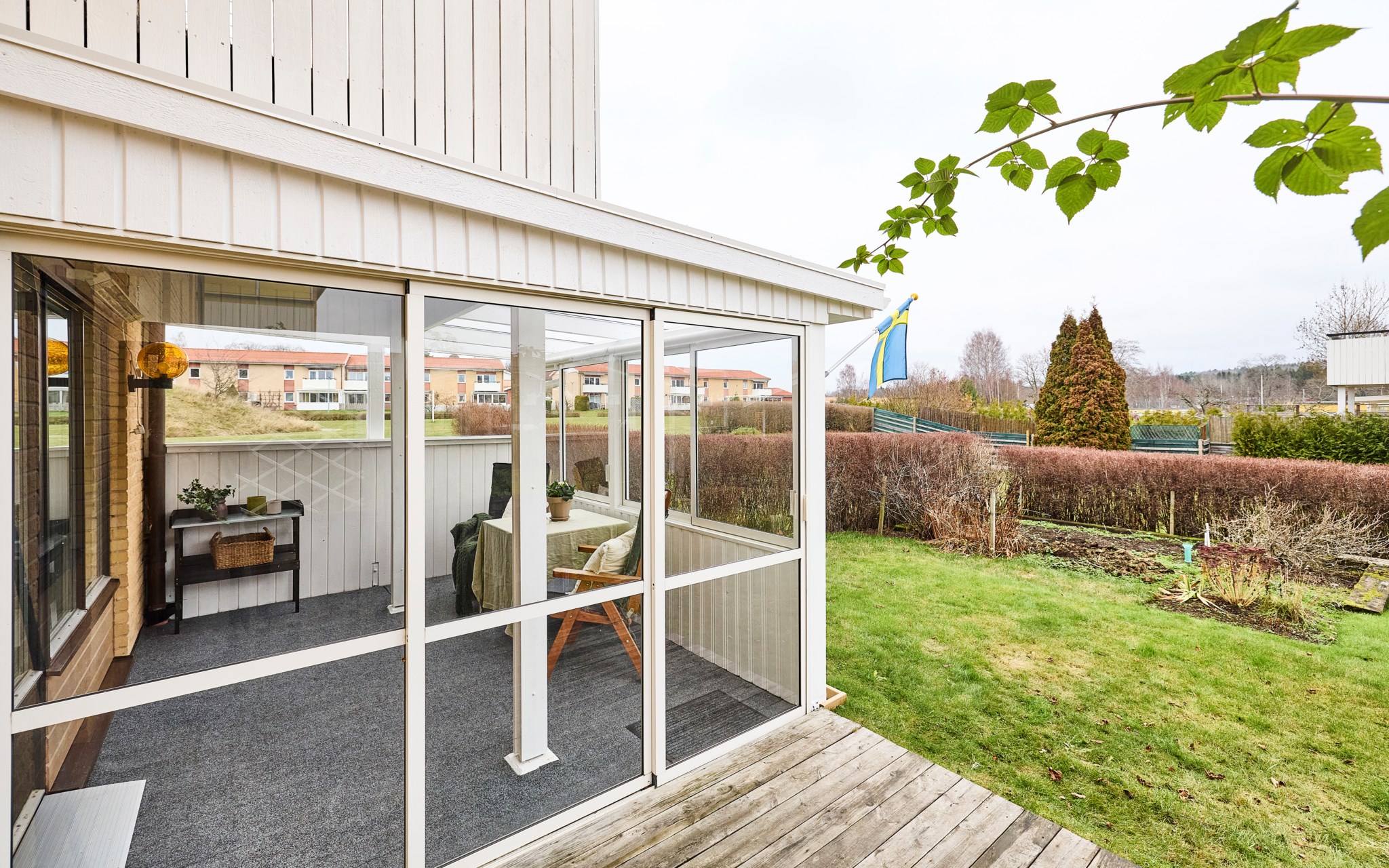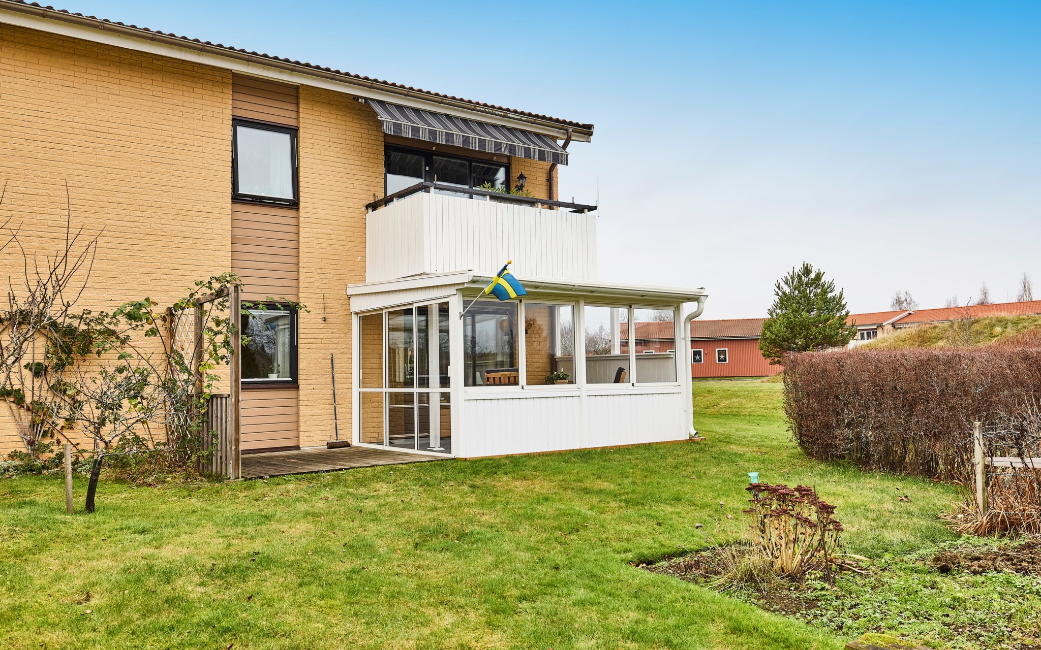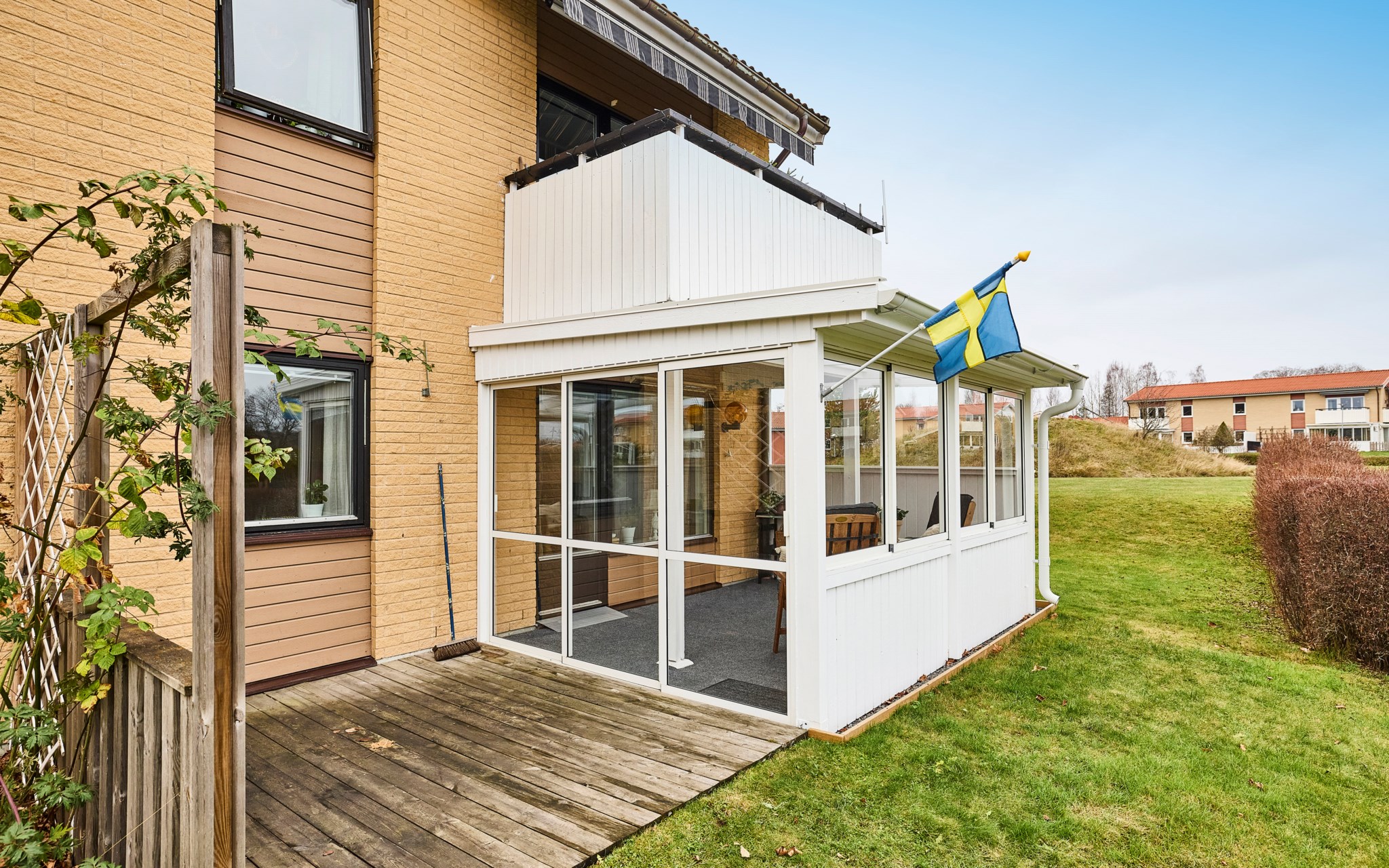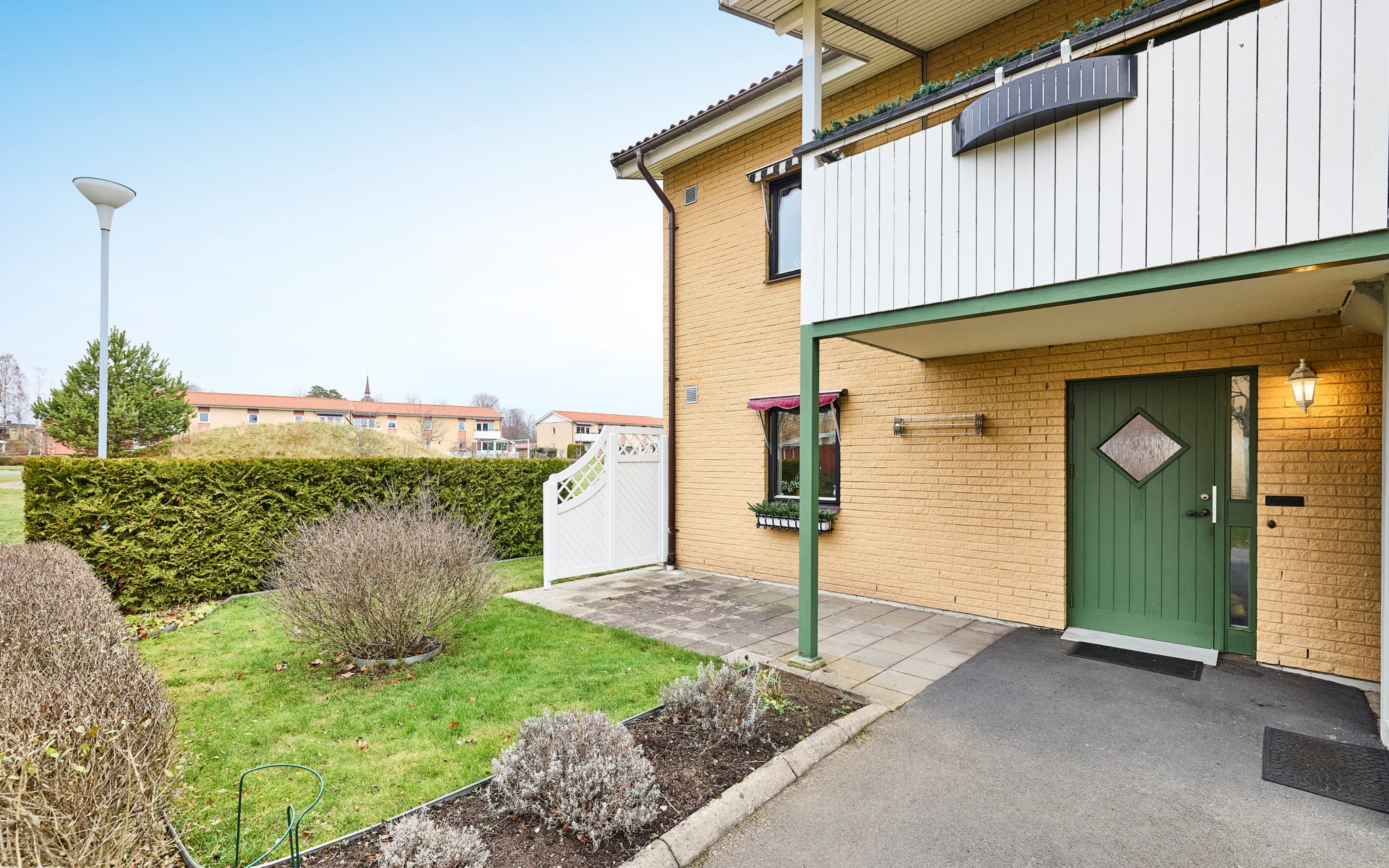 Med markplan följer en frihet som märks direkt – särskilt här, där bostaden ligger i gaveln och omges av generösa gräsytor åt flera håll. På framsidan får du kvällssolen som gärna stannar kvar, och på baksidan finns en mer avskild uteplats som blir enkel att trivas på från vår till höst. Det här är ett läge där du alltid hittar en plats för dagens olika stunder, och där grönskan runt gavlarna blir som en naturlig förlängning av hemmet.