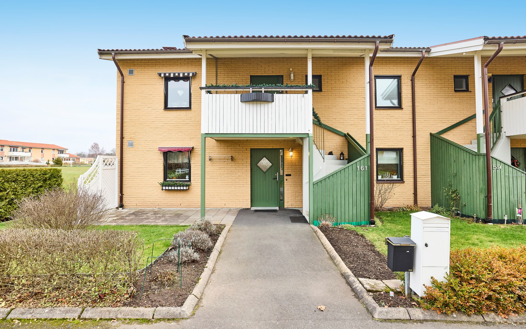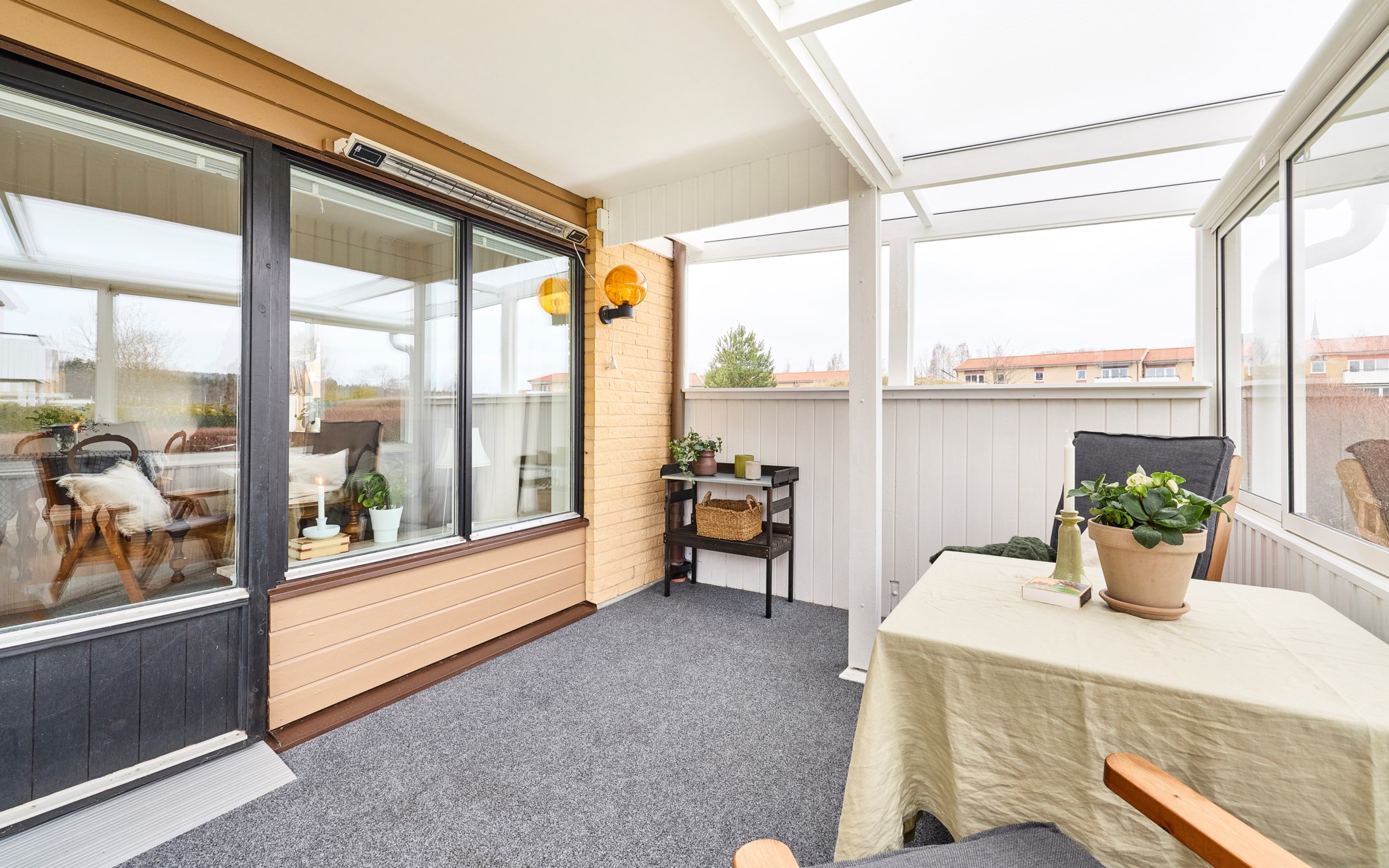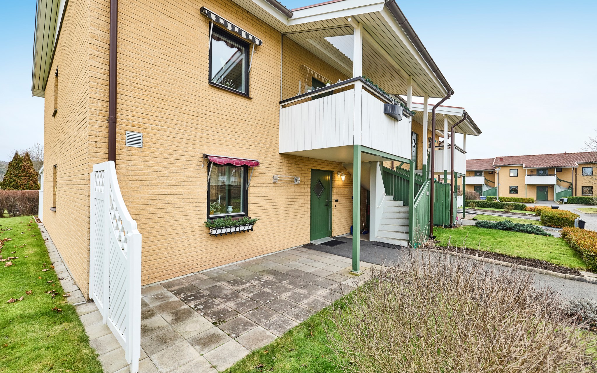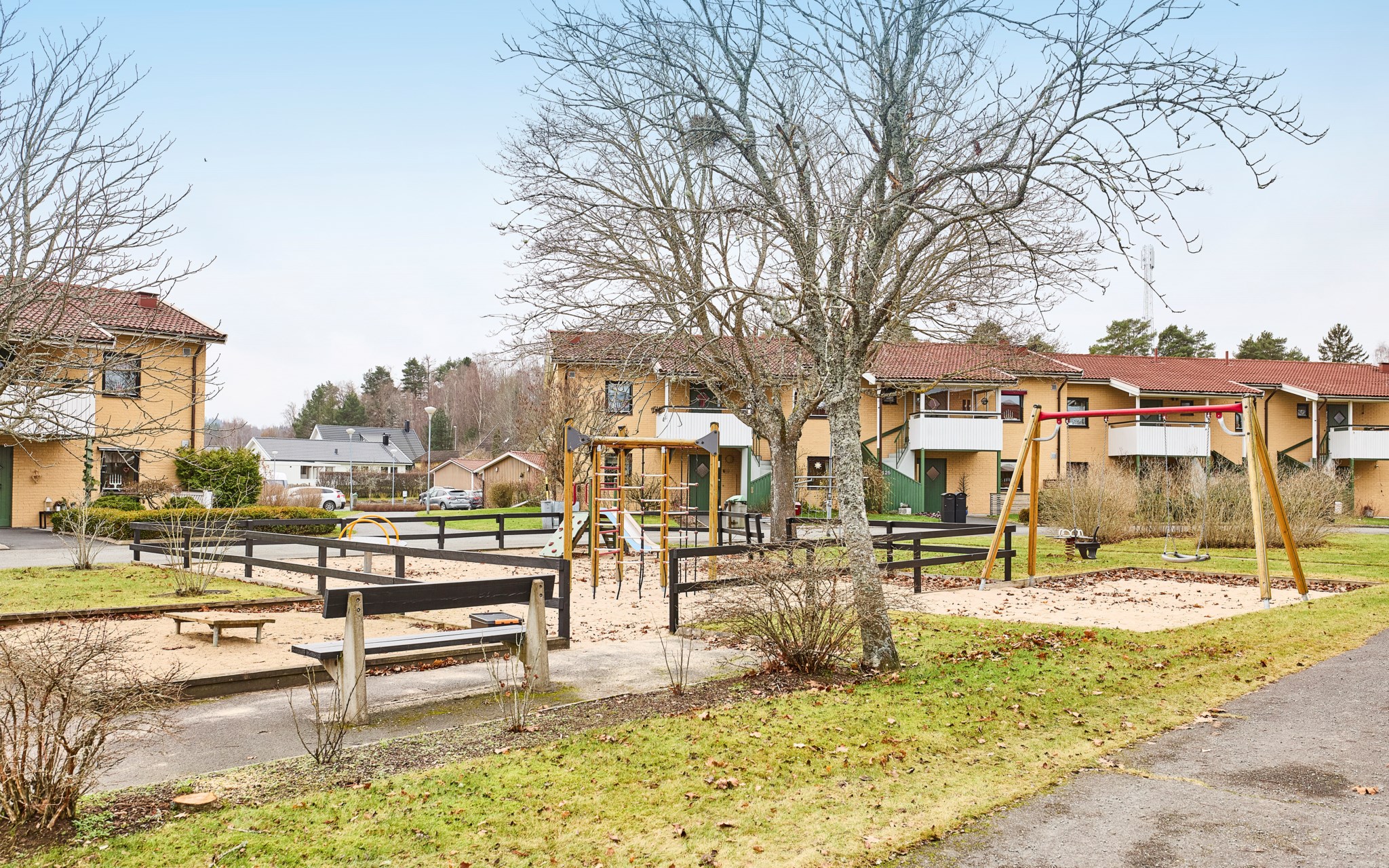 Med markplan följer en frihet som märks direkt – särskilt här, där bostaden ligger i gaveln och omges av generösa gräsytor åt flera håll. På framsidan får du kvällssolen som gärna stannar kvar, och på baksidan finns en mer avskild uteplats som blir enkel att trivas på från vår till höst. Det här är ett läge där du alltid hittar en plats för dagens olika stunder, och där grönskan runt gavlarna blir som en naturlig förlängning av hemmet.