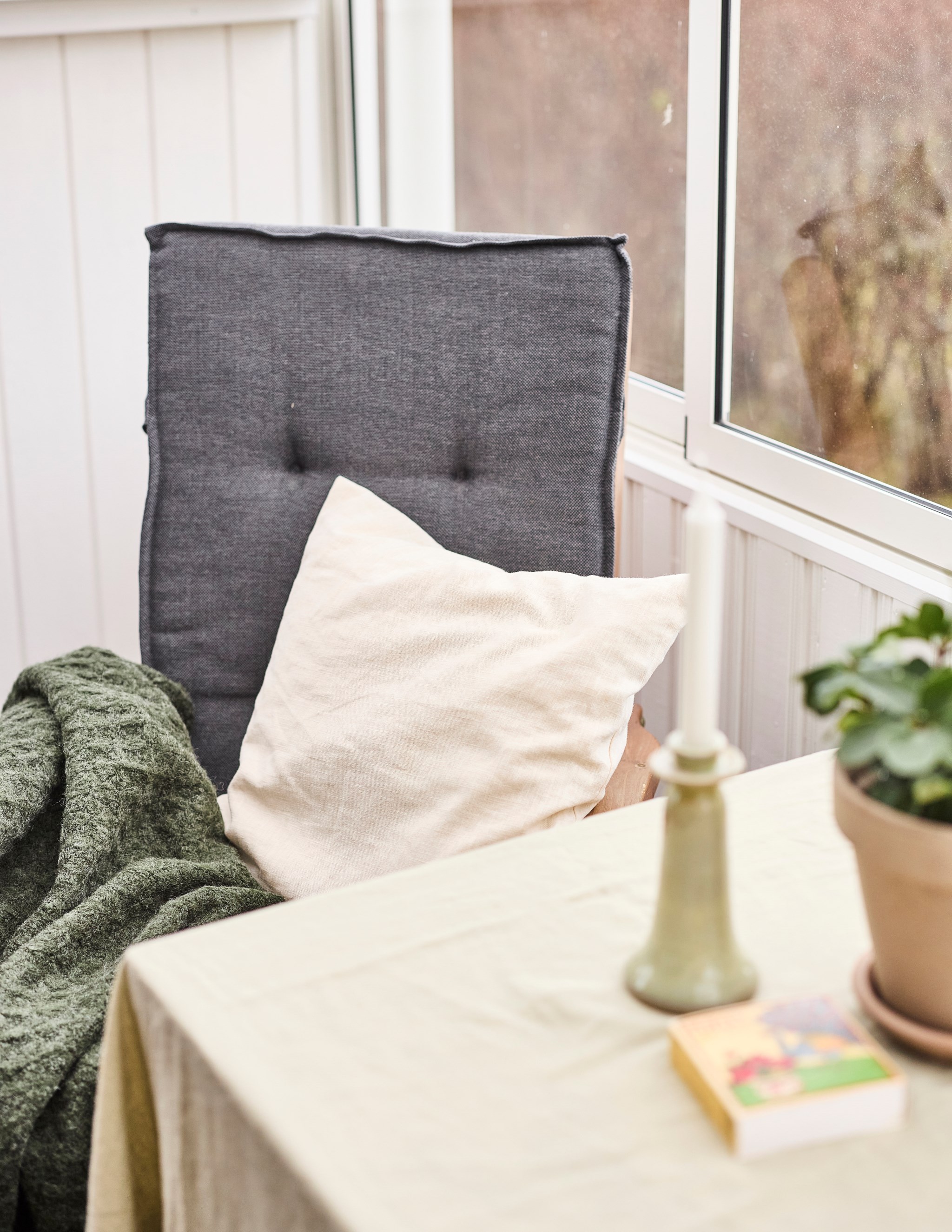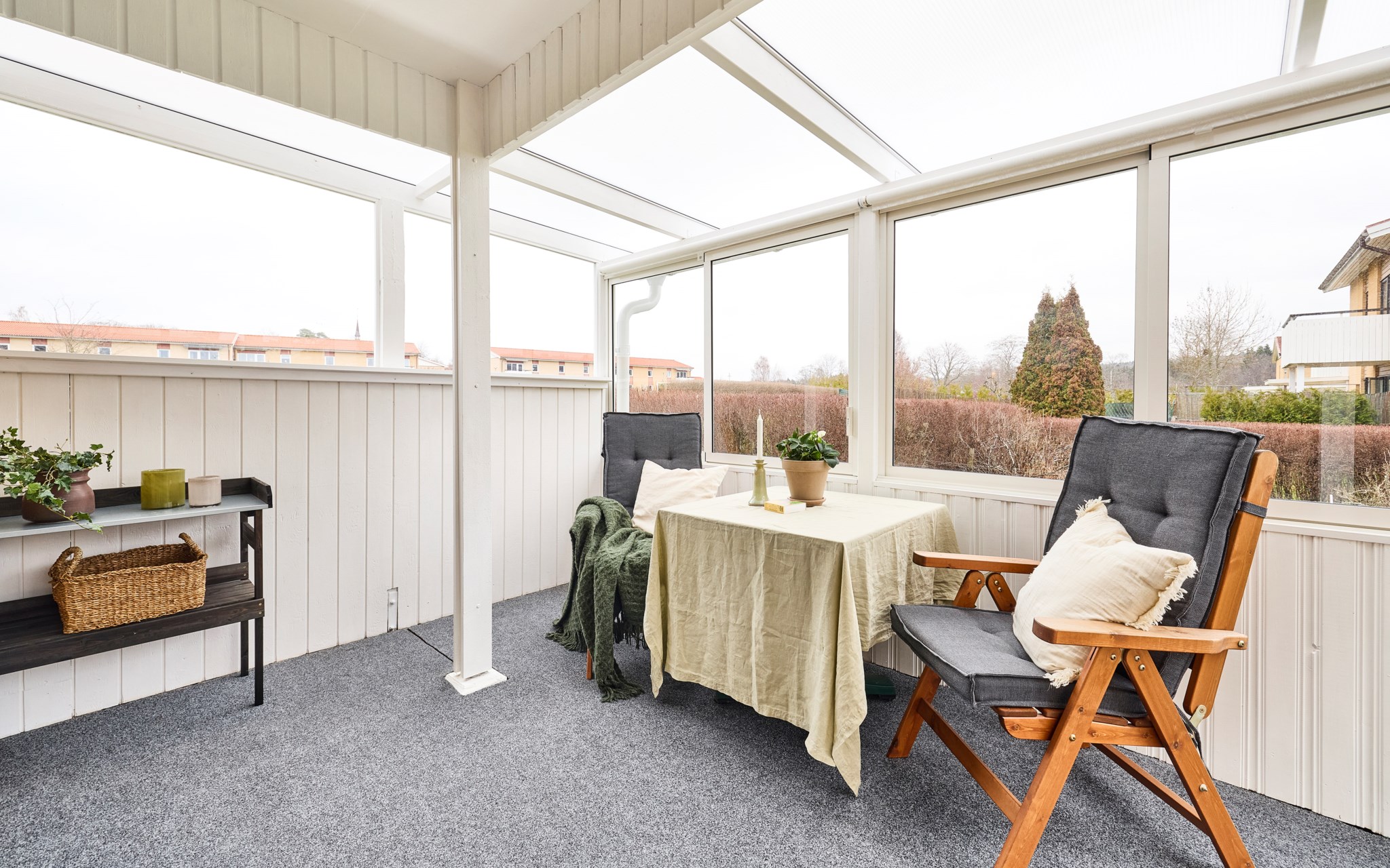 Vardagsrummet är hemmets stora andetag – luftigt, lättmöblerat och med gott om plats för både matbord och en rejäl soffgrupp. Härifrån kliver du rakt ut i uterummet, där det nyligen bytta taket gjort rummet till en självklar plats för många av dygnets timmar.