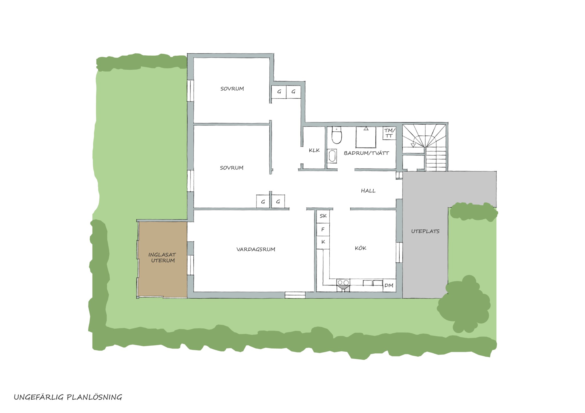 Lägenhetens placering ger en ovanlig möjlighet att nyttja grönområdet intill huset som en förlängning av bostaden. Här finns gott om utrymme för dig som vill odla, plantera eller helt enkelt njuta av känslan av egen täppa.