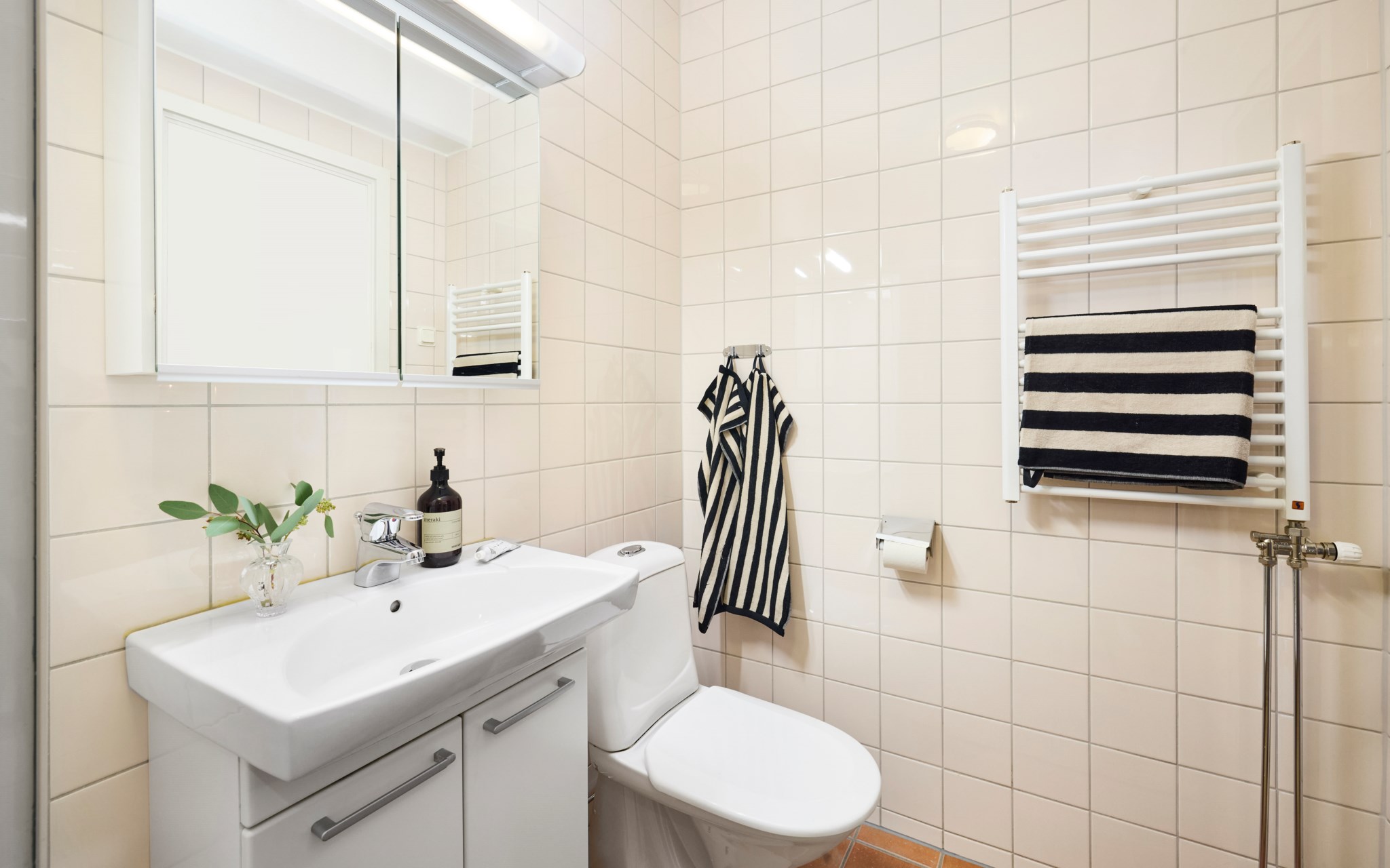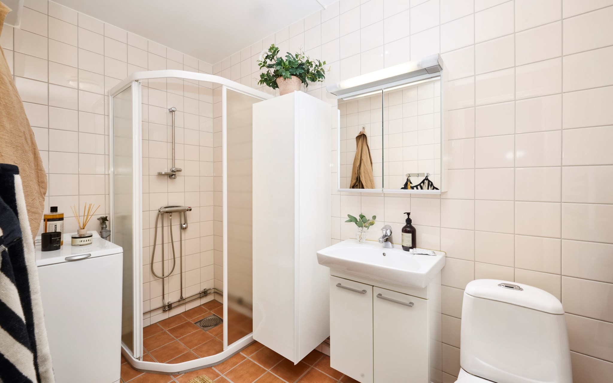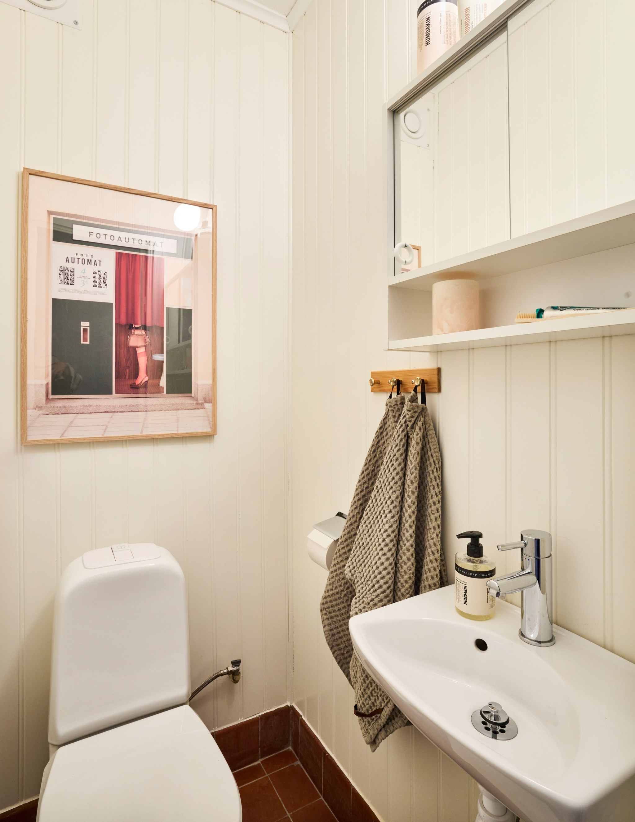 En extra lill-toalett är alltid bra, särskilt när nöden är som störst. Inte plats för några yviga rörelser, men här sitter du ju mest still. På golvet ligger faktiskt originalklinkern kvar, vilket nog inspirerade till terracotta-klinkern i det stora badrummet när det renoverades. Här finns en handdukstork och det var inte ens att drömma om på 1950-talet. Även en smärre toppmatad tvättmaskin har flyttat in. En fullstor får plats bredvid duschkabinen vilket vi kontrollmätt, men föreningen har flera mycket kompetenta tvättstugor ett knapptryck bort med hissen.
