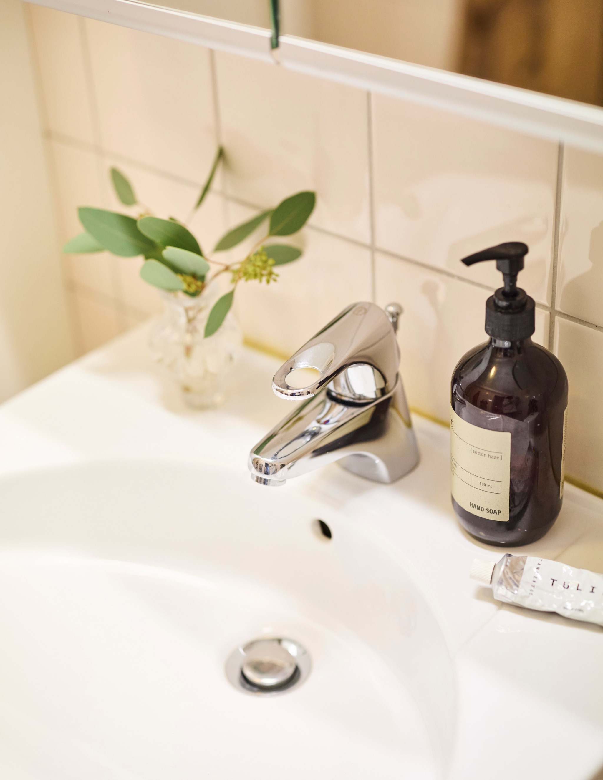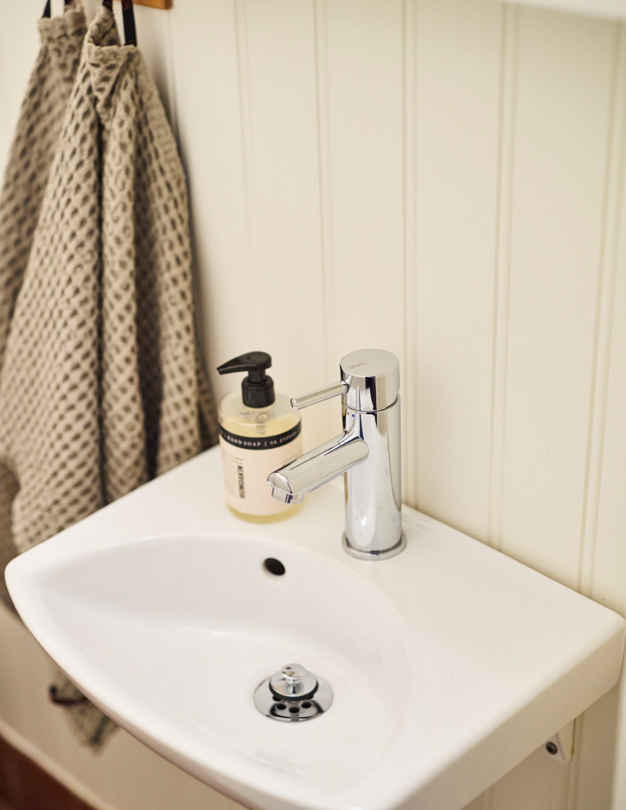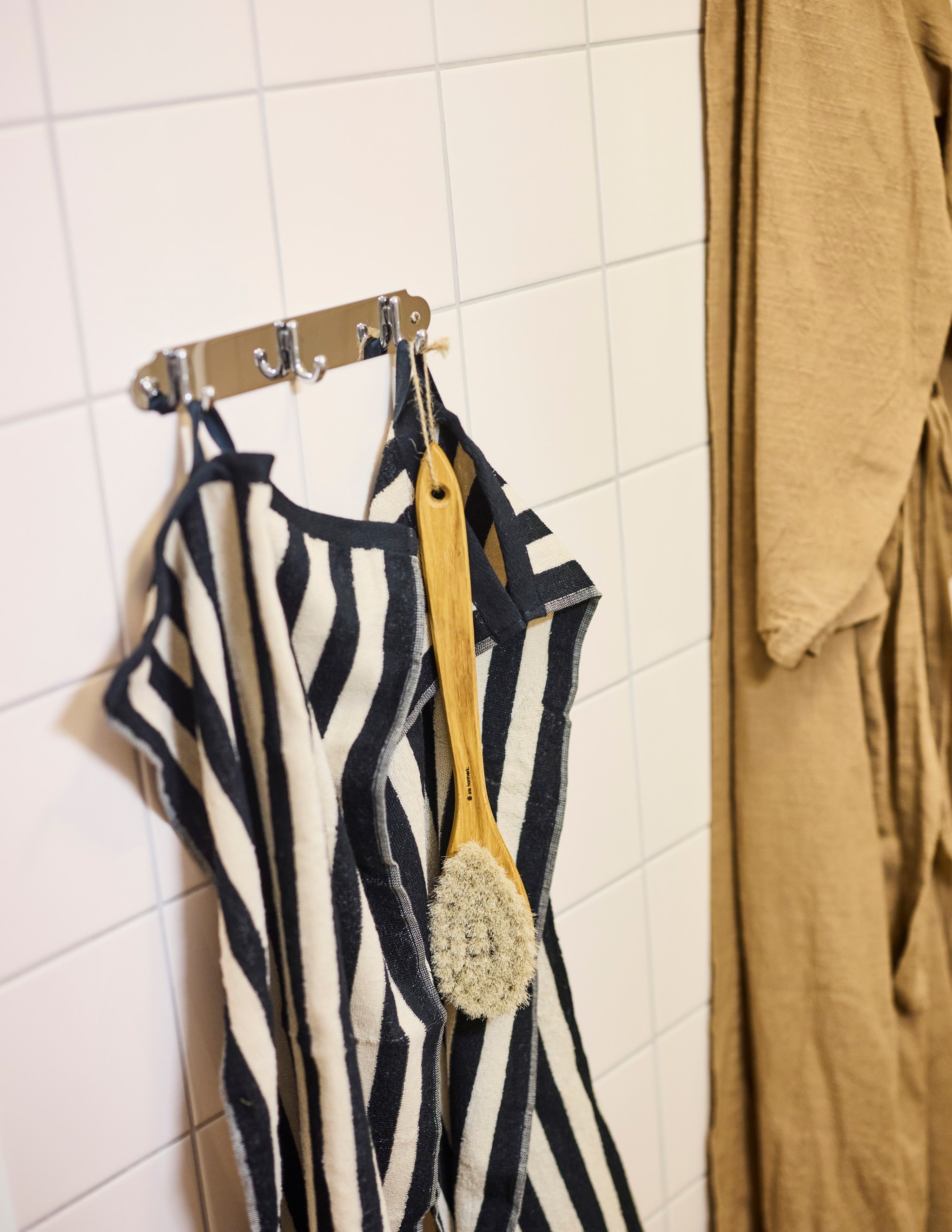 En extra lill-toalett är alltid bra, särskilt när nöden är som störst. Inte plats för några yviga rörelser, men här sitter du ju mest still. På golvet ligger faktiskt originalklinkern kvar, vilket nog inspirerade till terracotta-klinkern i det stora badrummet när det renoverades. Här finns en handdukstork och det var inte ens att drömma om på 1950-talet. Även en smärre toppmatad tvättmaskin har flyttat in. En fullstor får plats bredvid duschkabinen vilket vi kontrollmätt, men föreningen har flera mycket kompetenta tvättstugor ett knapptryck bort med hissen.